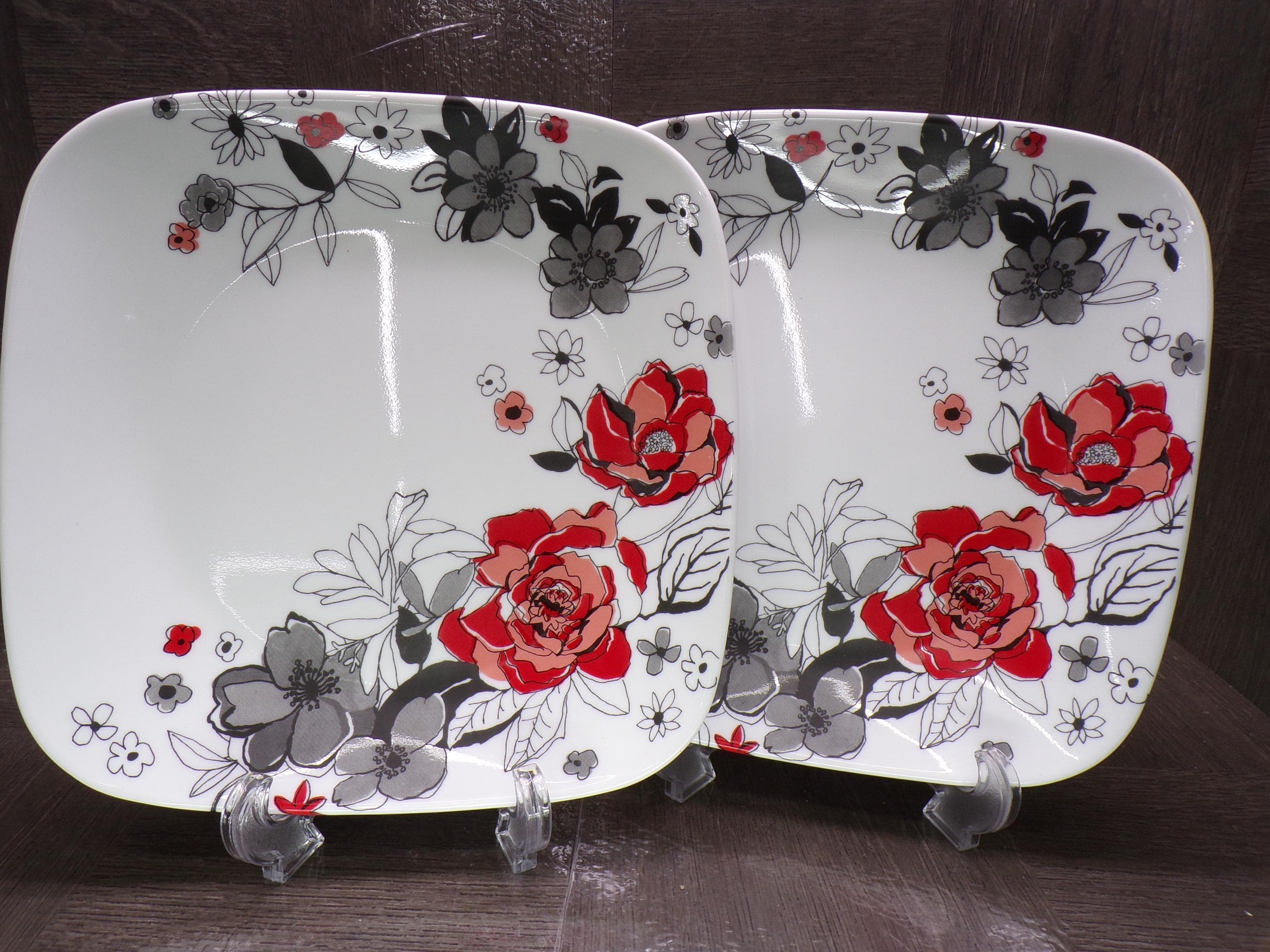 2602 Corelle Boutique Chelsea Rose 9" Square Dinner Salad / Lunch Set of 2 - Red, Black, Gray Floral - Great Condition