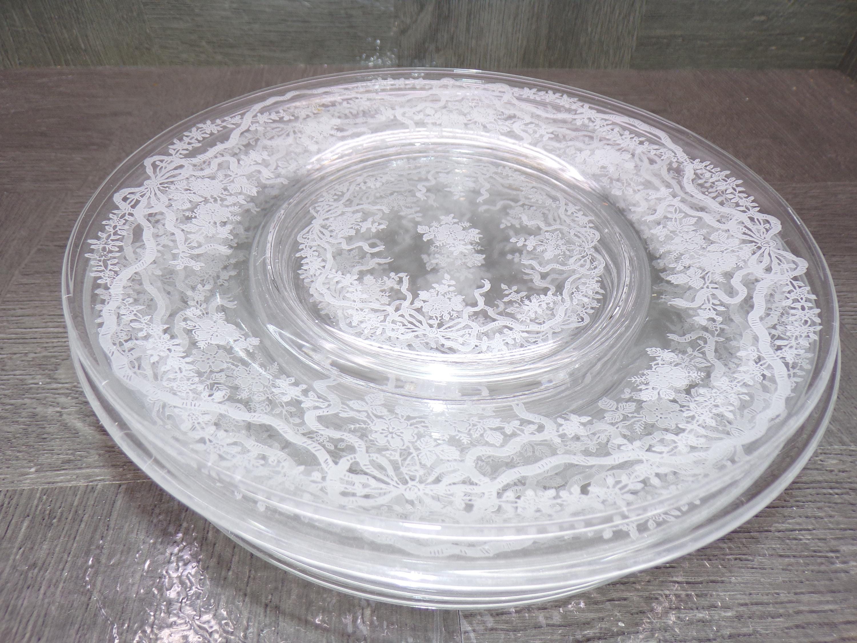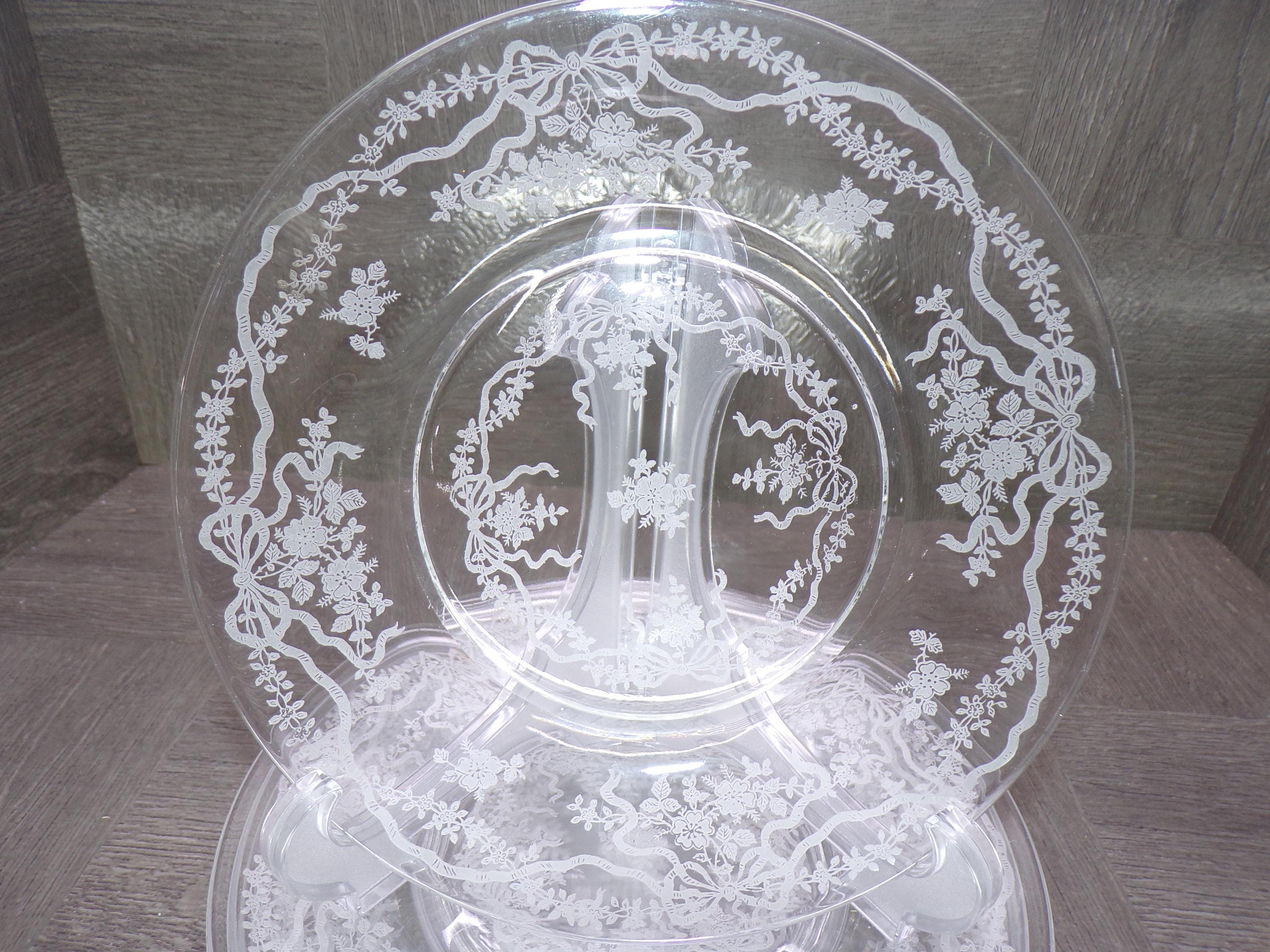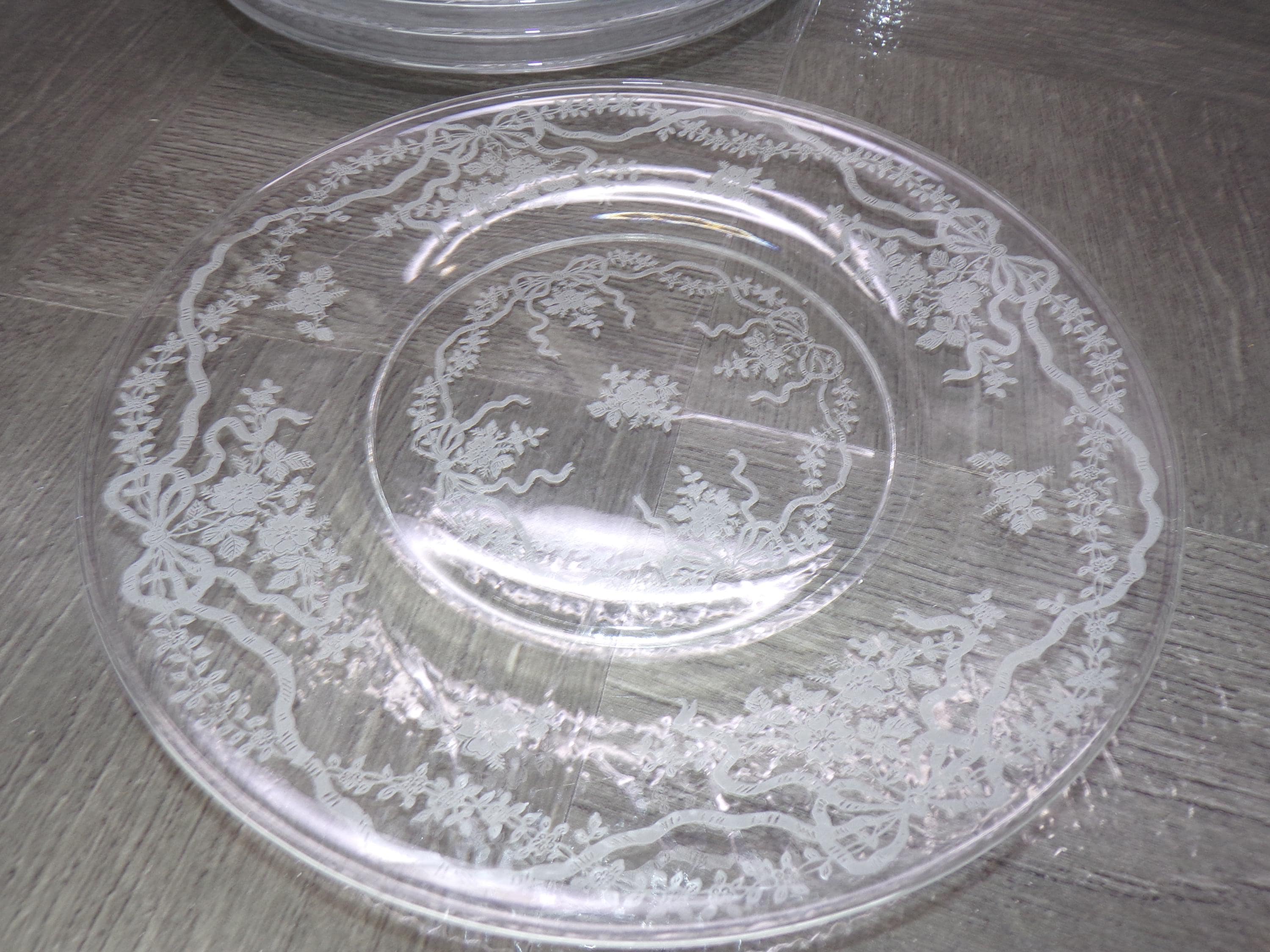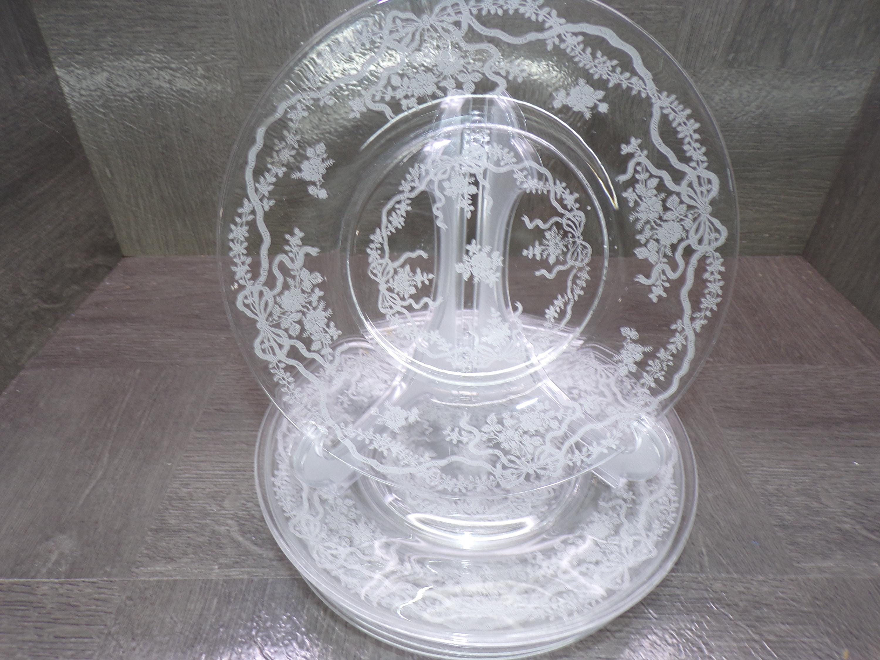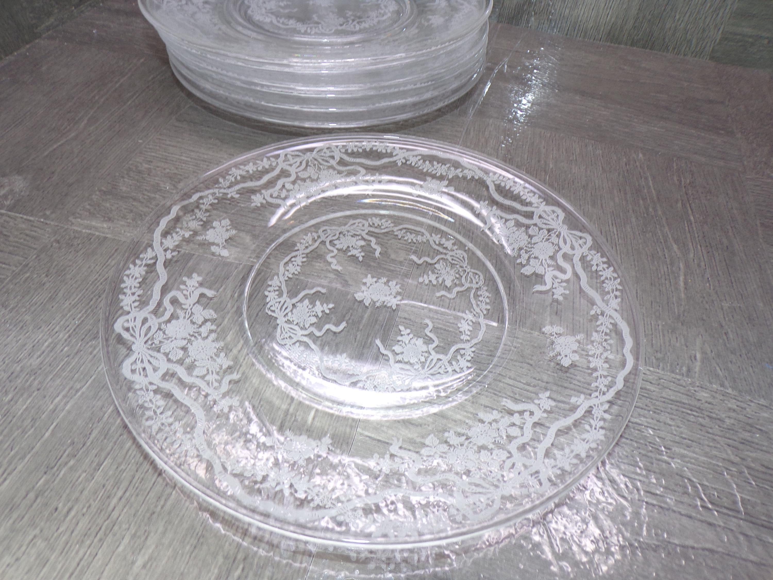 2602 Fostoria Glass Romance 7.75" Salad / Snack Plates Set of 7 Etched Floral and Bows Clear Glassware - Great Condition