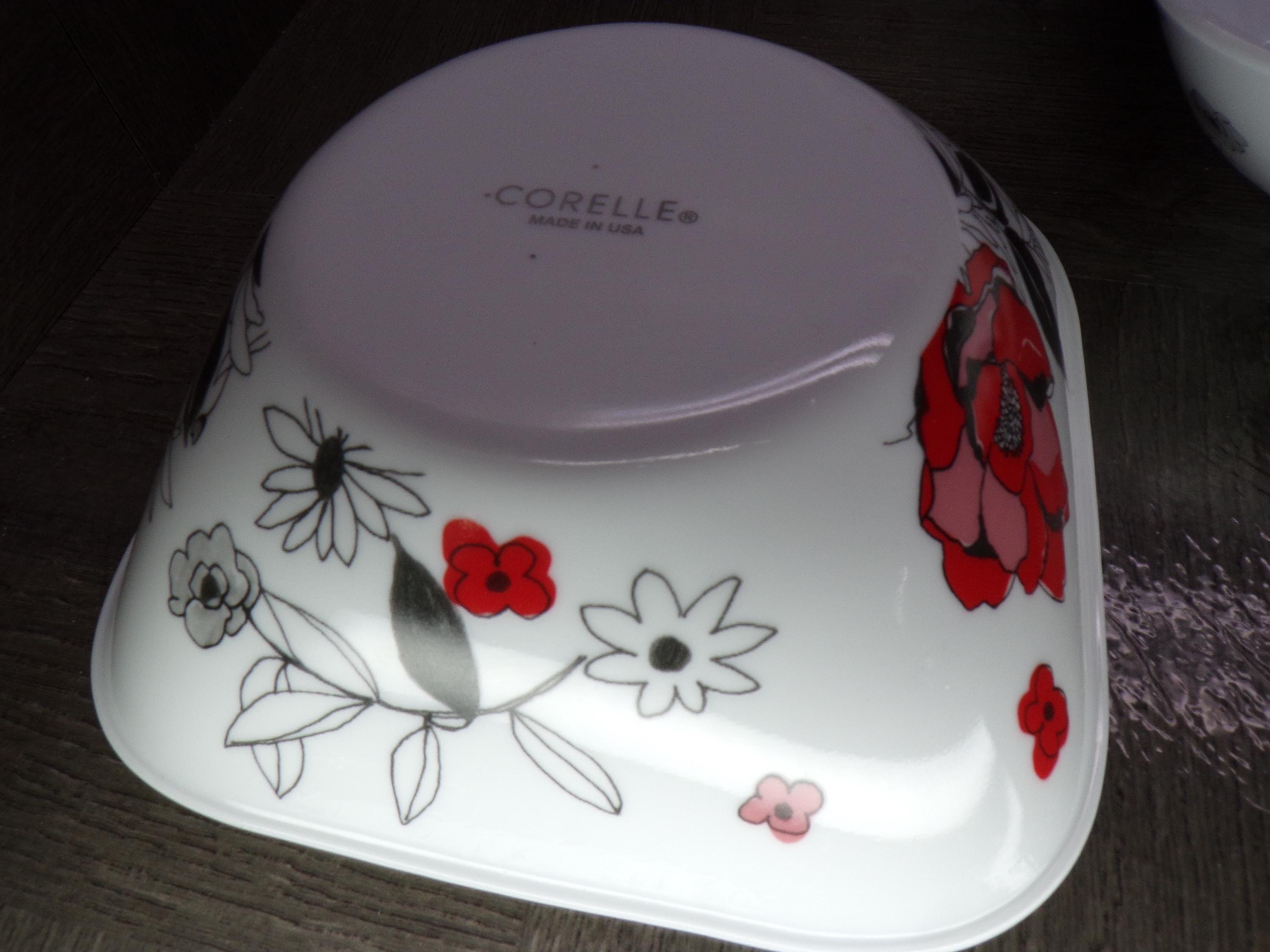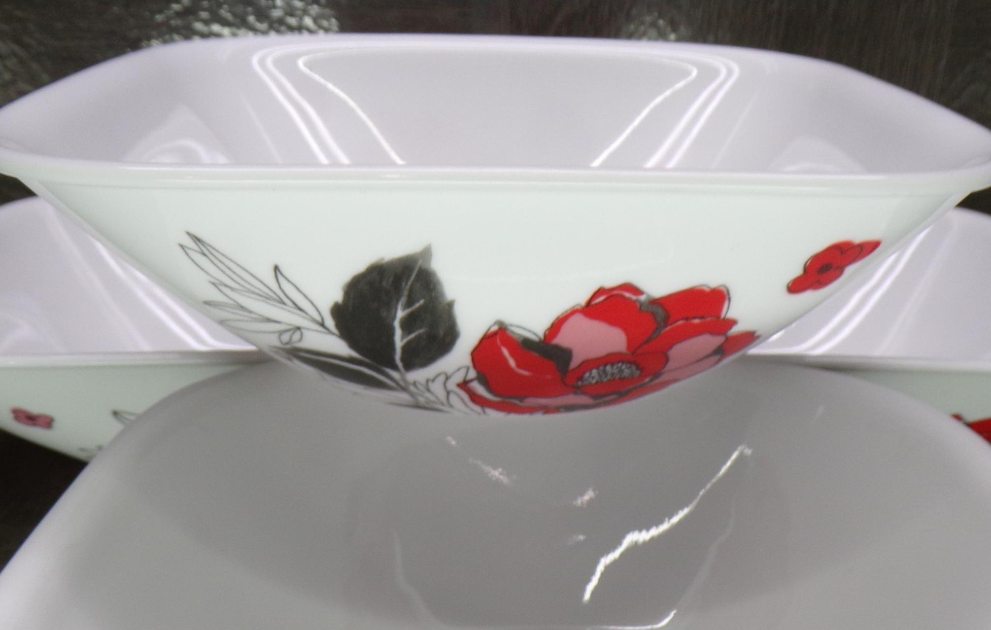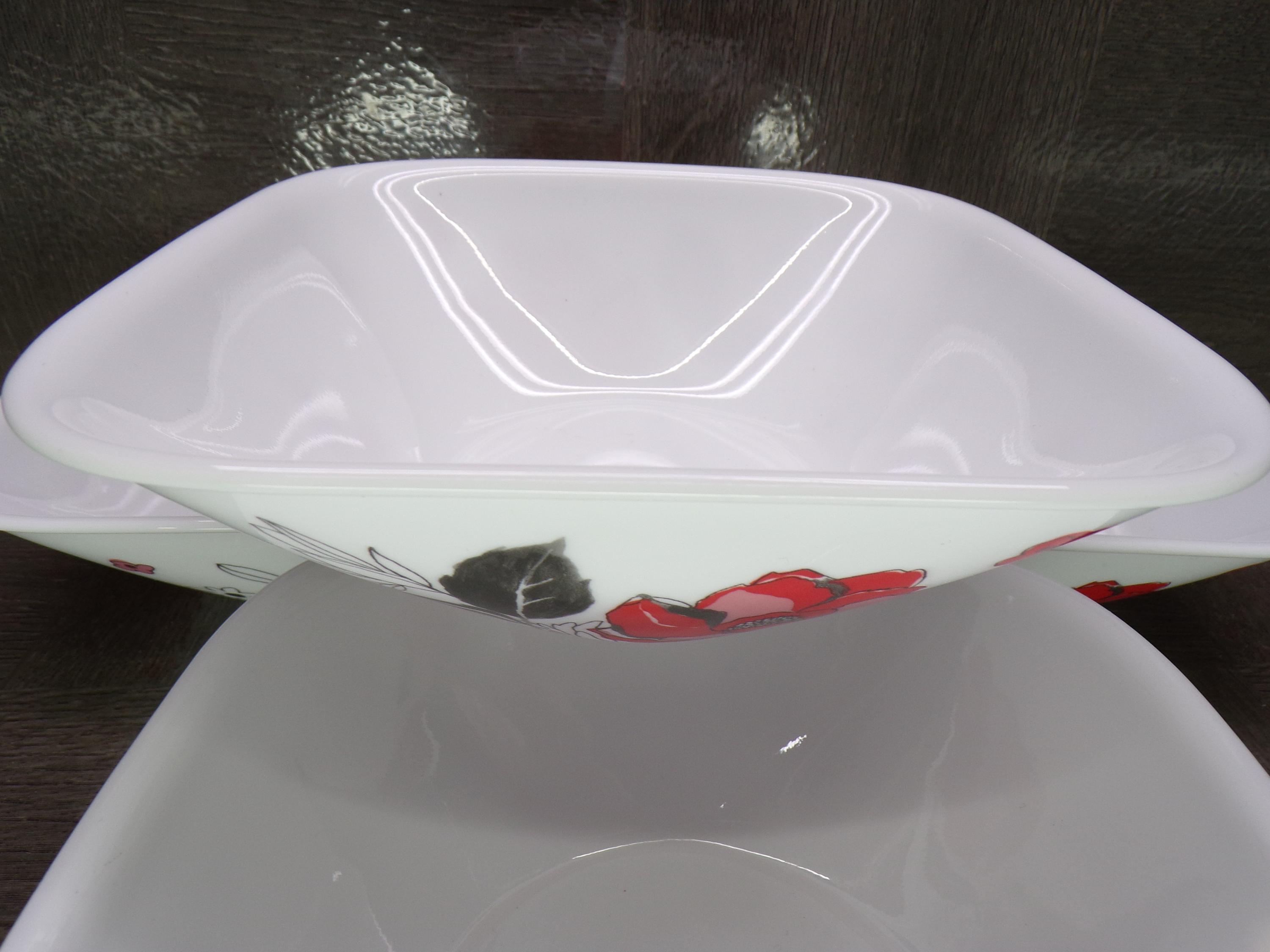 2602 Corelle Boutique Chelsea Rose 6.5" Square Bowls Set of 4 - Red, Black, Gray Floral - Great Condition