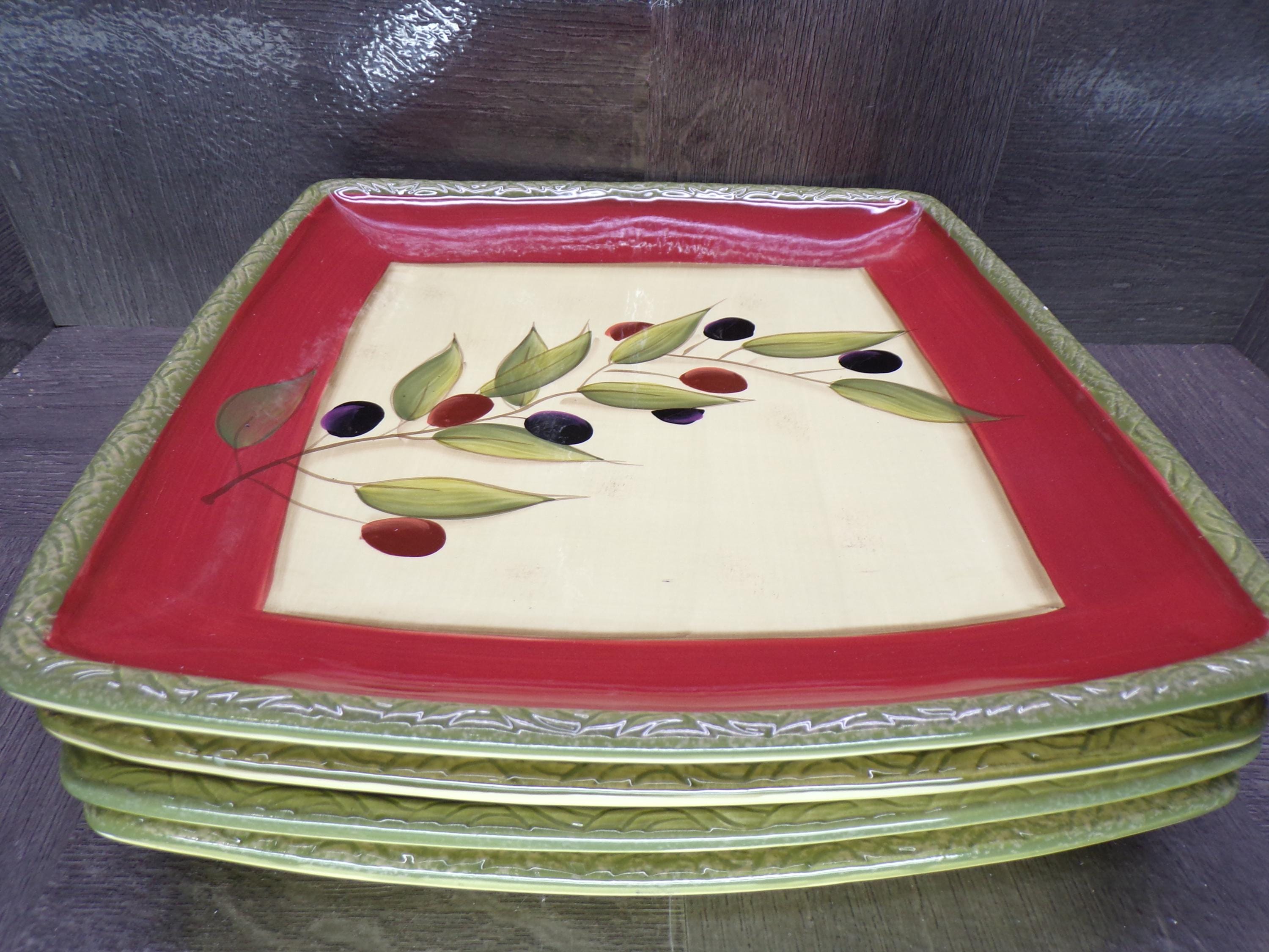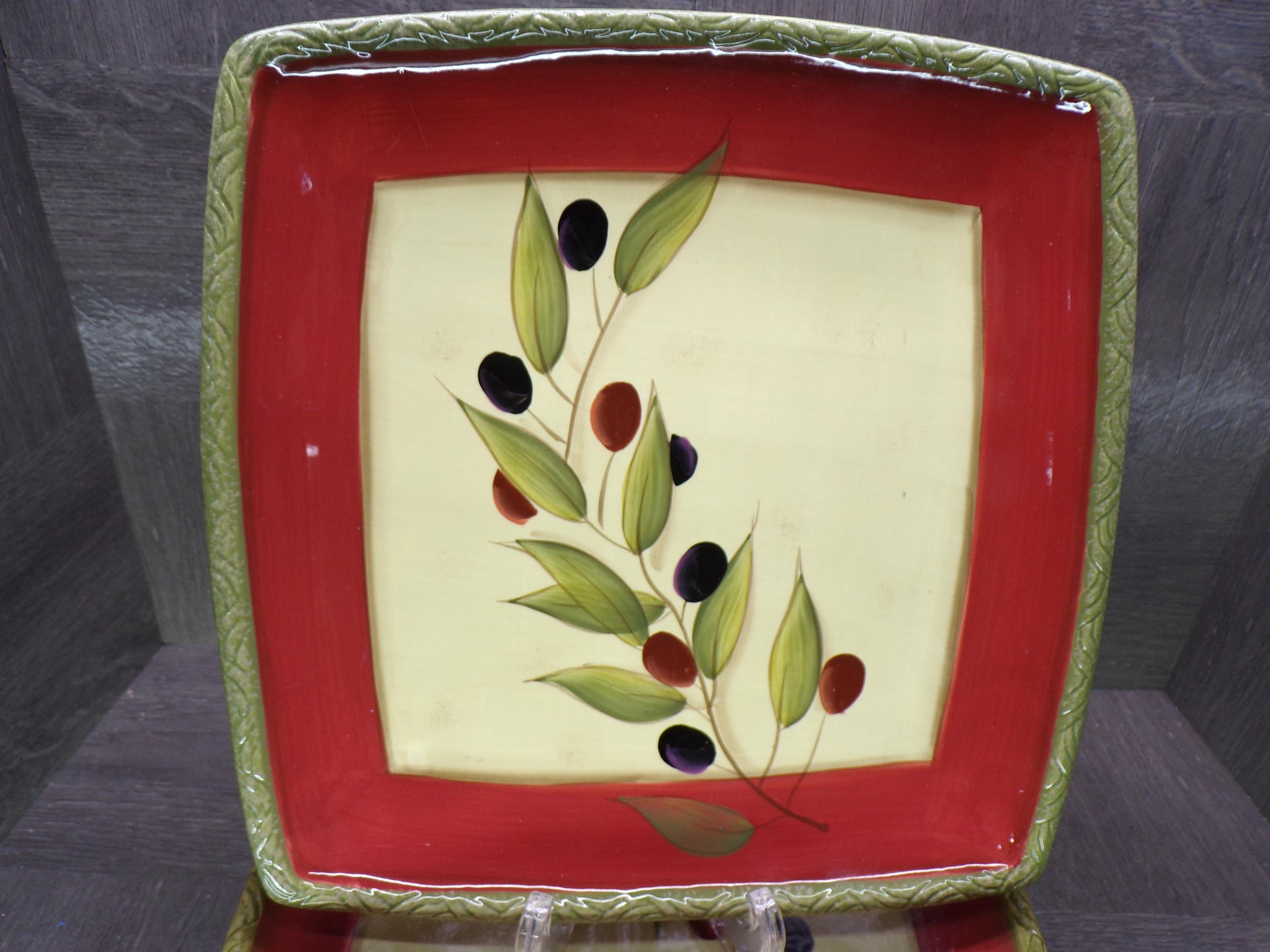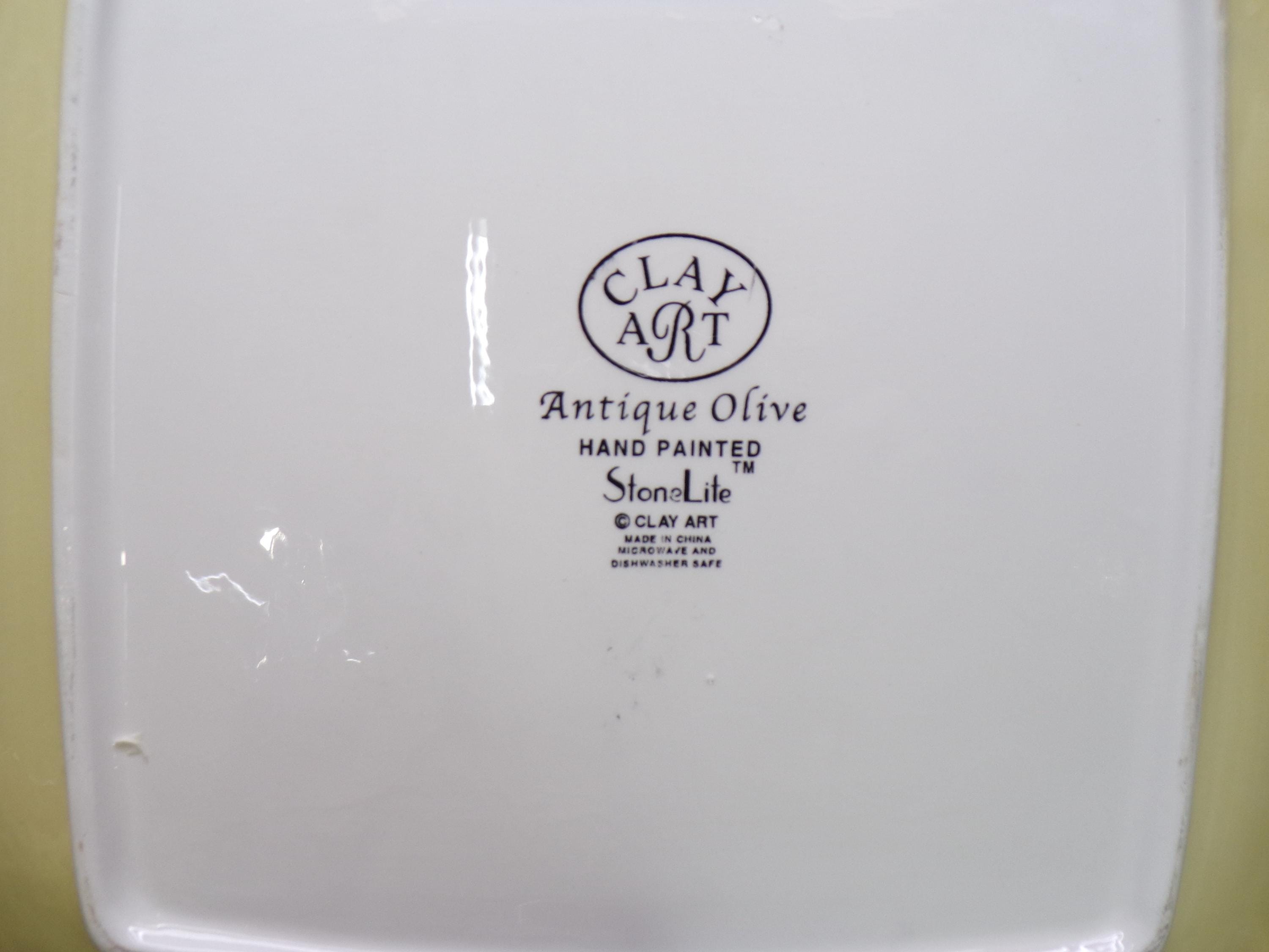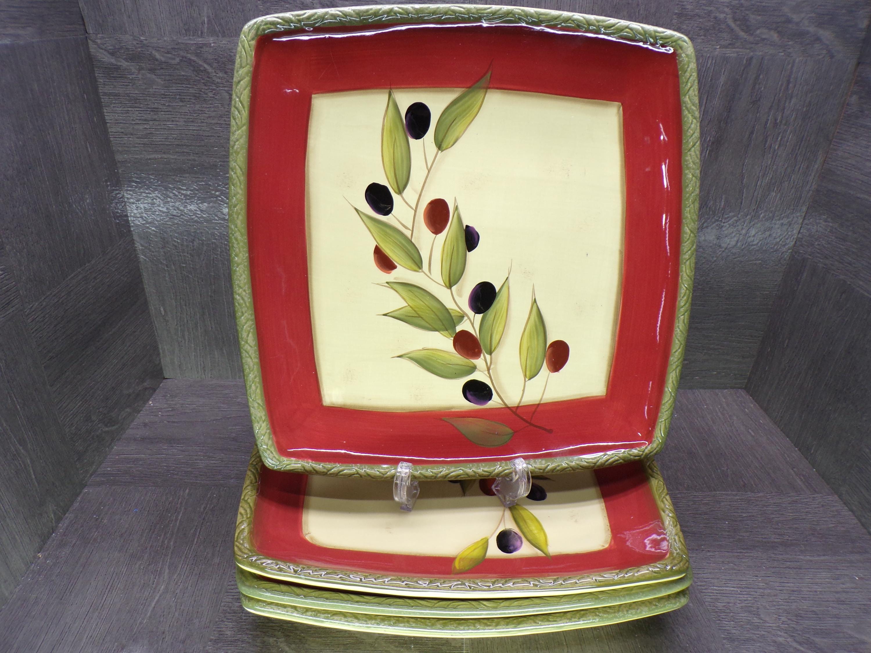 2602 Clay Art Antique Olive Hand-painted 11" Square Dinner Plates Set of 4 - Good Condition