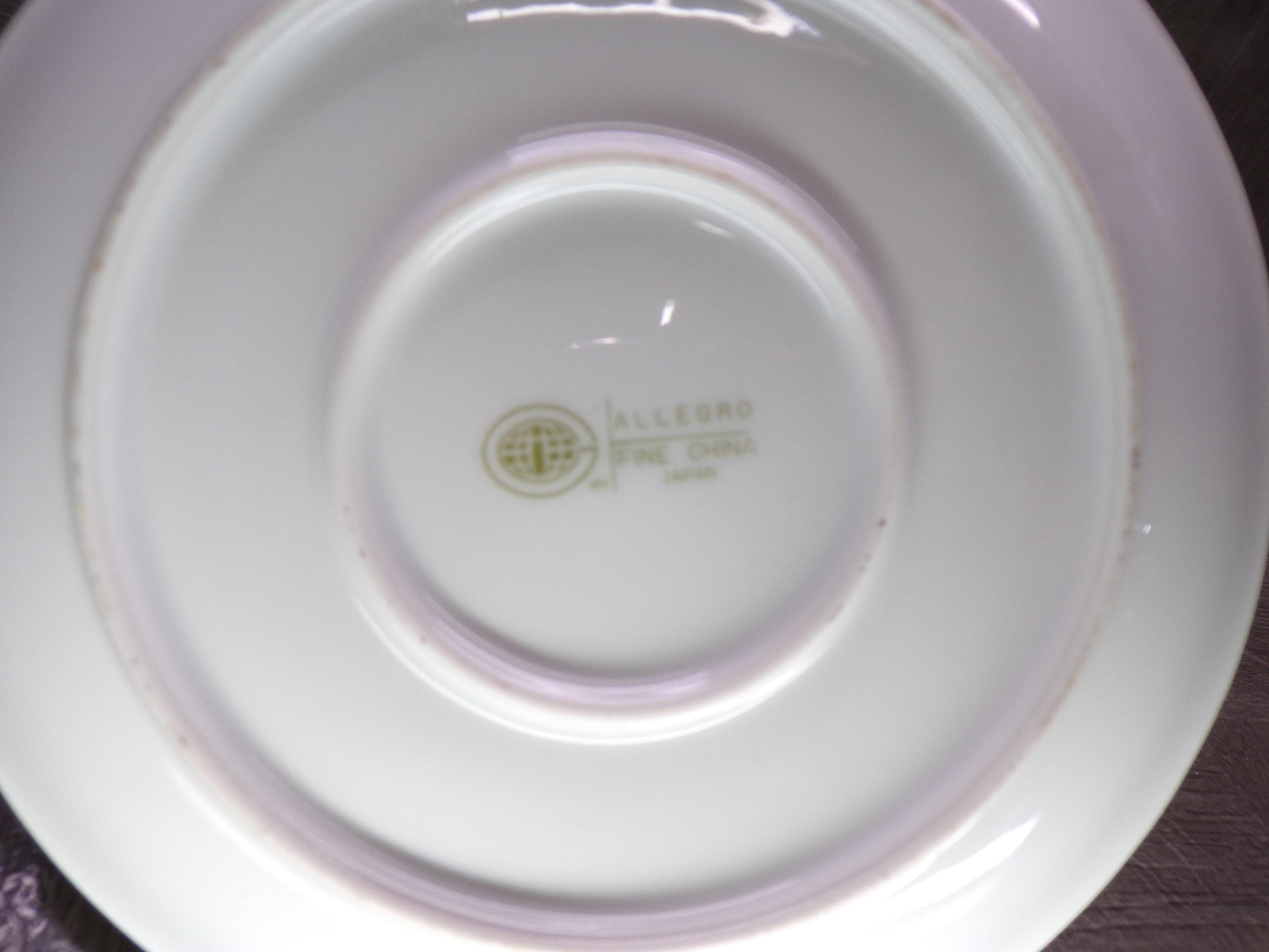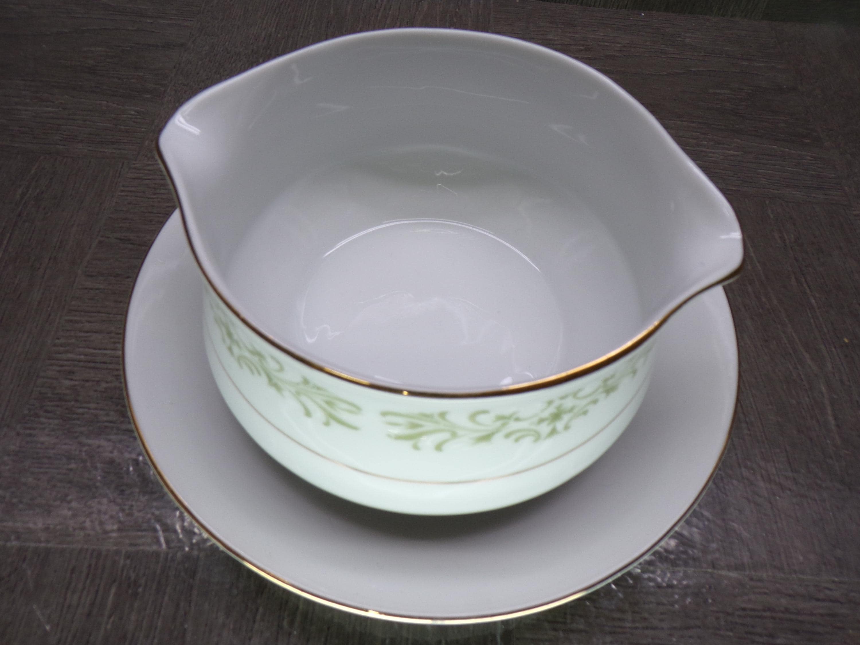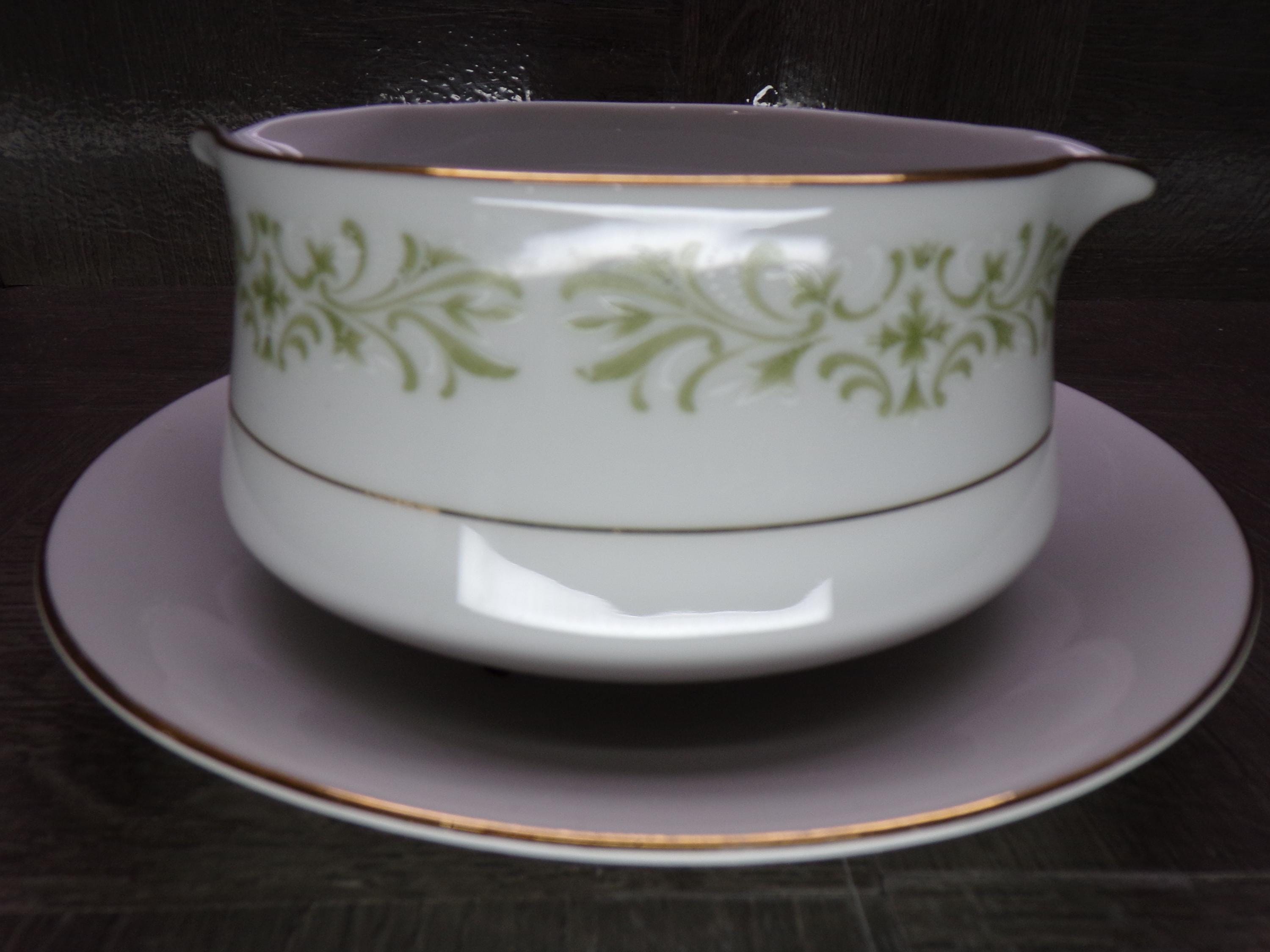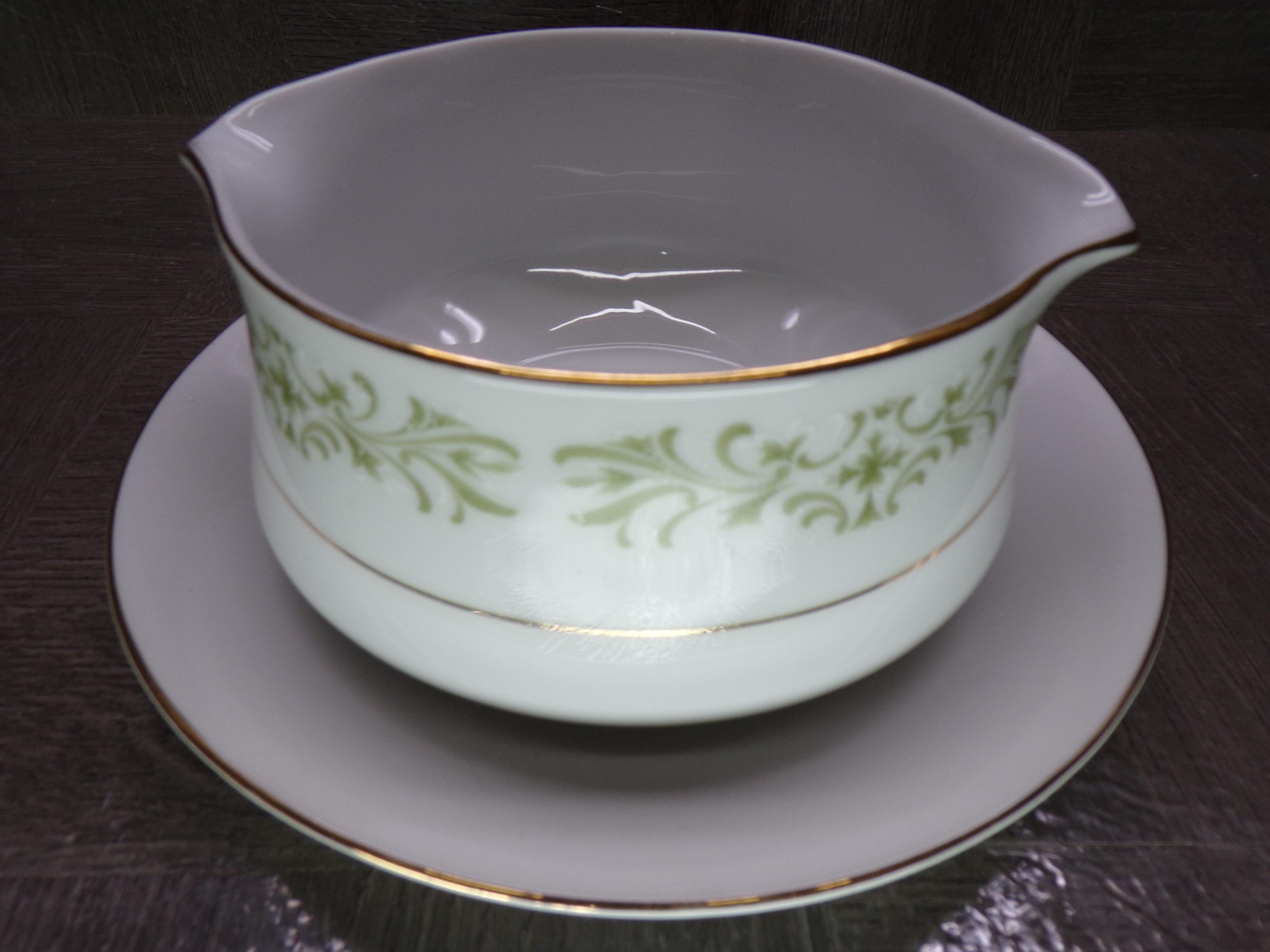2602 Allegro Green Floral Fine China Gravy Boat w/ Attached Underplate Made in Japan - Great Condition
