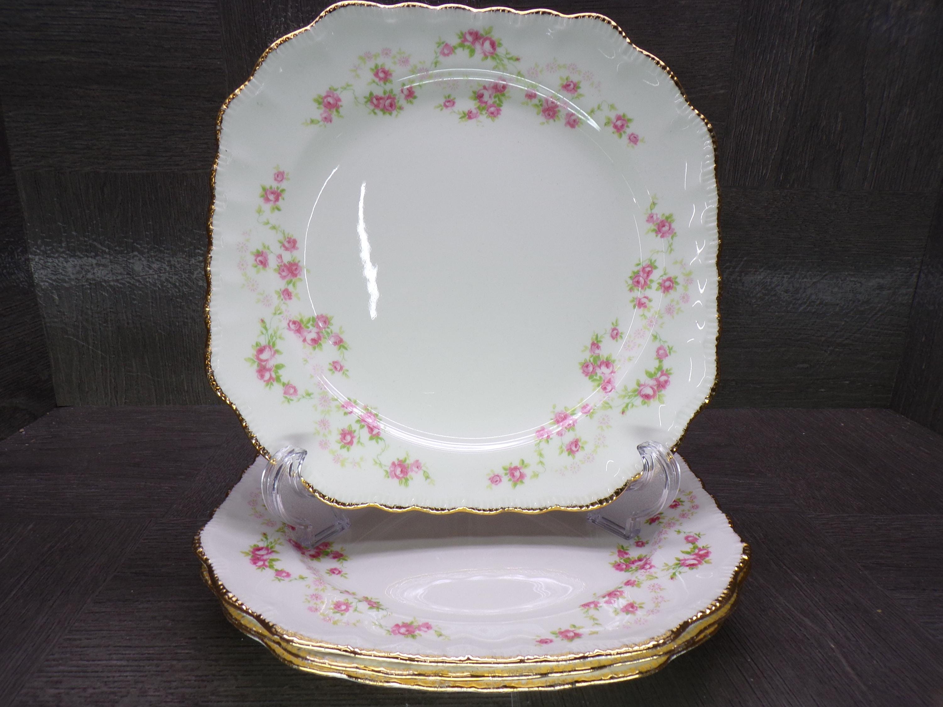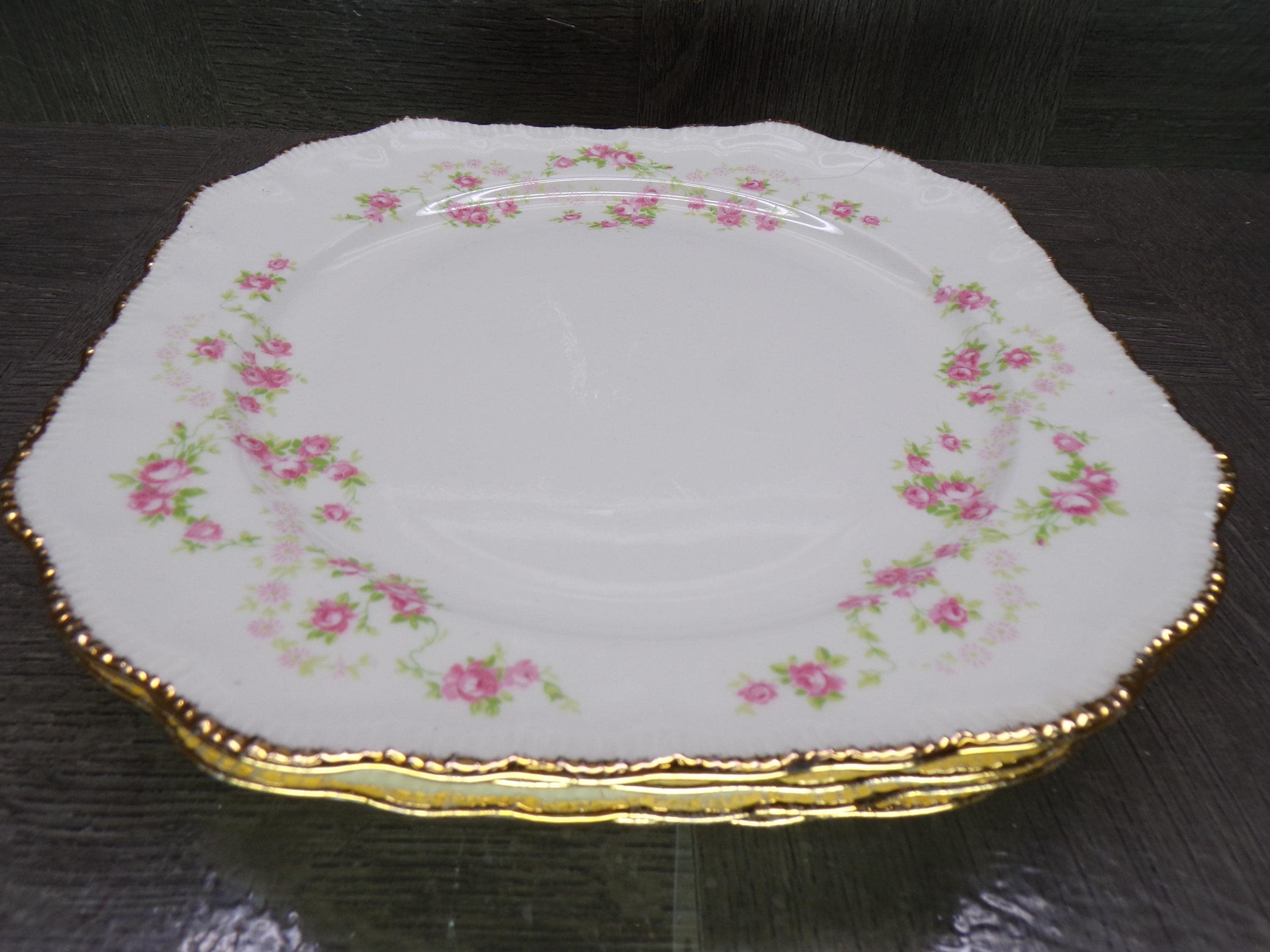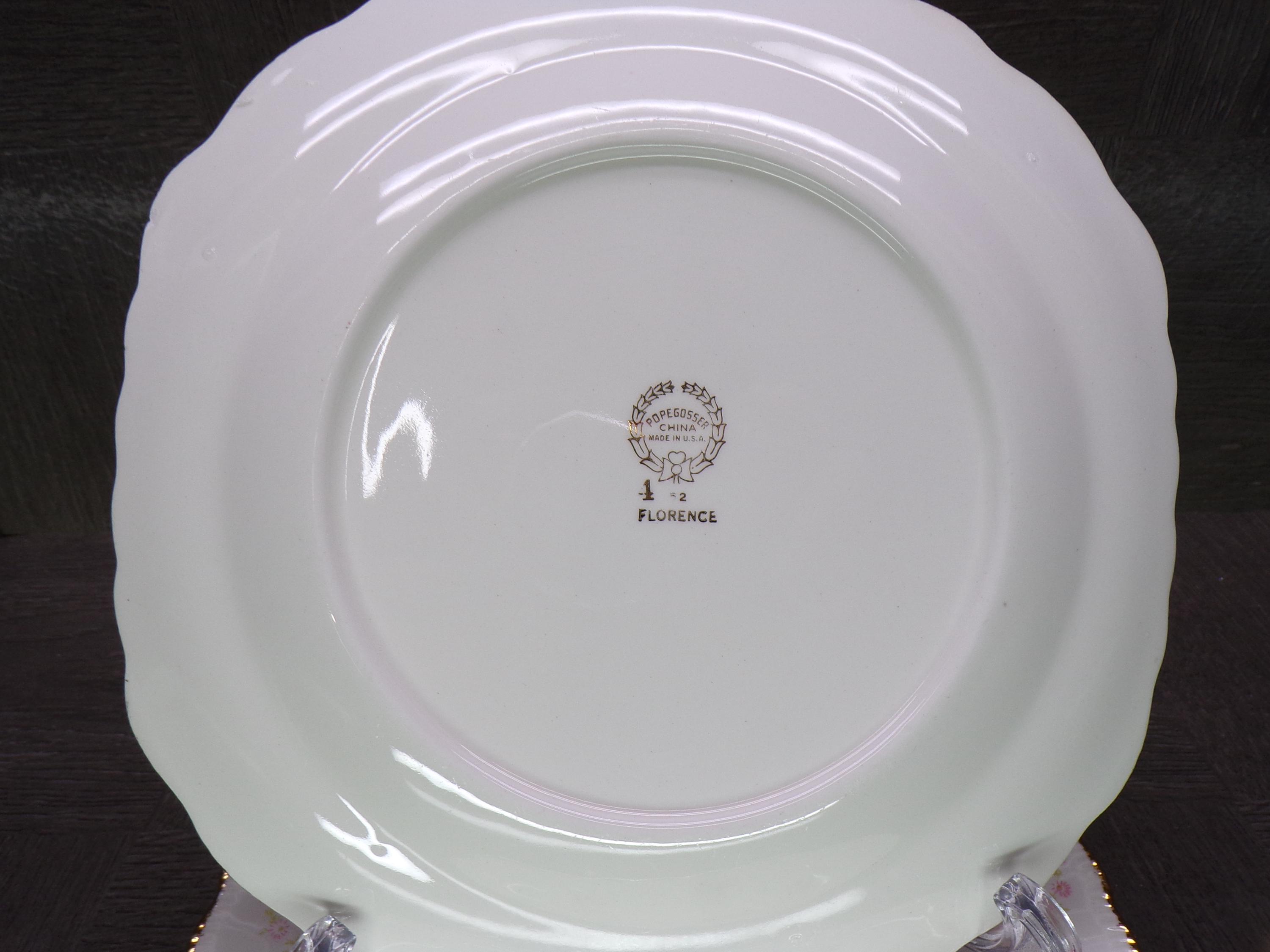 2602 Pope-Gosser Florence Vintage 7.5" Salad / Snack Plates Set of 4 Pink Rose China w/ Gold Rim Made in USA - Great Condition