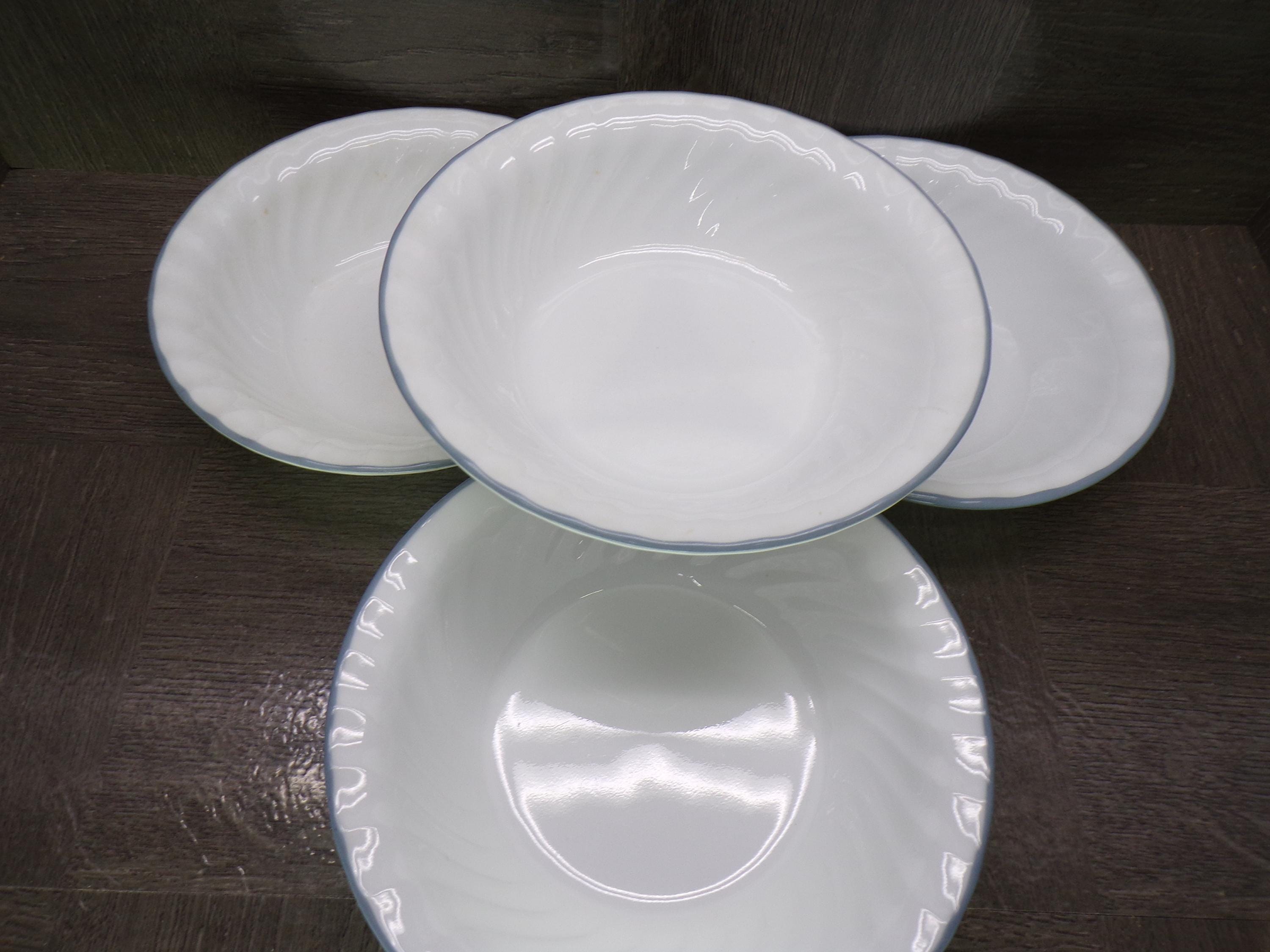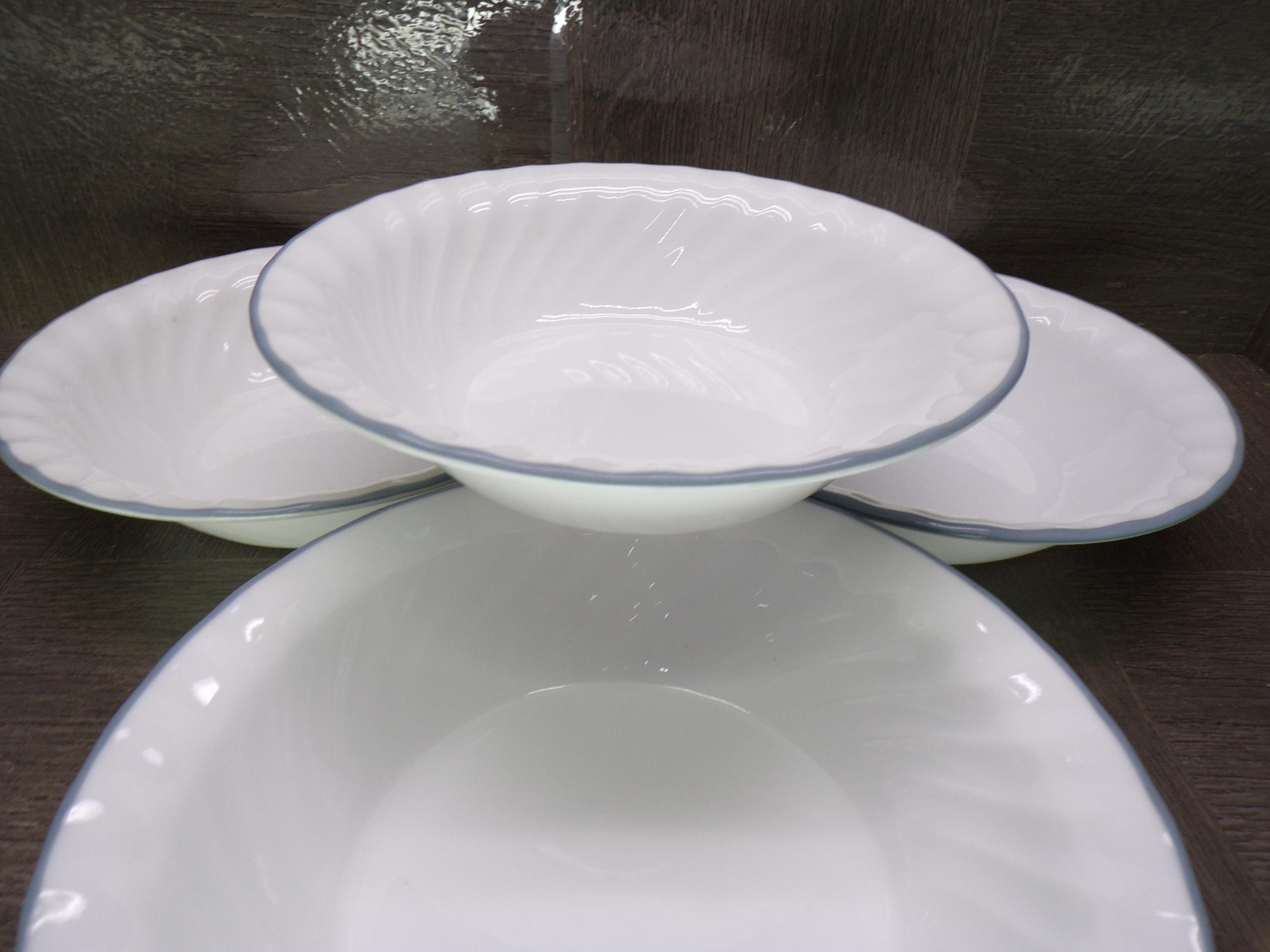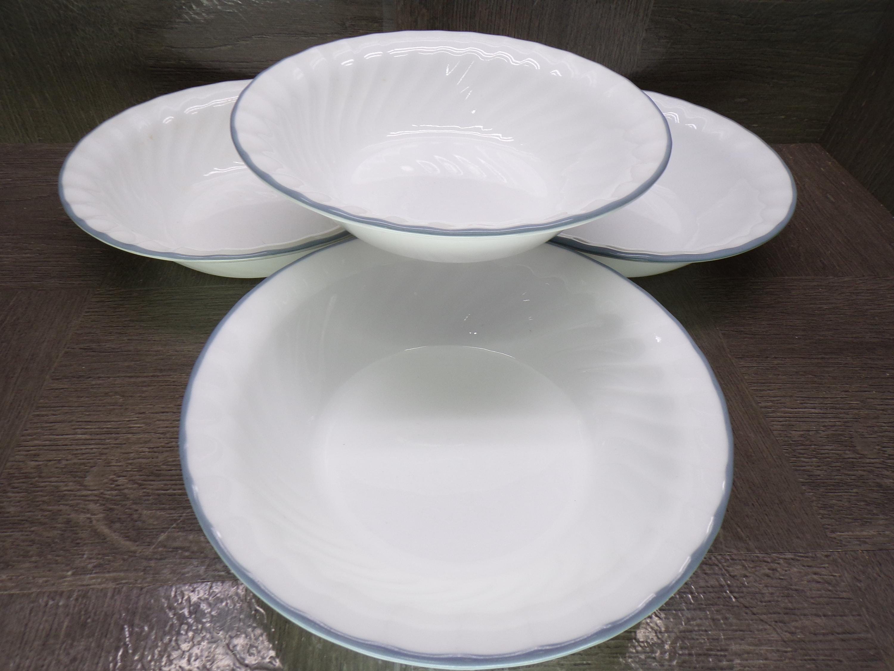 2602 Corelle Vitrelle White Swirl 7" Light Blue Rim Cereal Bowls Set of 4 - Good Condition