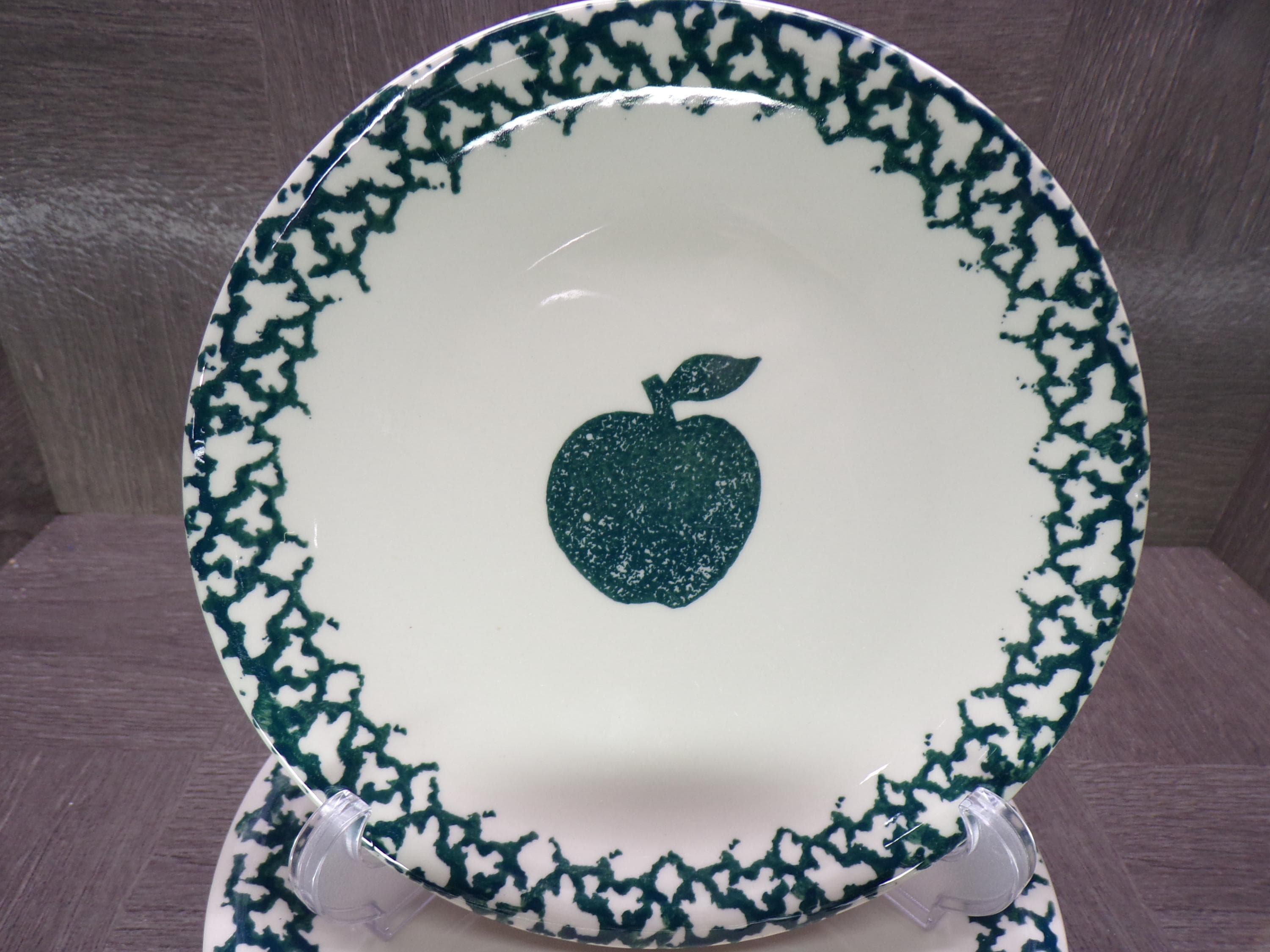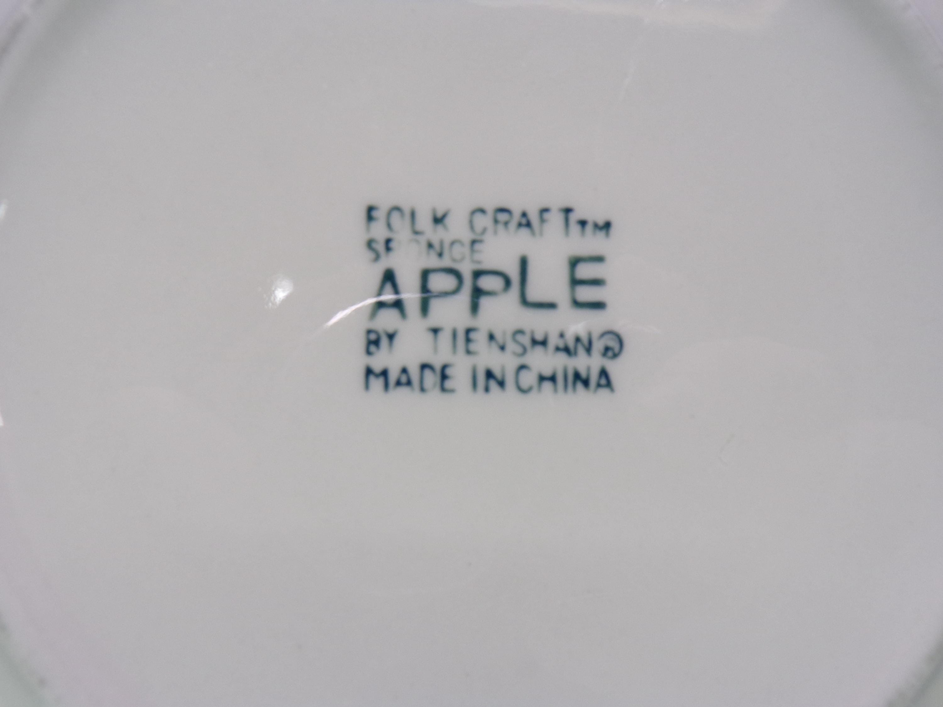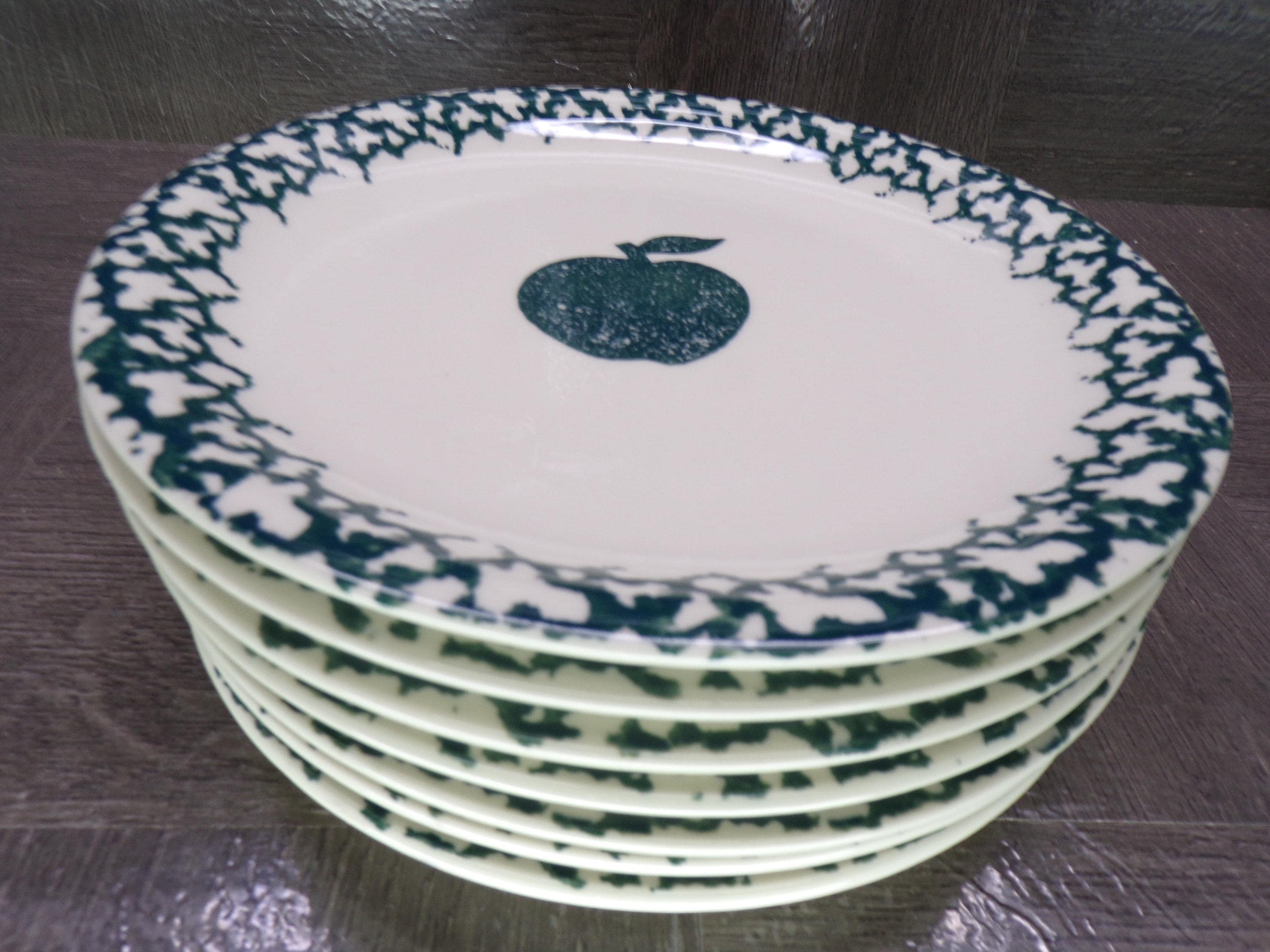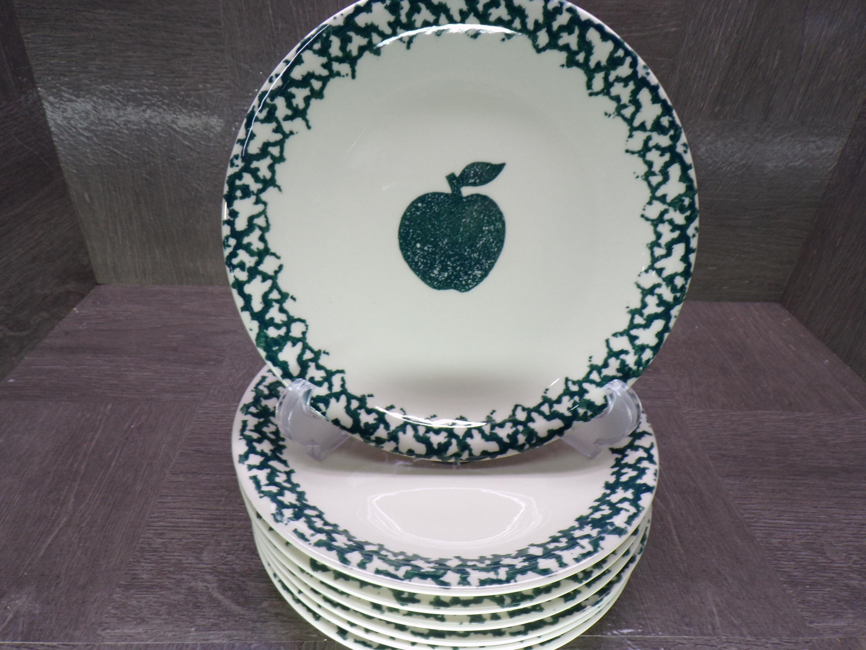 2602 Folkcraft Green Sponge Apple 7.5" Salad / Snack Plates Set of 7 by Tienshan Stoneware - Good Condition Some Scratches