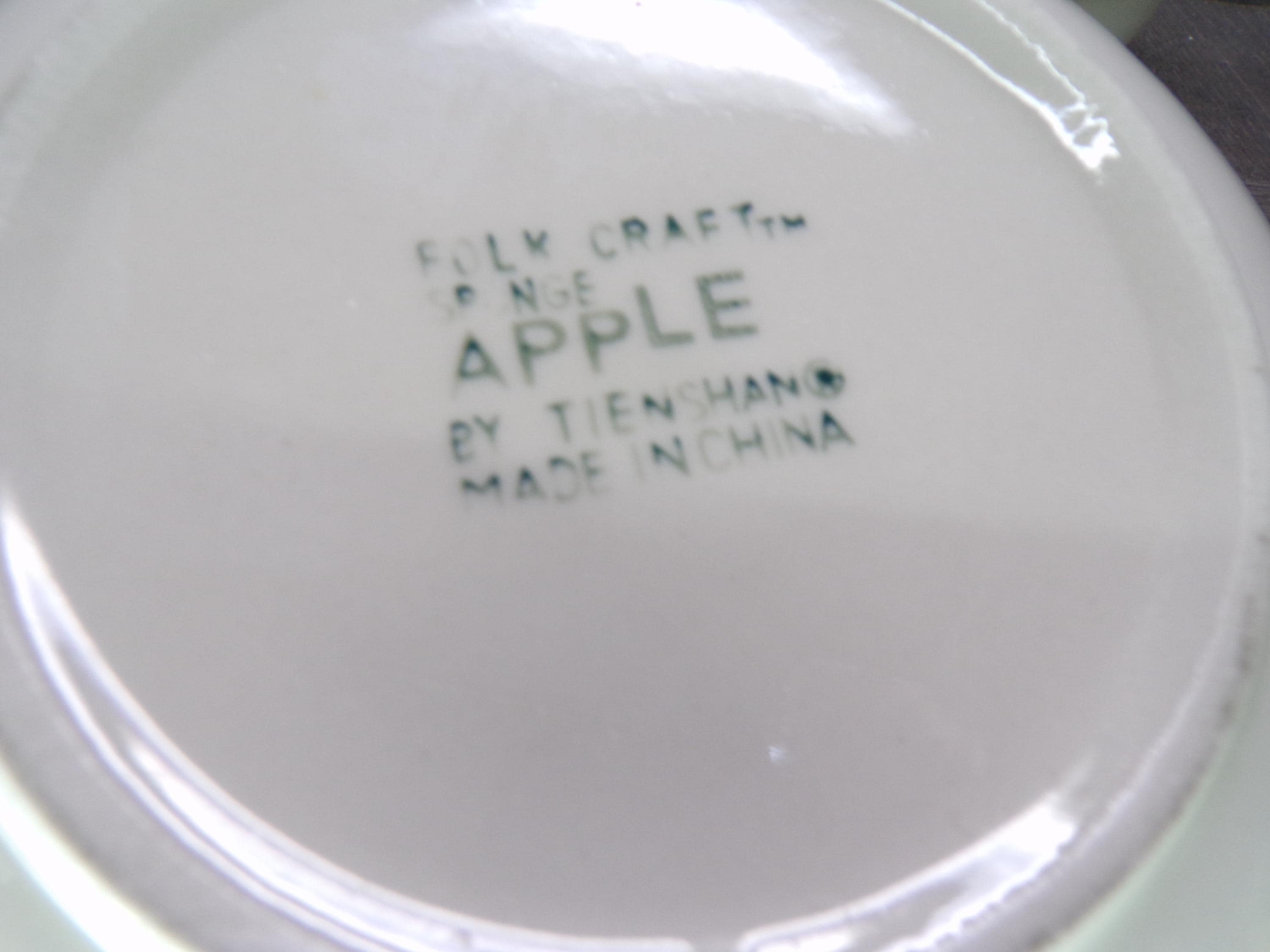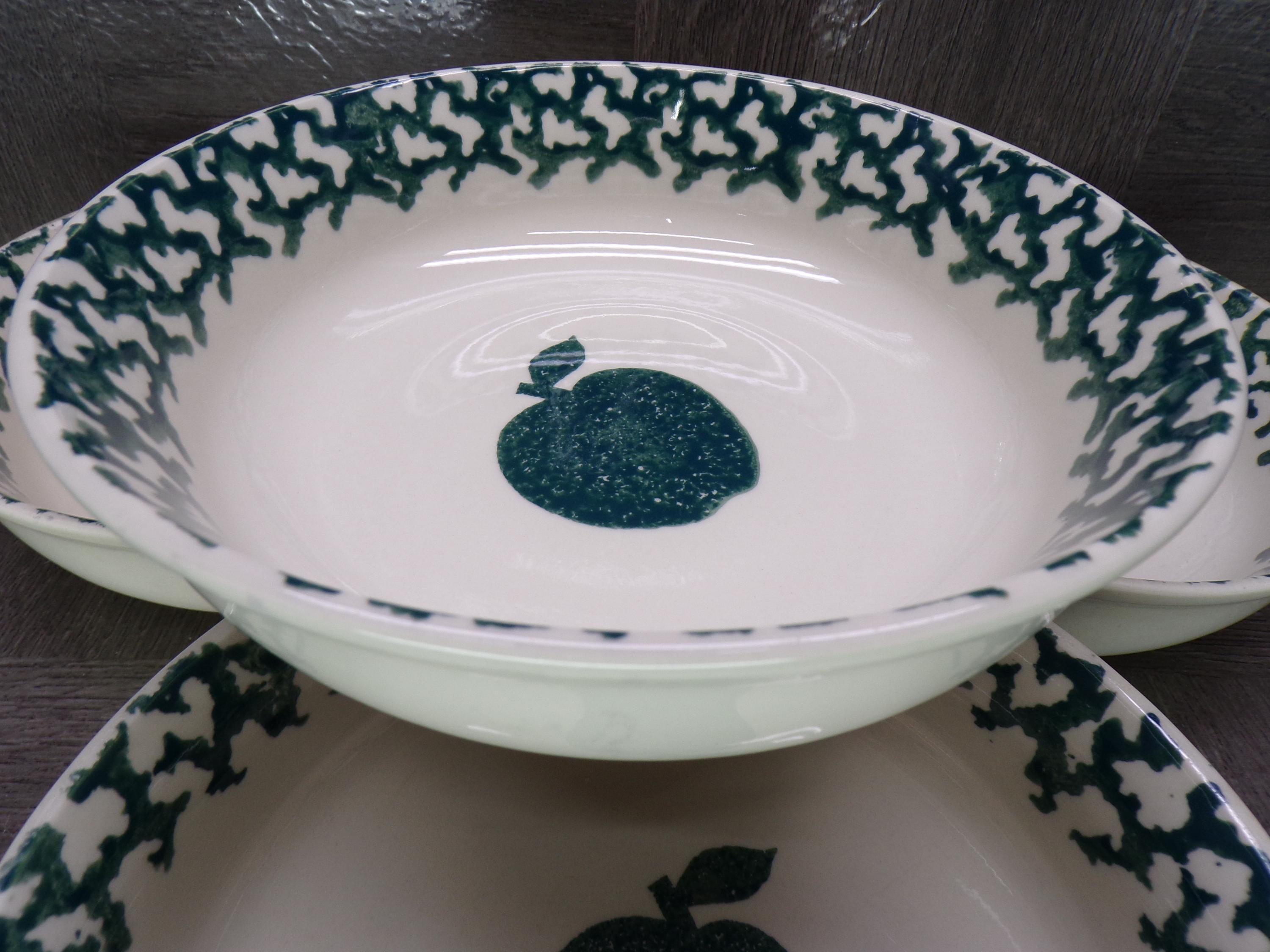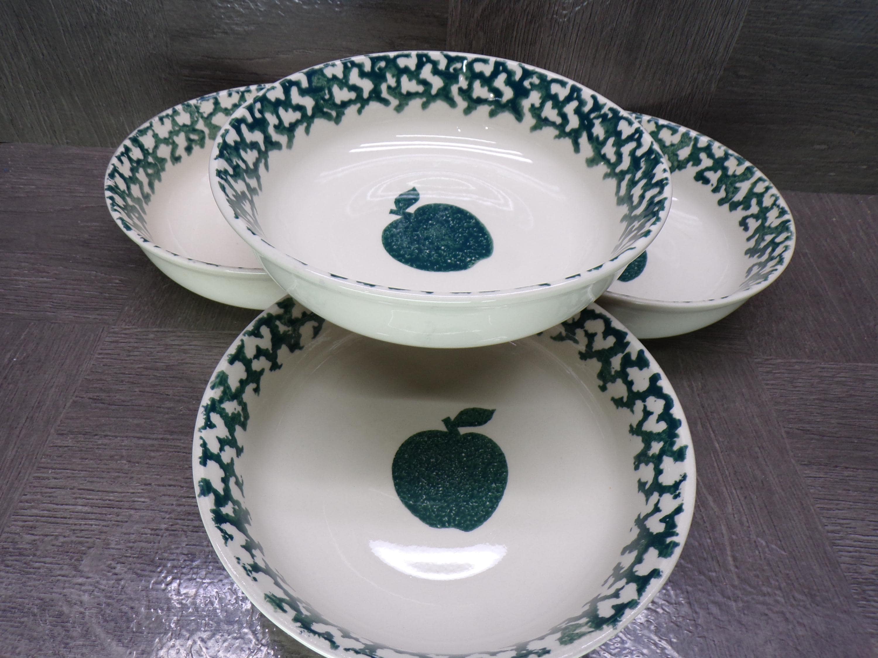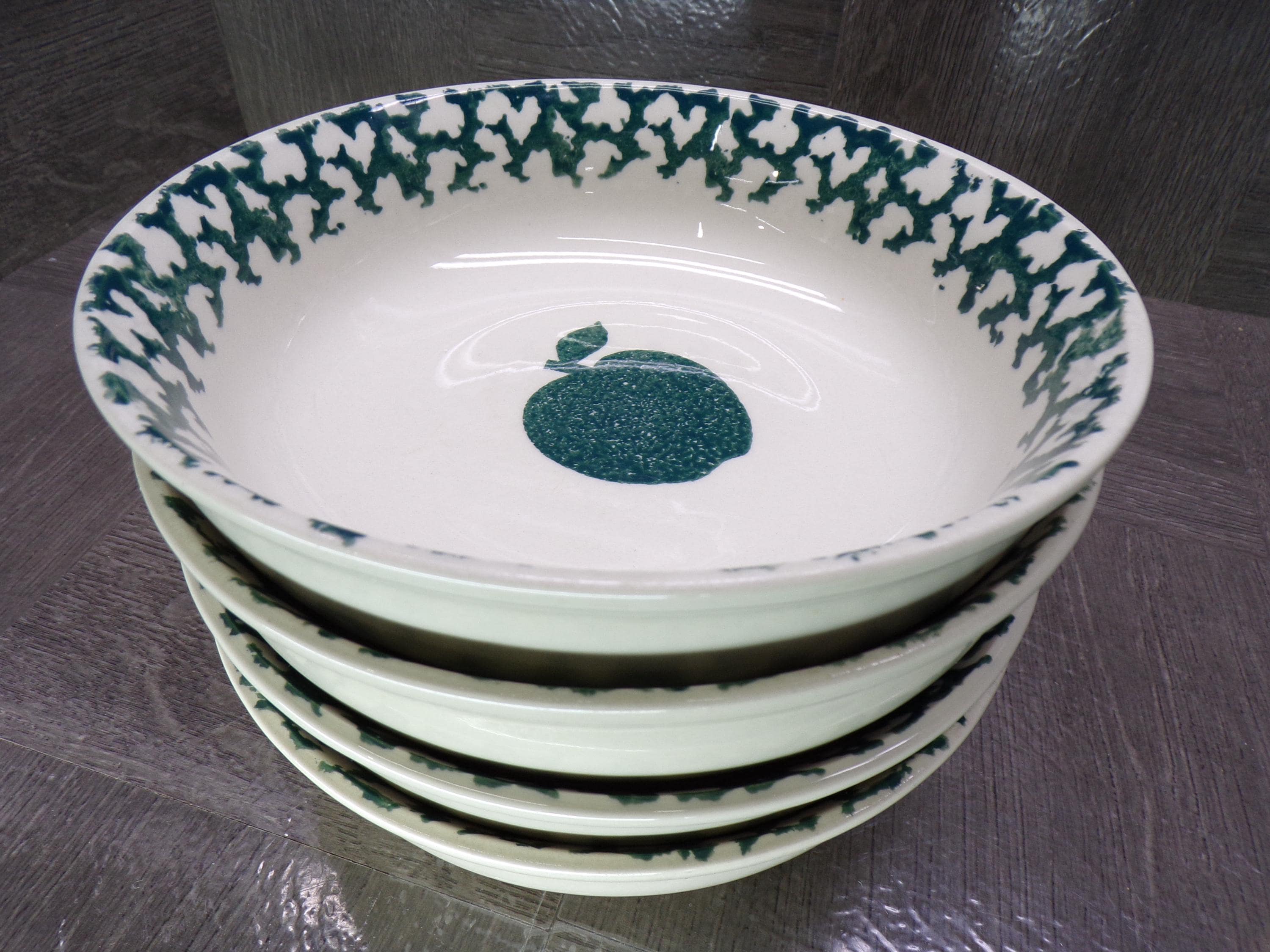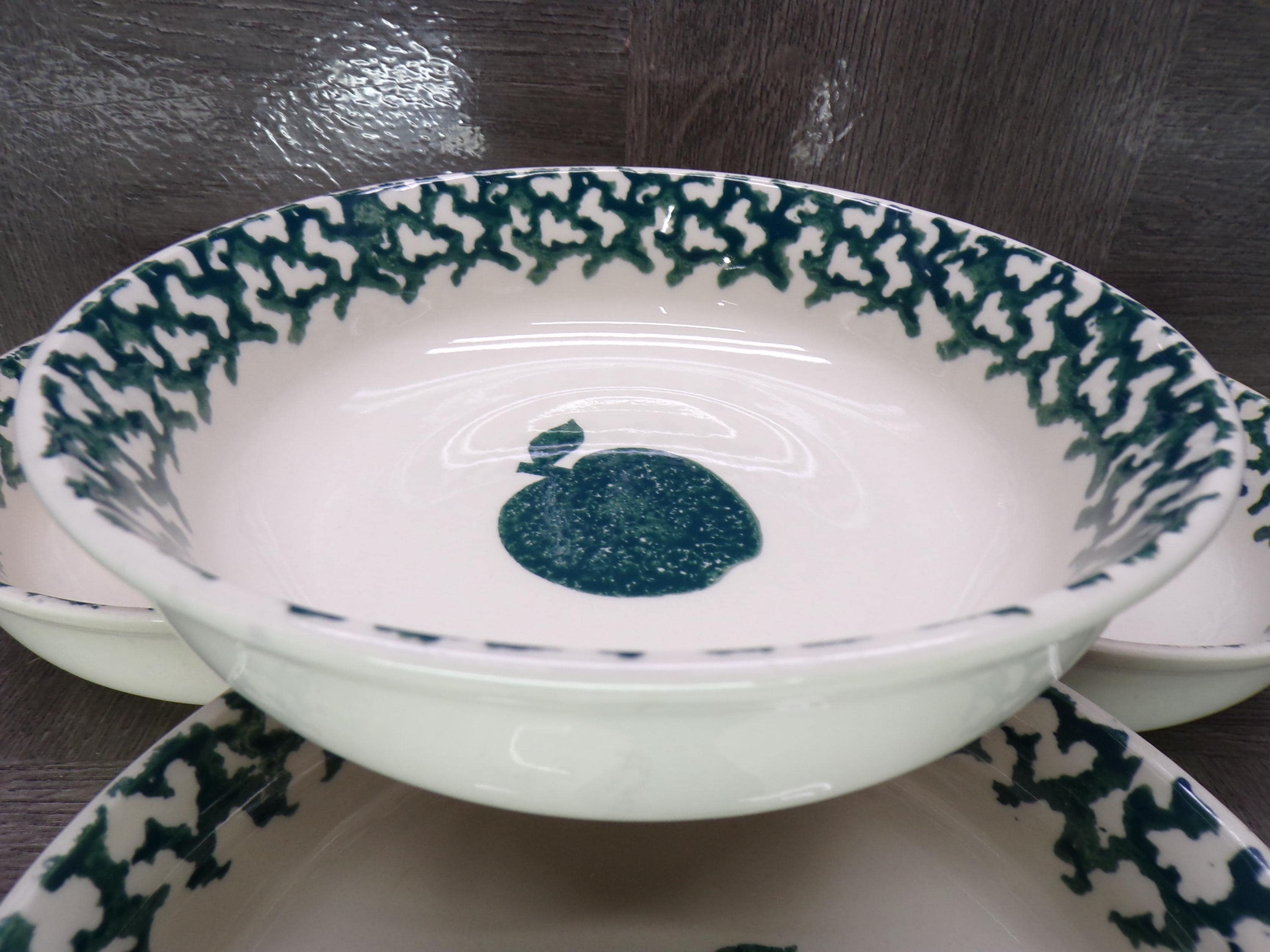 2602 Folkcraft Green Sponge Apple 6.25"Soup / Cereal Bowl Set of 4 by Tienshan Stoneware - Good Condition Light Scratches