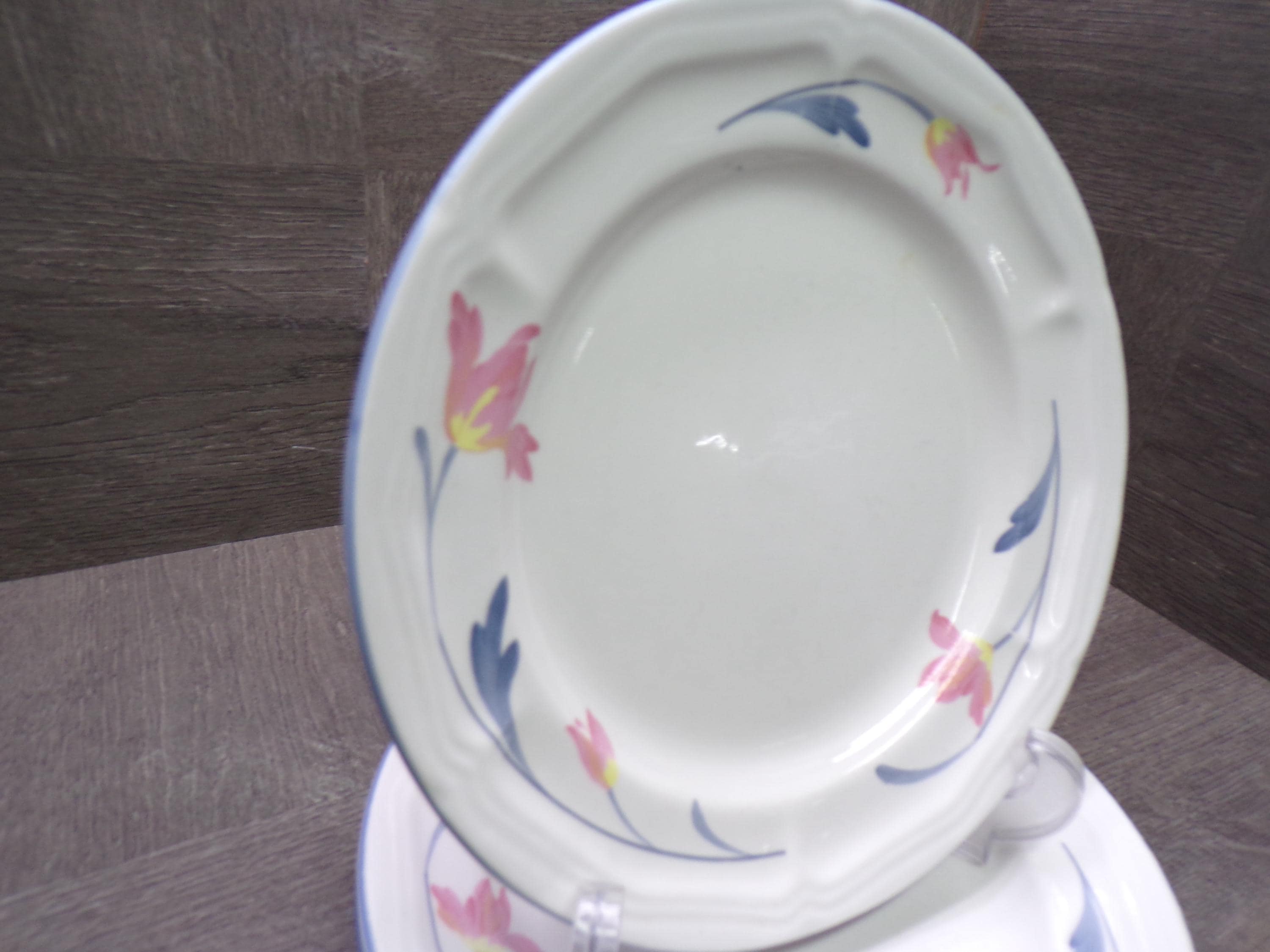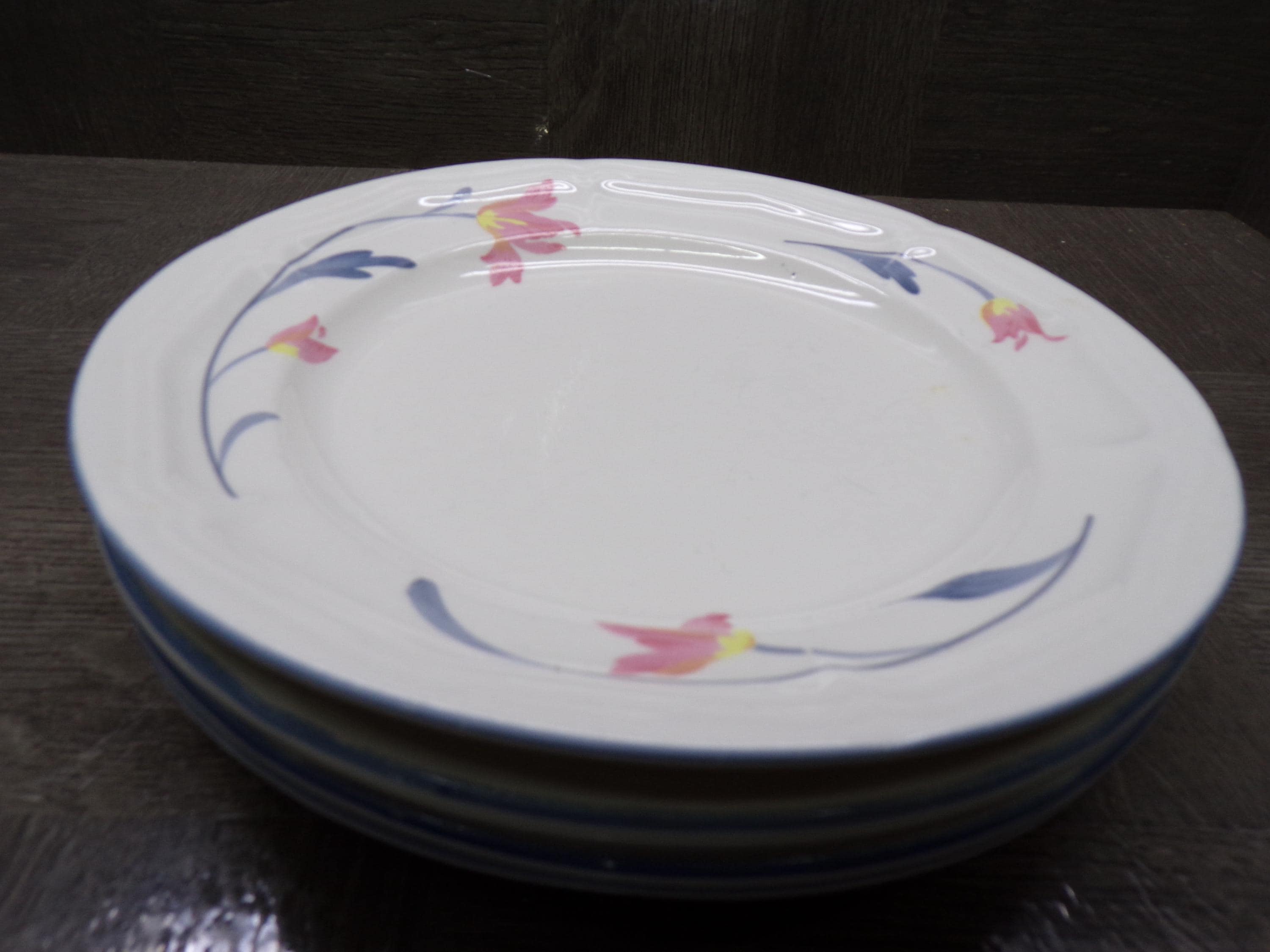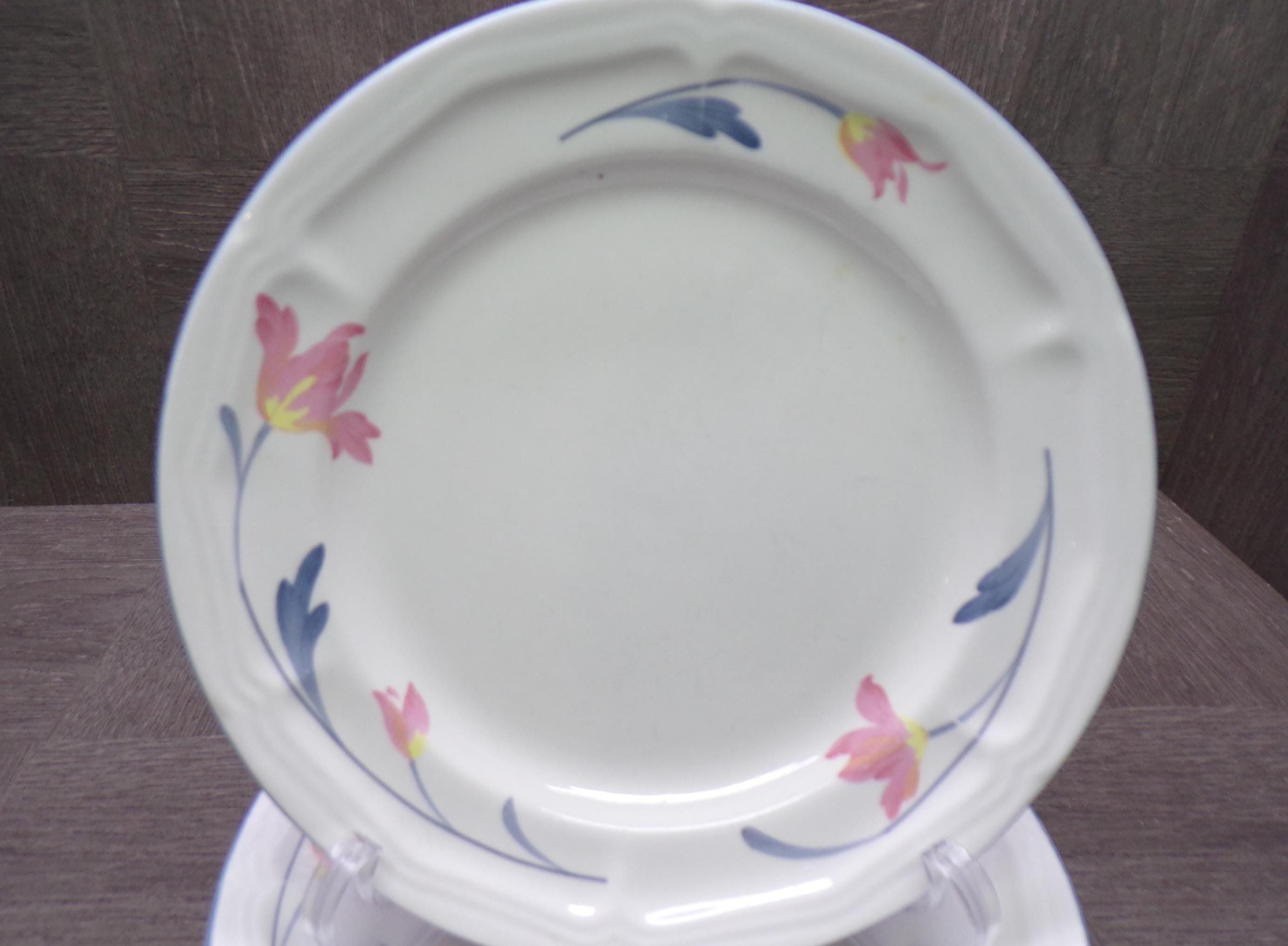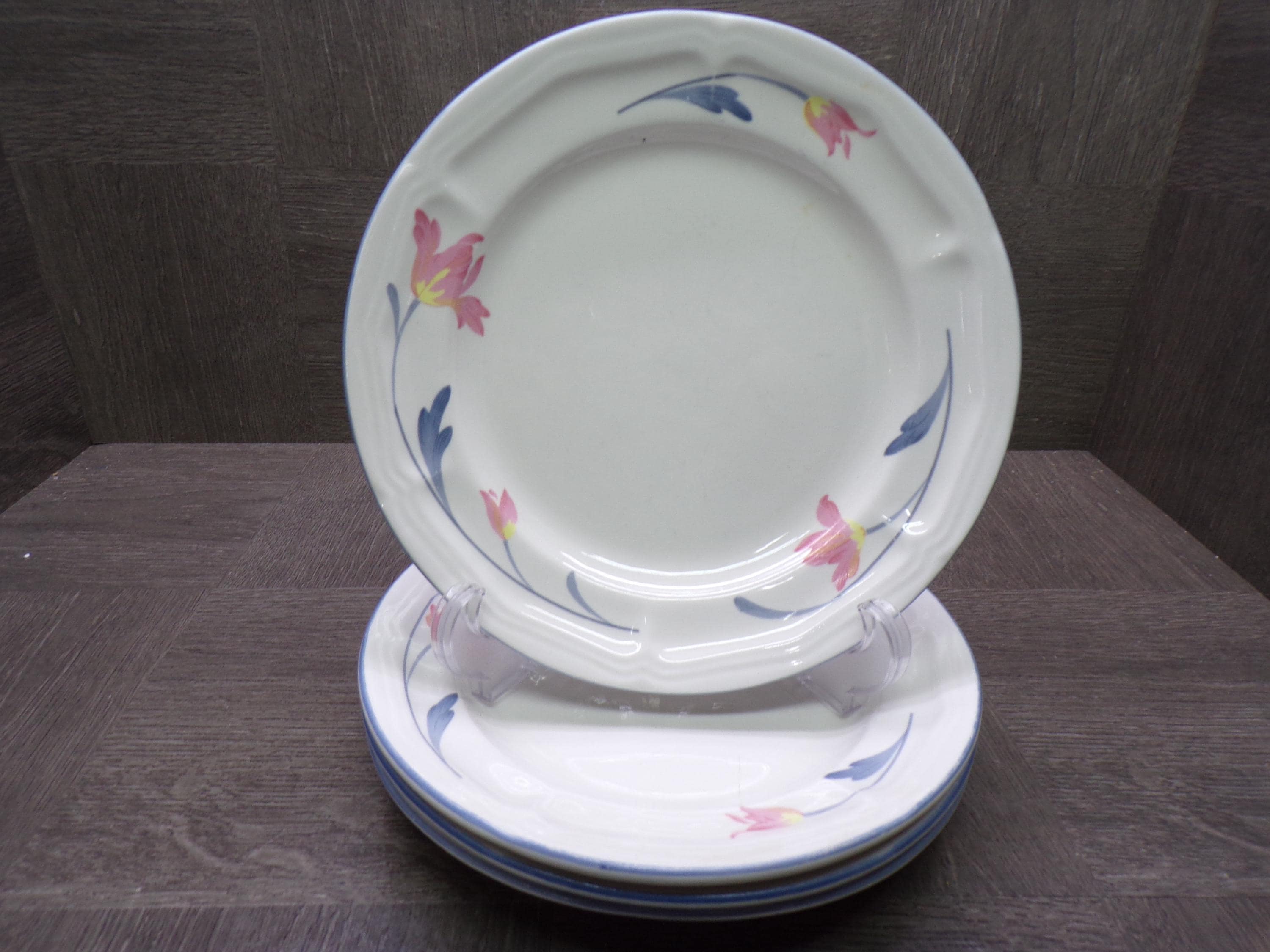 2602 Avonlea Citation Corn Panies Vintage Stoneware Beautiful Pink & Blue Floral 7.5" Salad / Snack Plates Set of 4 - Good Condition Light Scratches