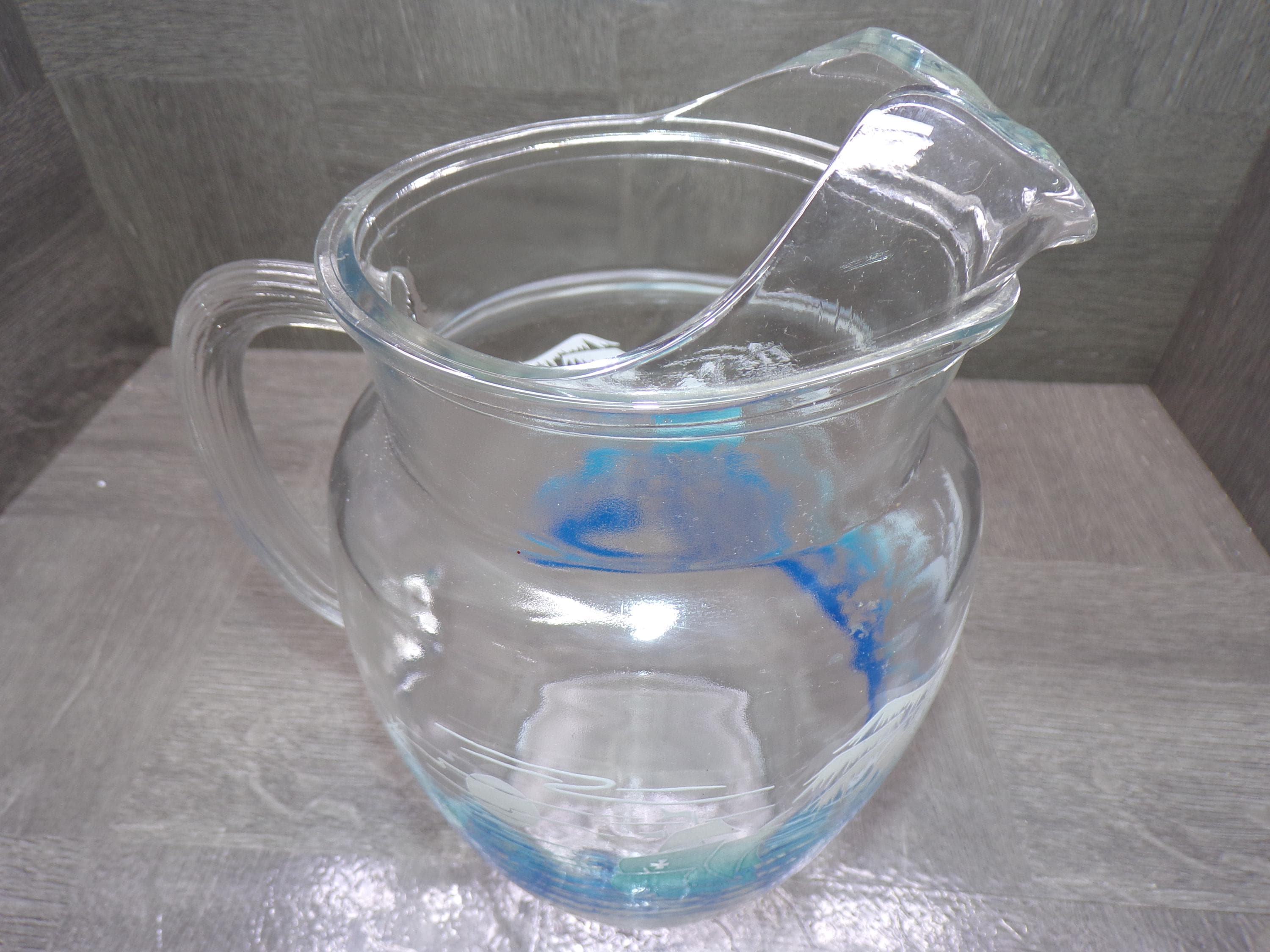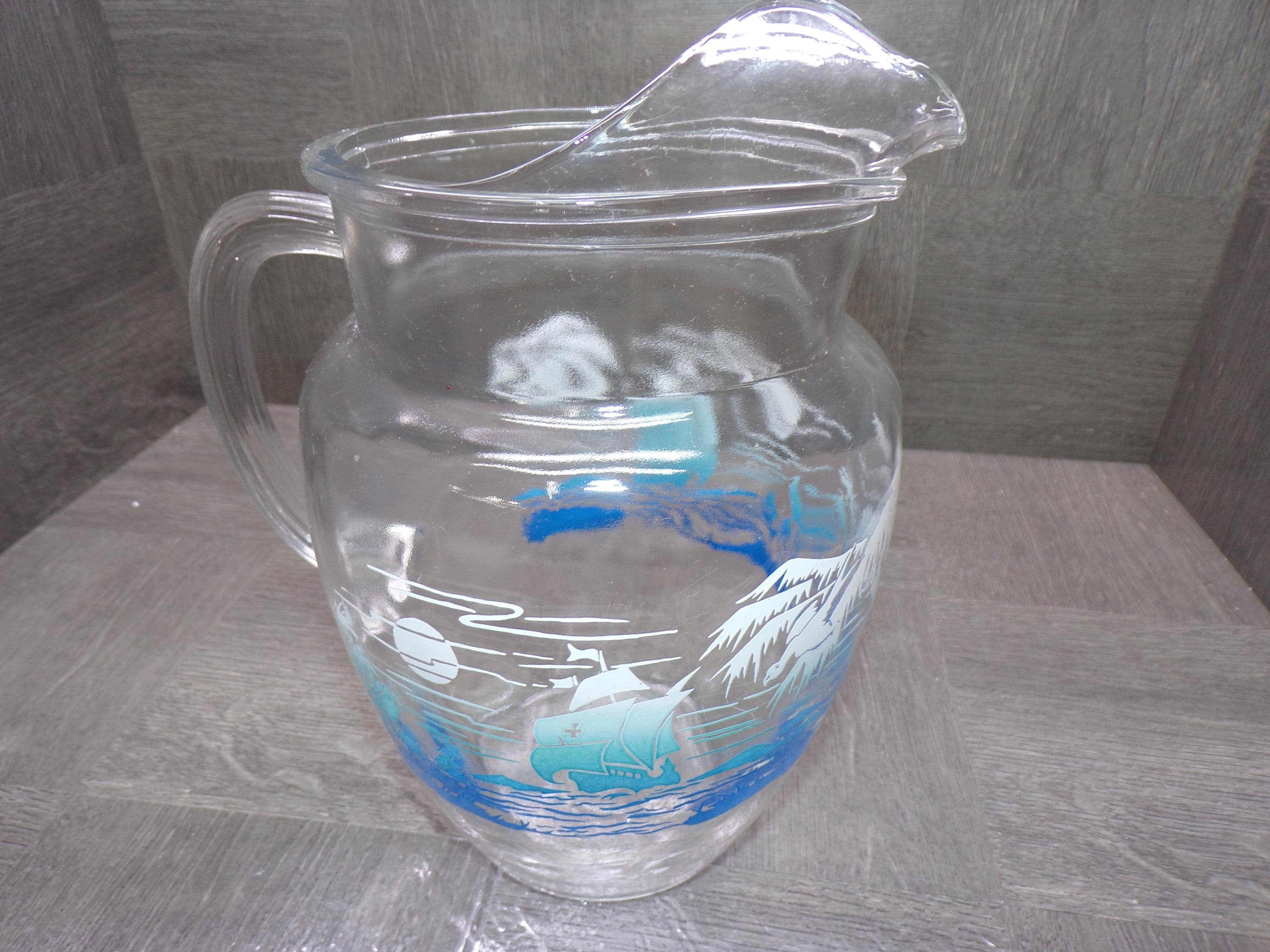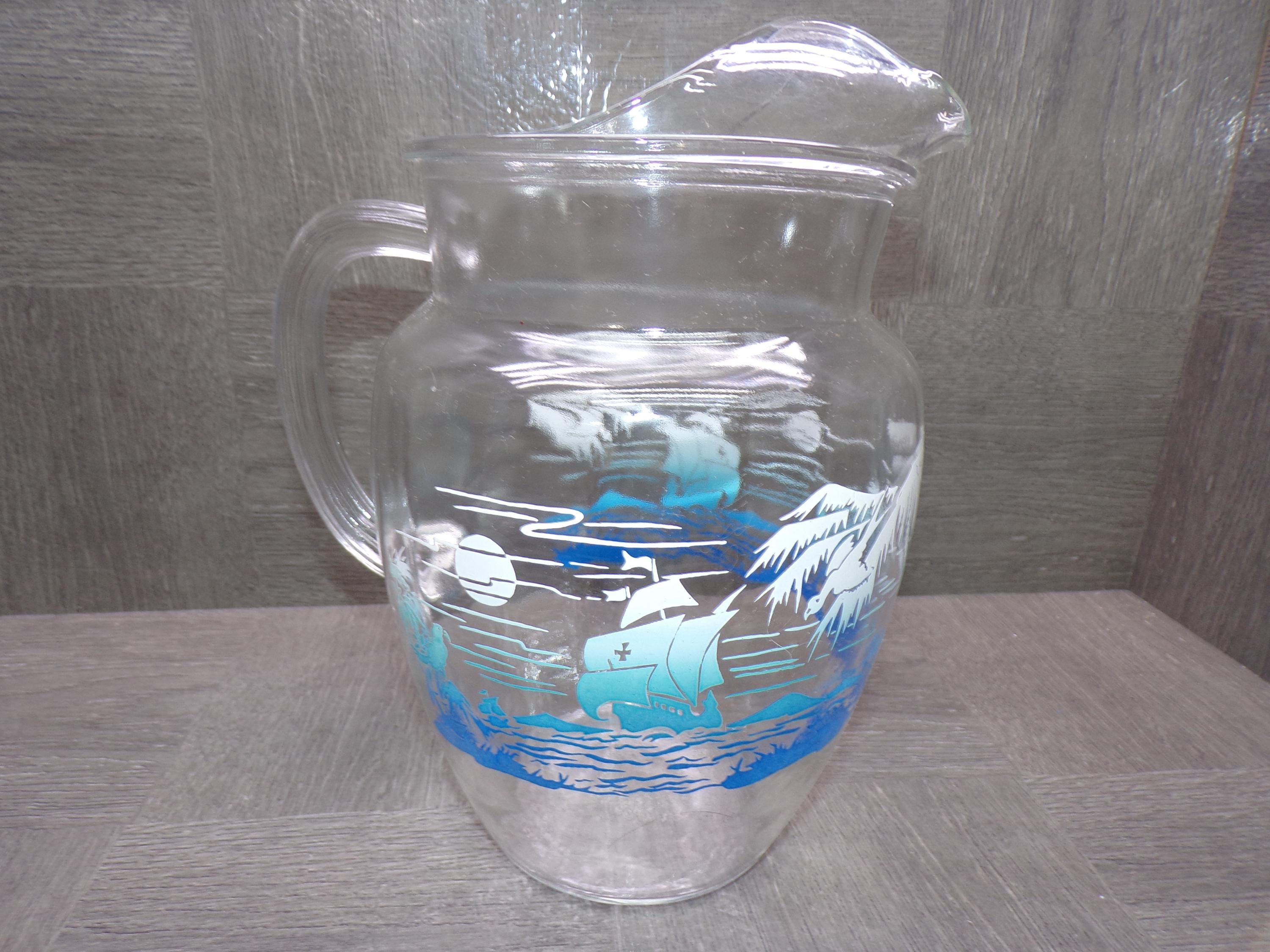 2602 Anchor Hocking 9.5" Vintage 1960's Glass Pitcher w/ Ice Catcher Sailboats, Seagulls & Waves - Great Condition
