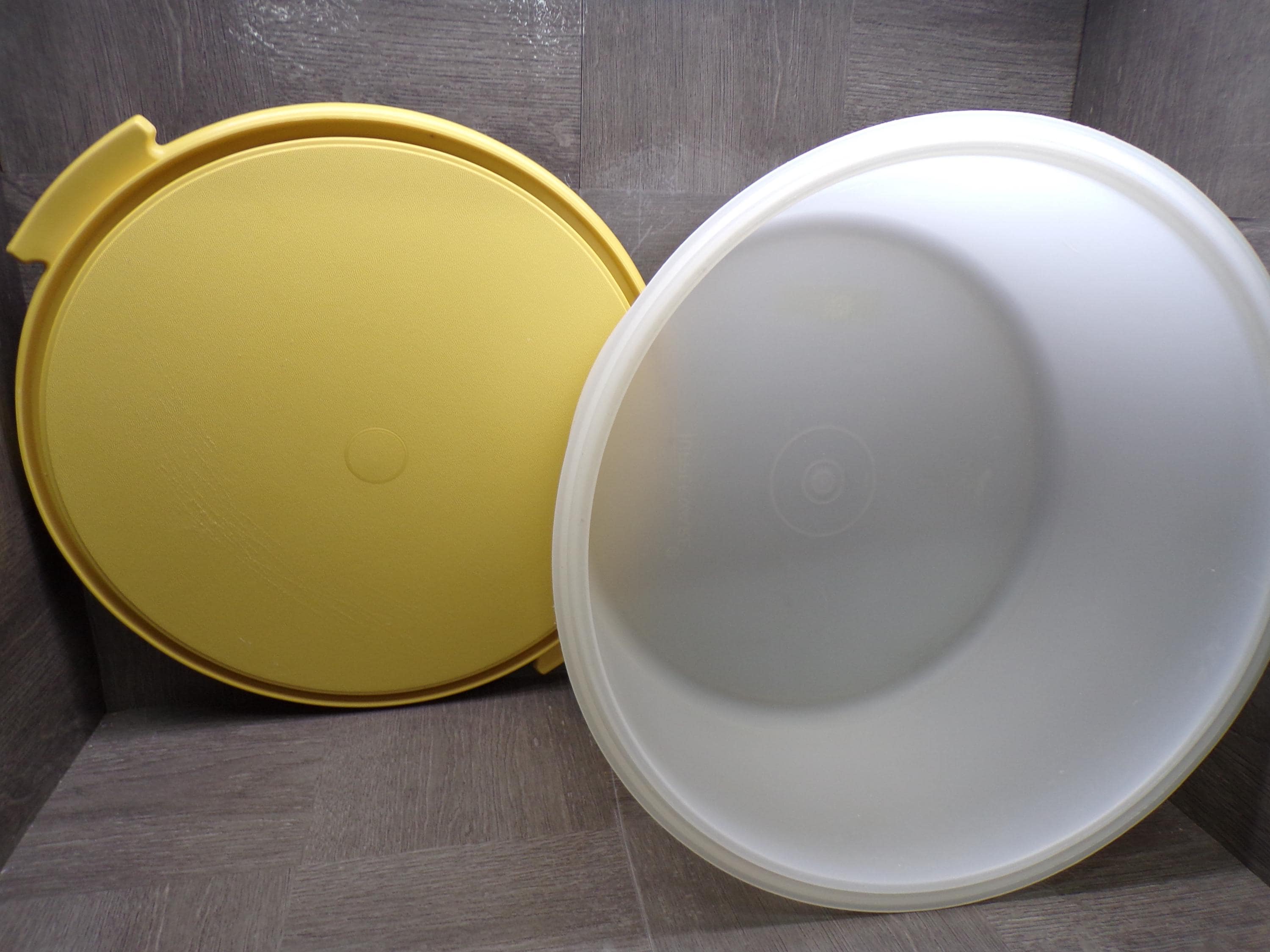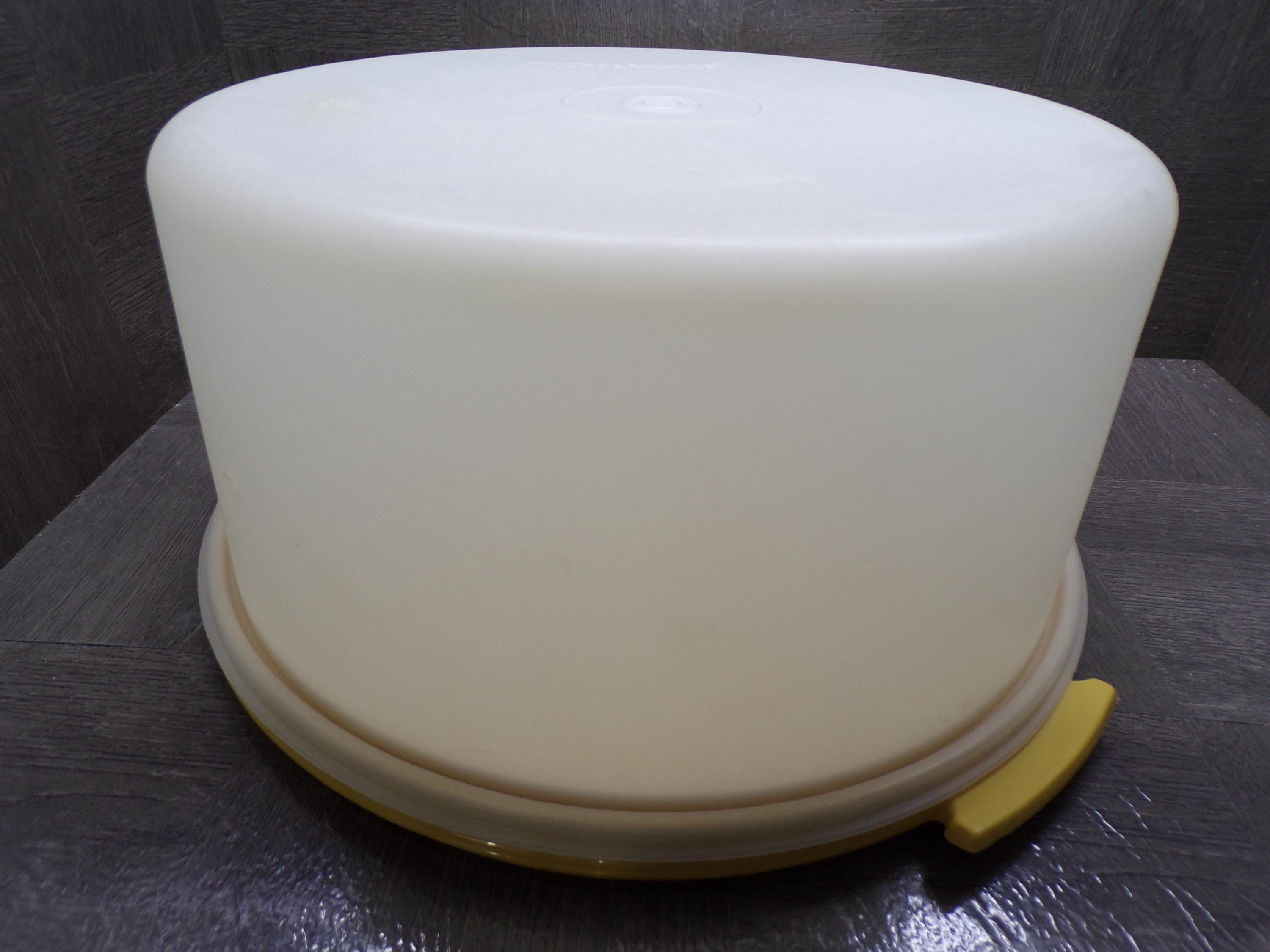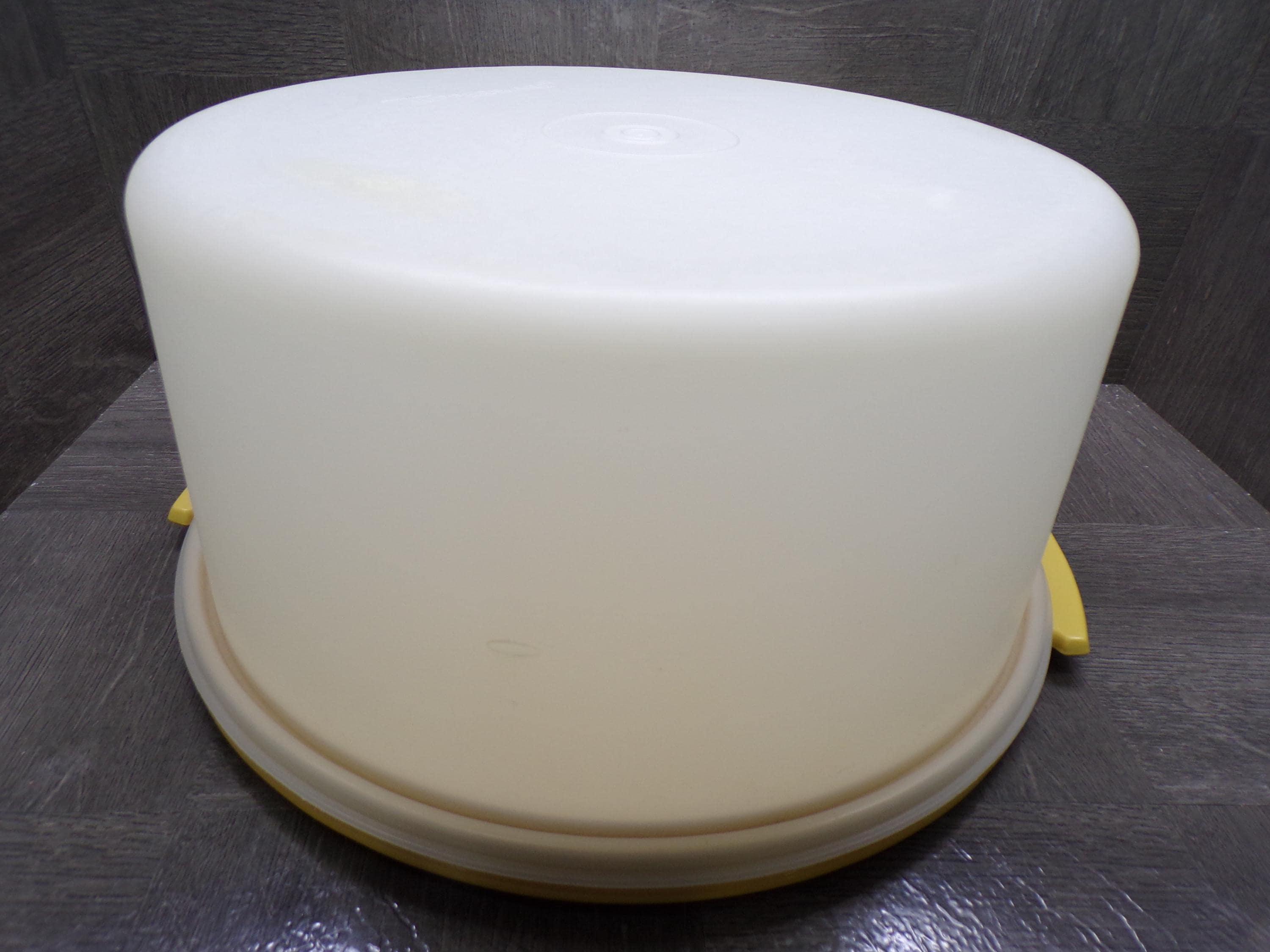 2603 Tupperware 13" Harvest Gold Vintage Cupcake Cake Pie Keeper Carrier with 6" Tall Frosted Cover-Good Cond Sm Melt Mark on Dome No Handle