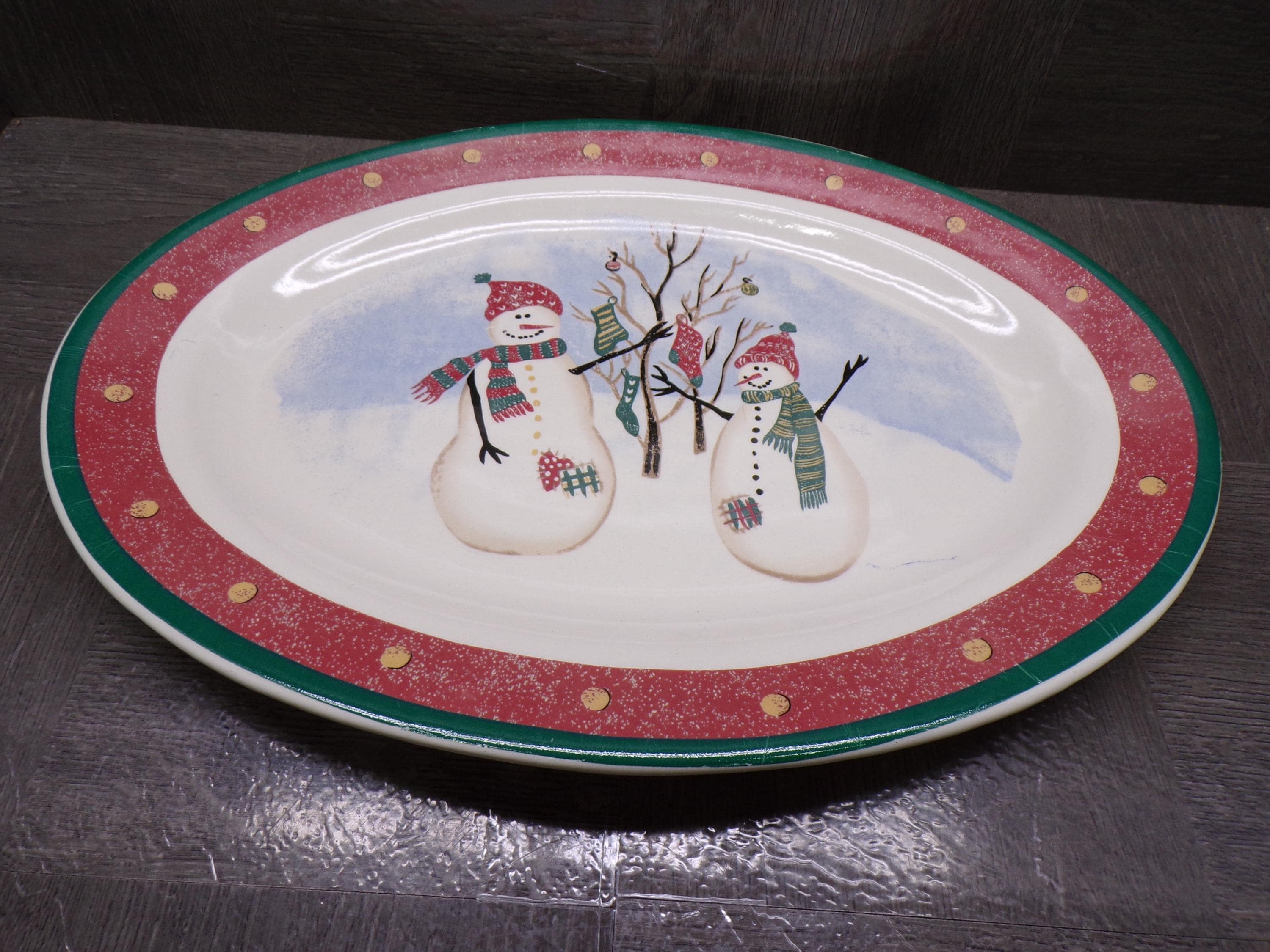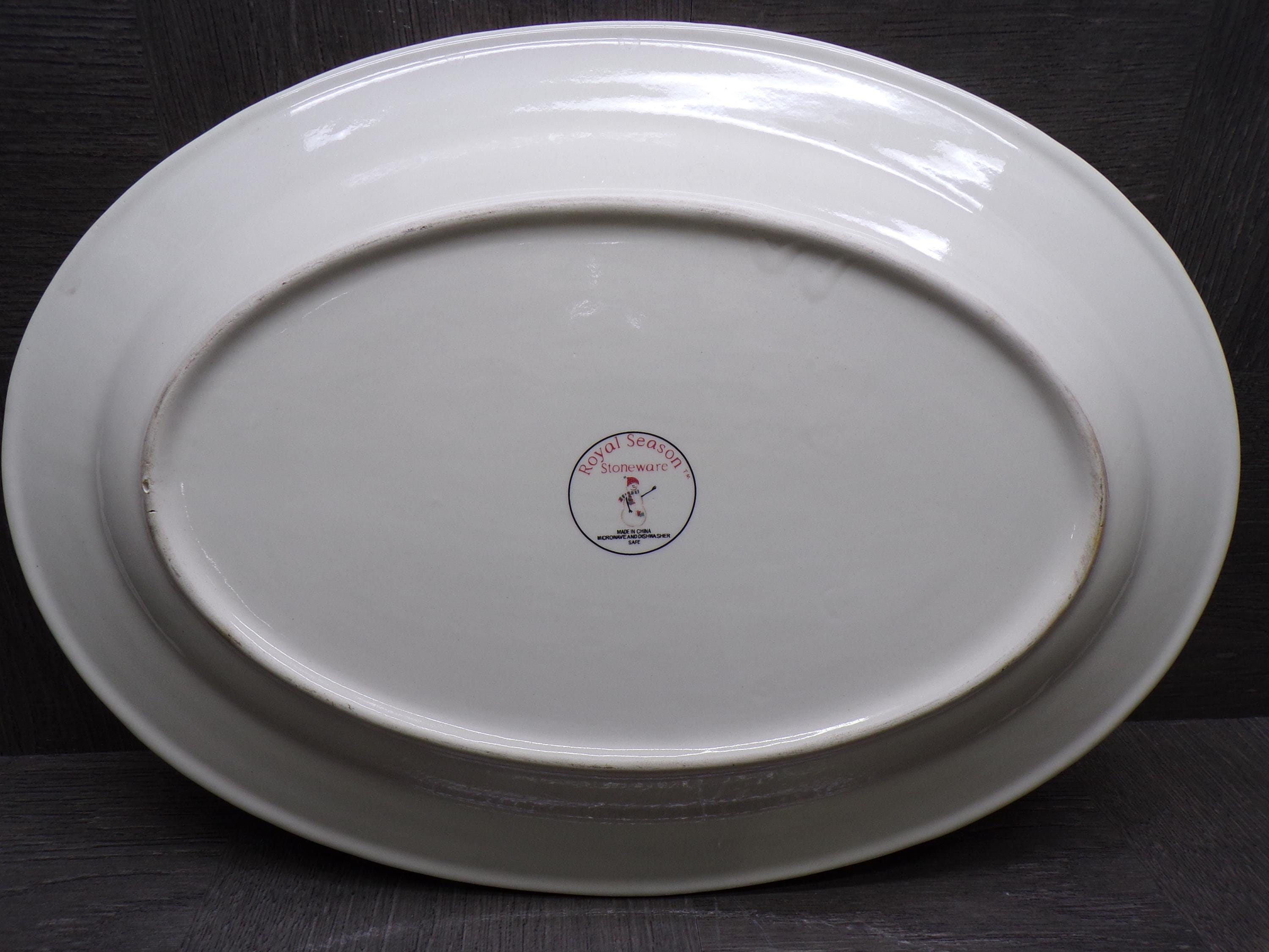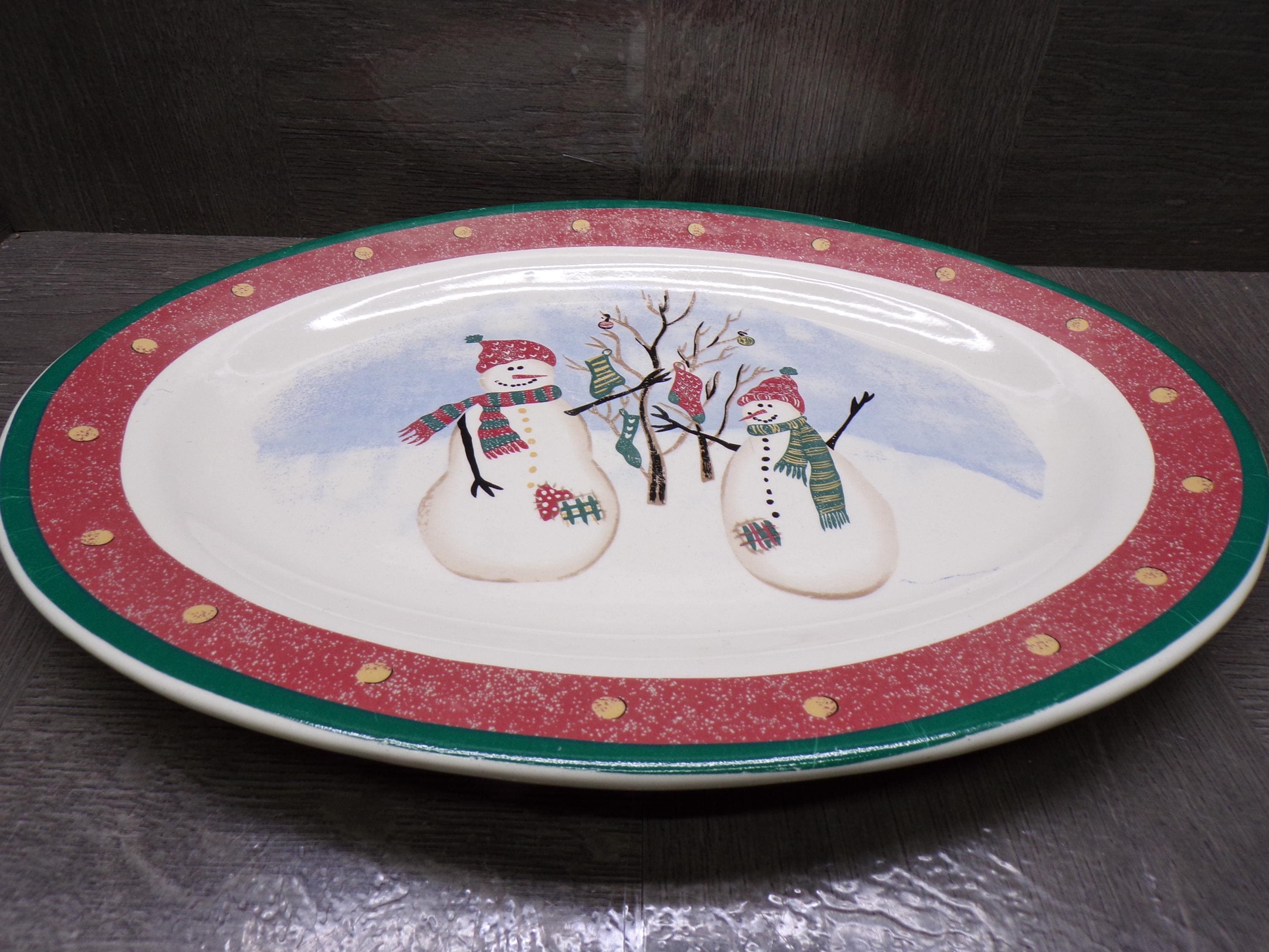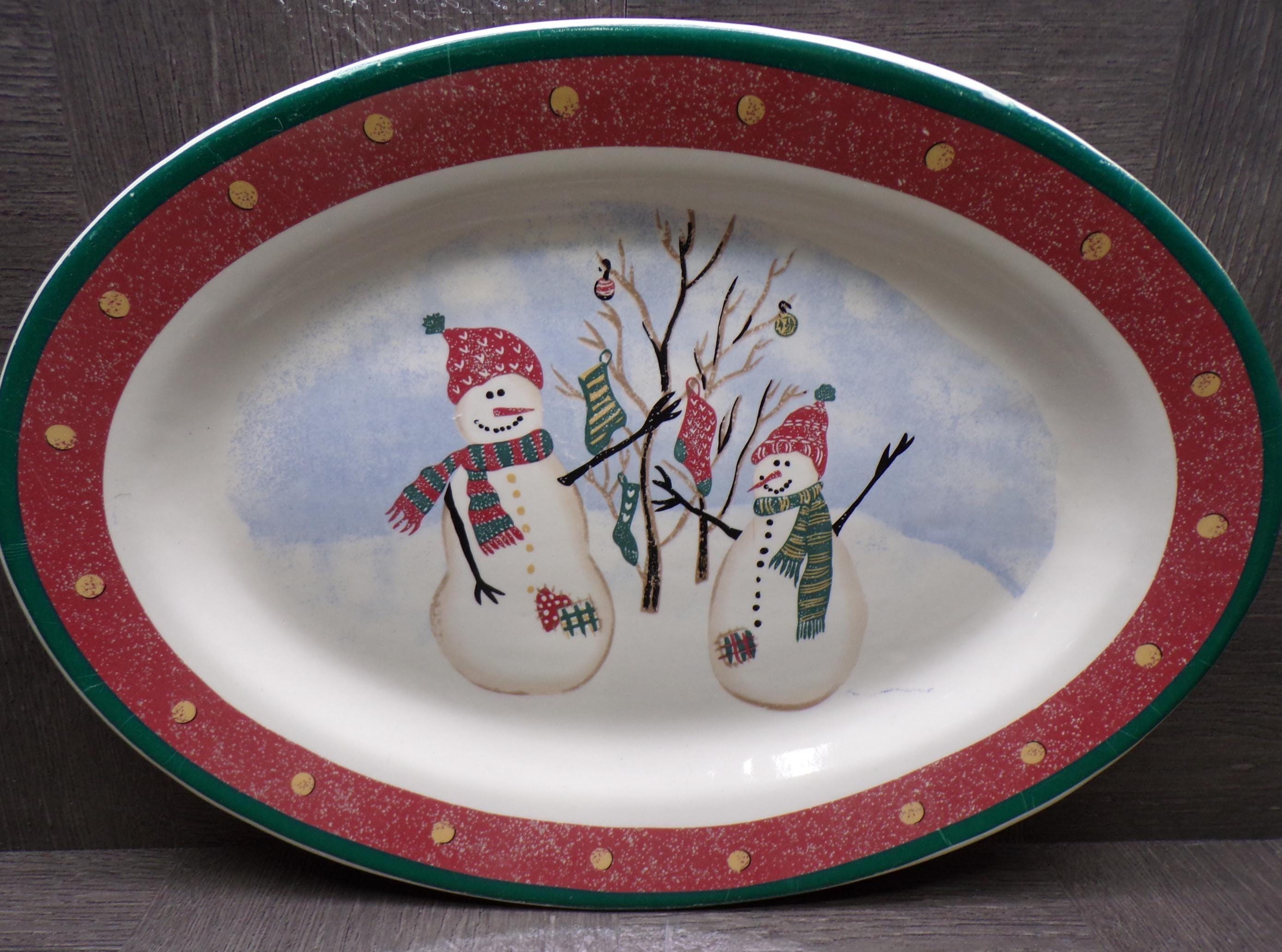 2603 Royal Seasons Vintage Stoneware Snowman Snowflake Christmas 14" x 10" Oval Serving Tray Platter - Great Condition