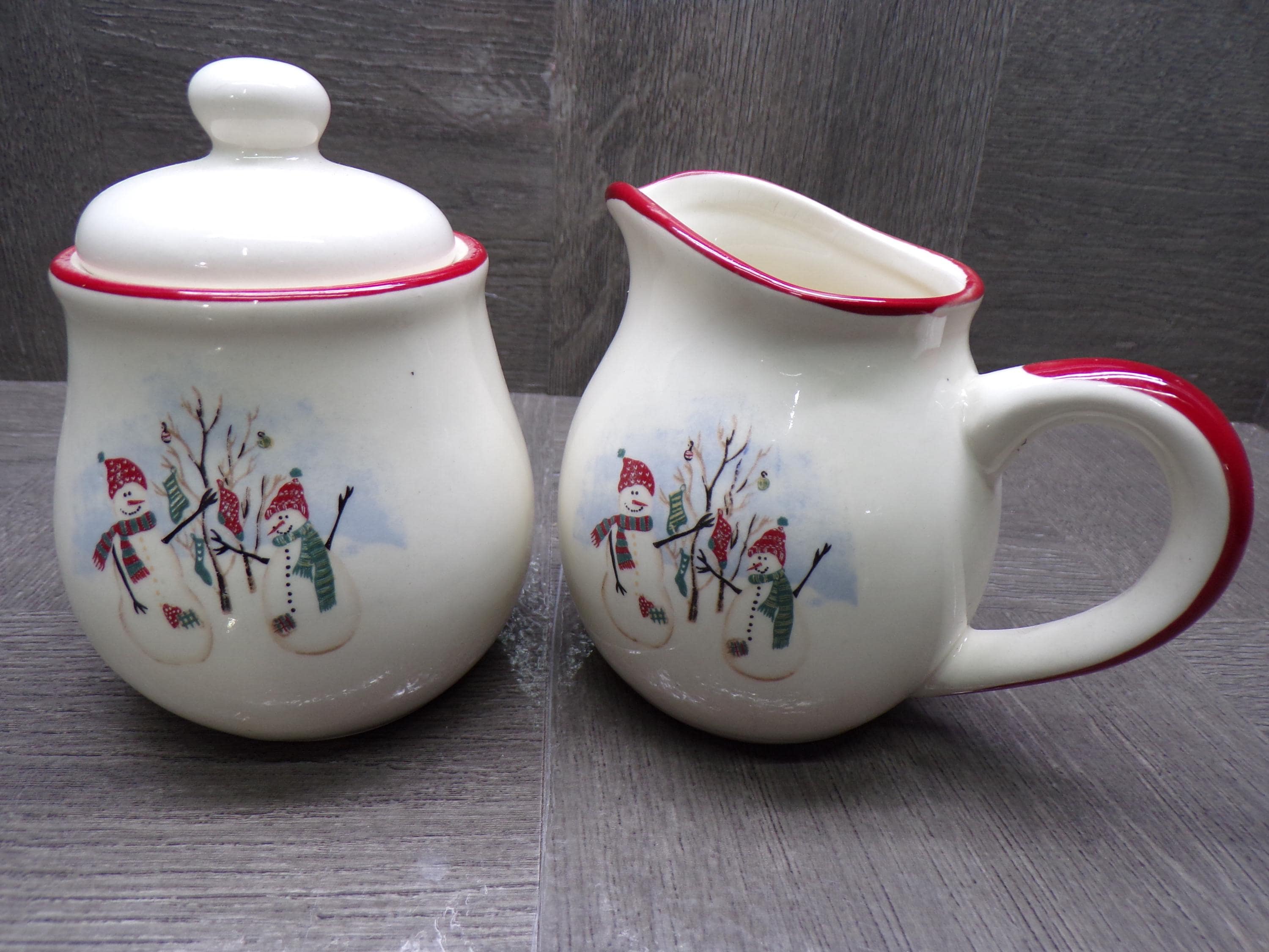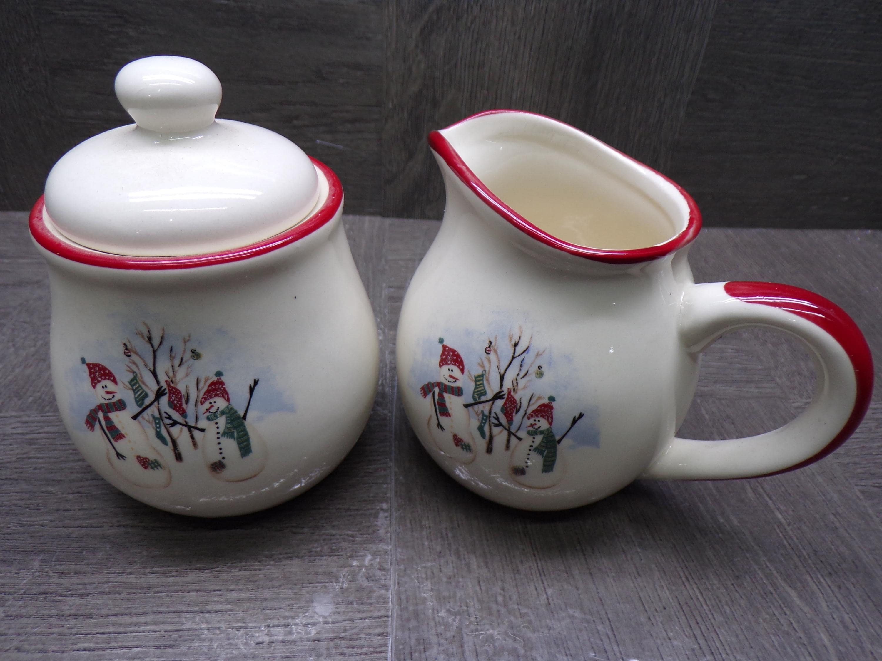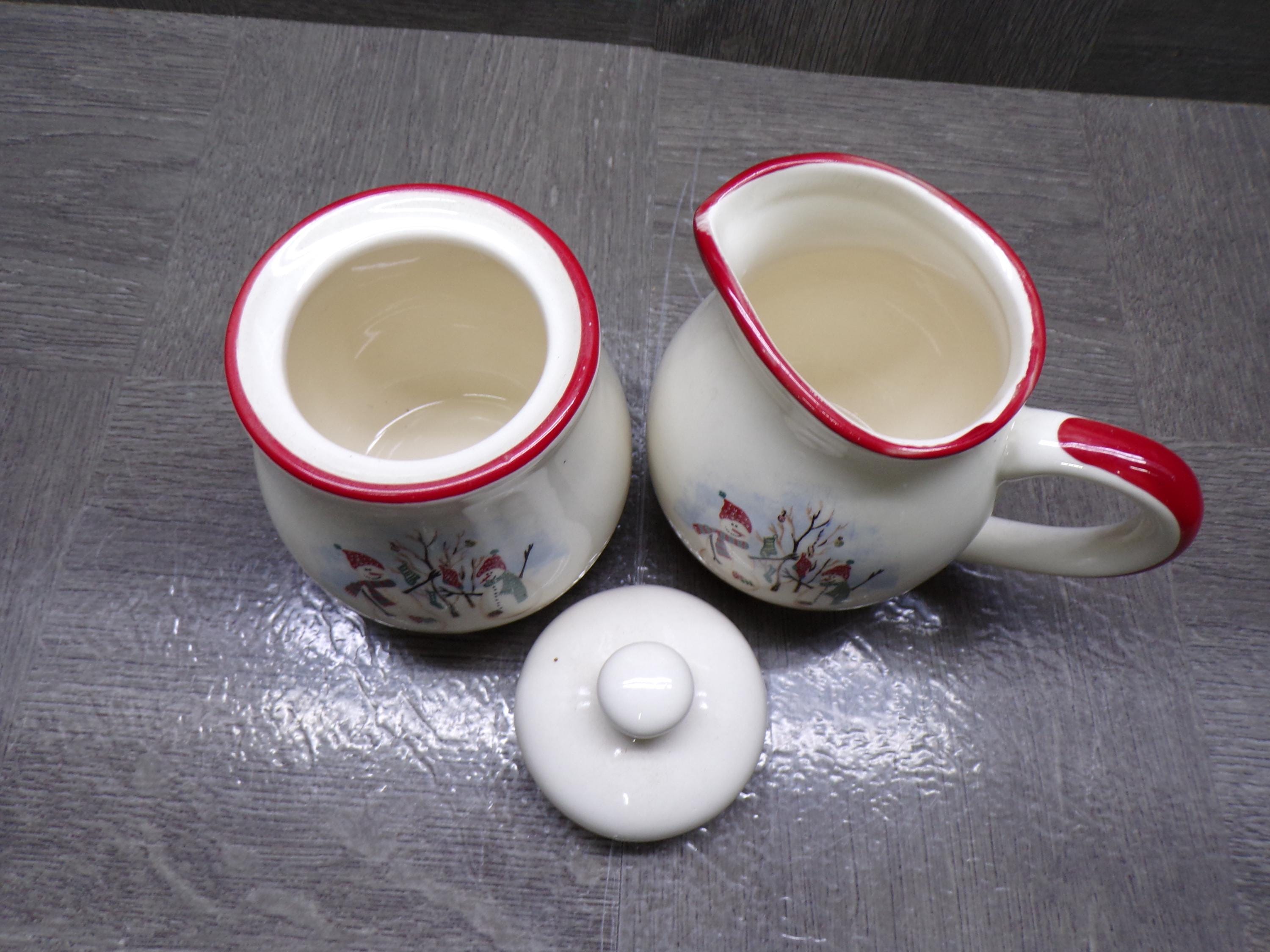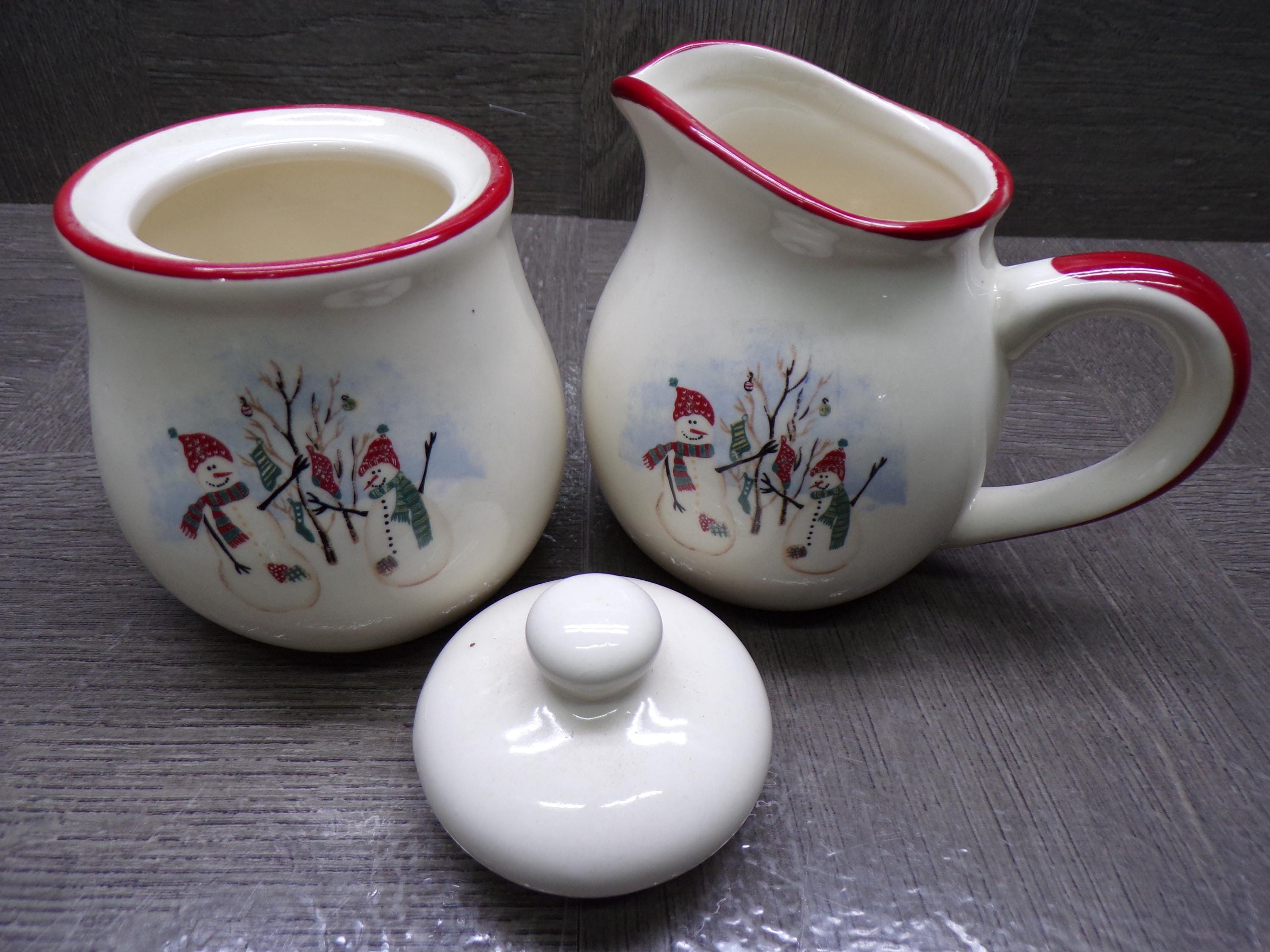 2603 Royal Seasons Vintage Stoneware Snowman Snowflake Christmas Cream & Sugar Set w/ Lid - Great Condition