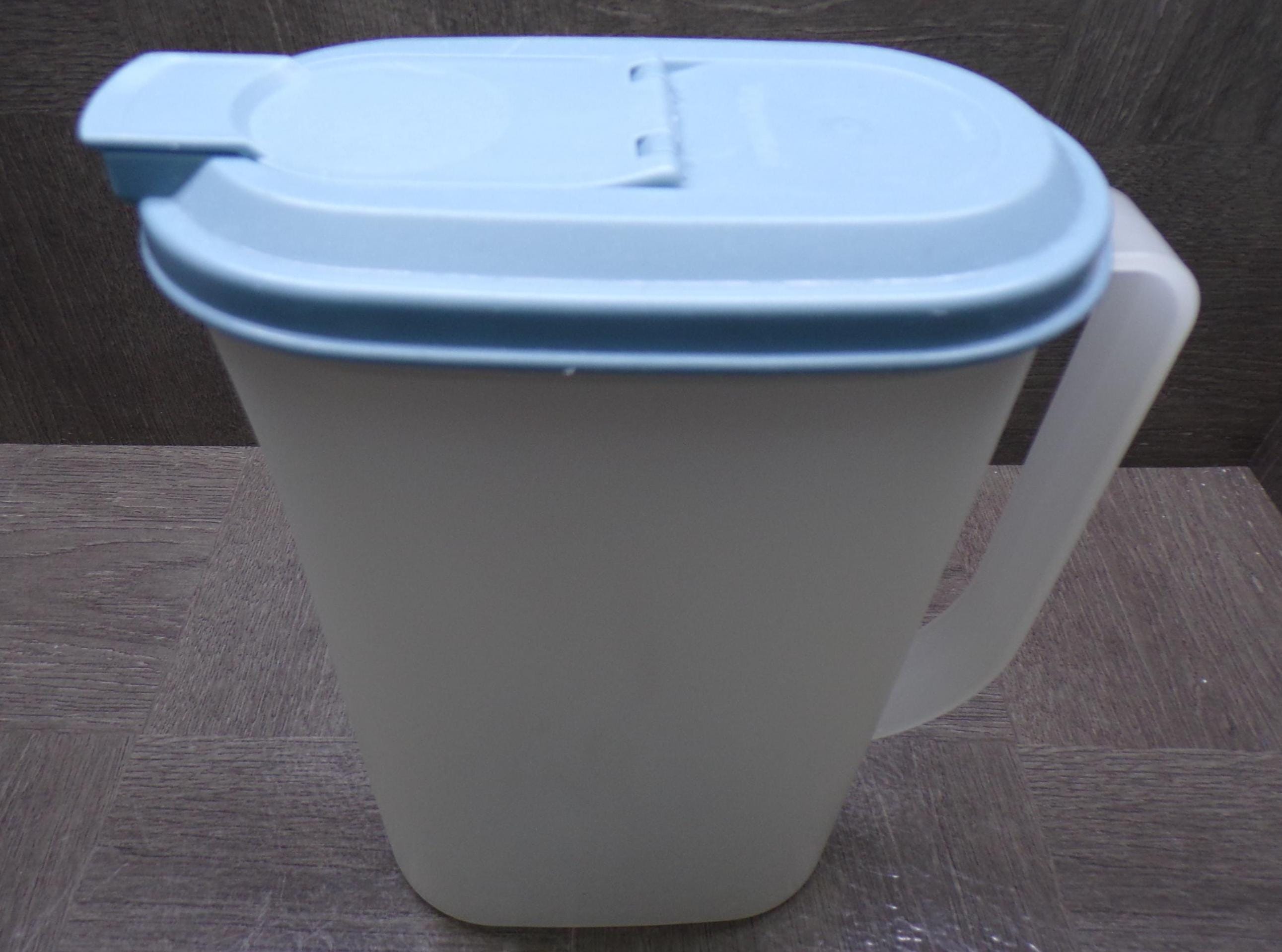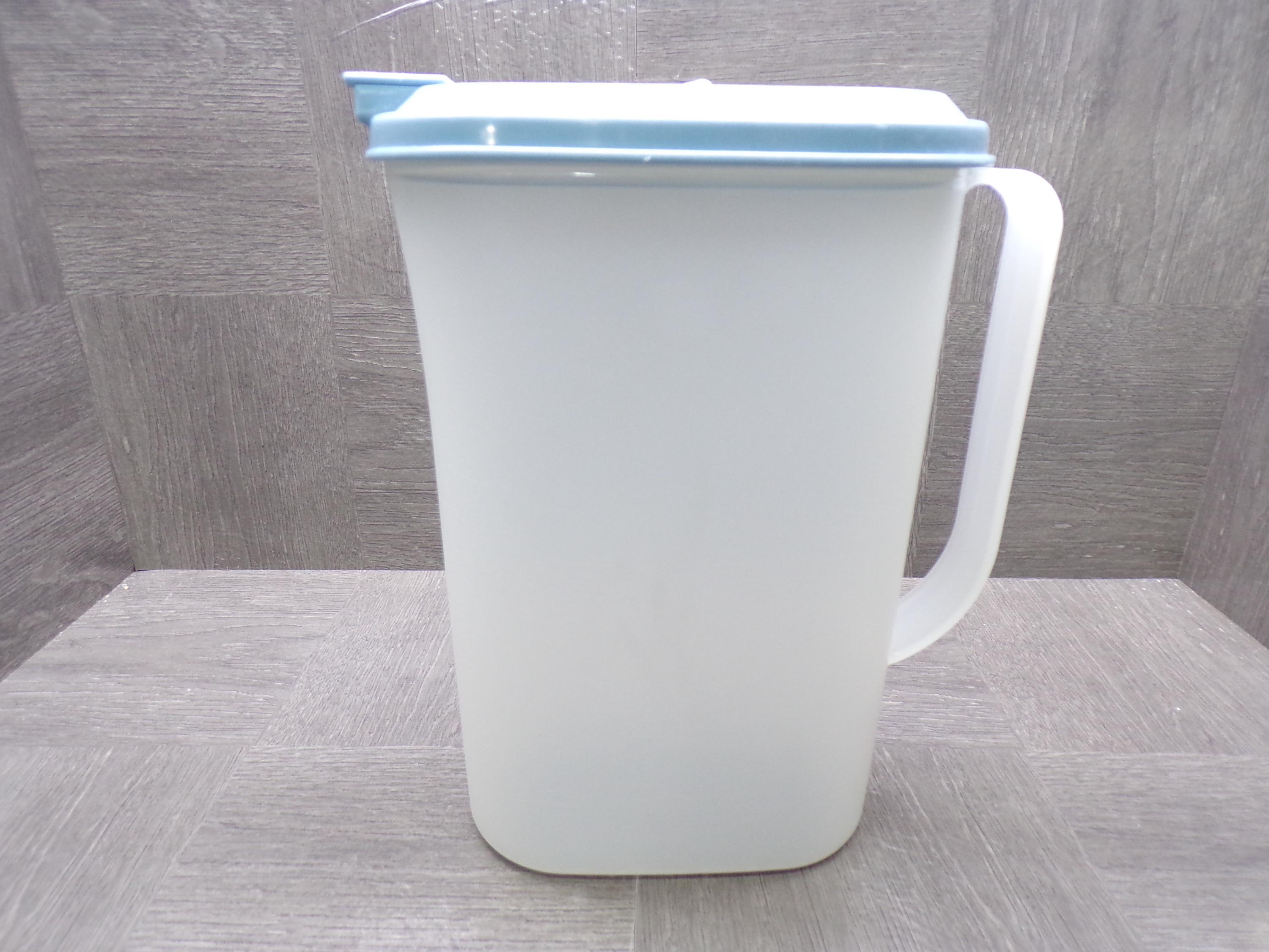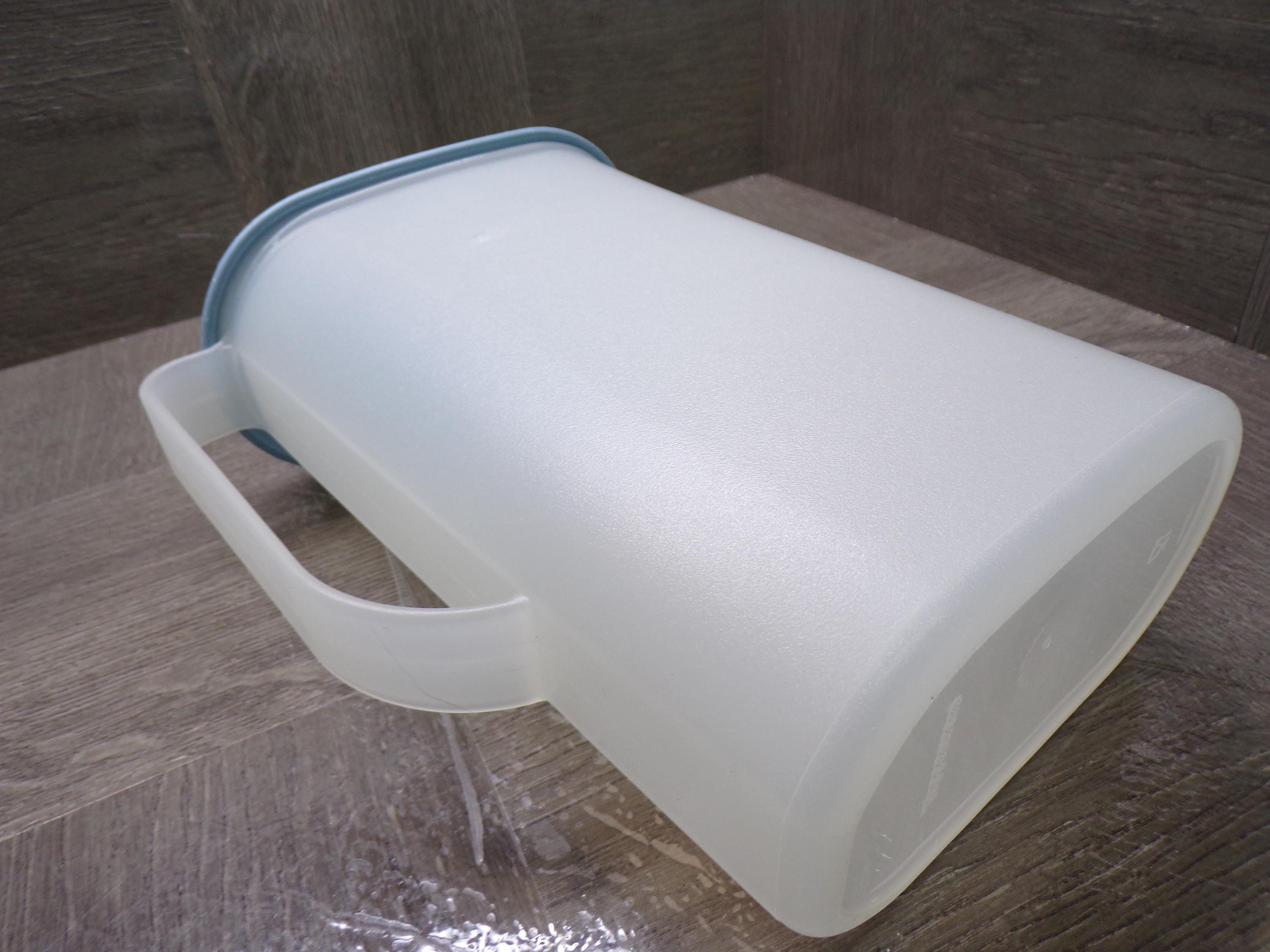 2603 Tupperware Slimline 2 qt. Juice Pitcher 5.5" x 3" x 9" Tall Frosted Clear w/ Blue Lid - Great Condition