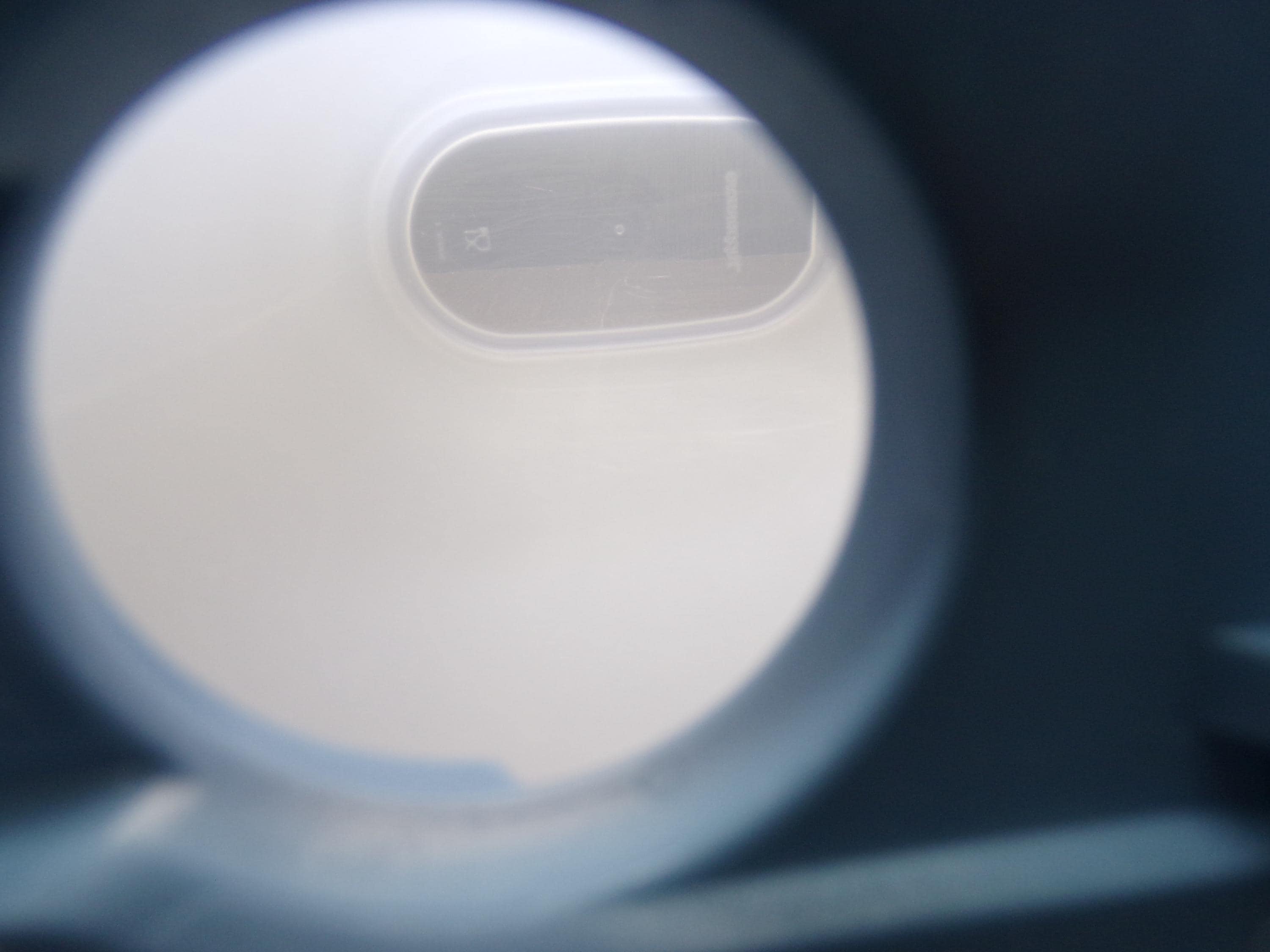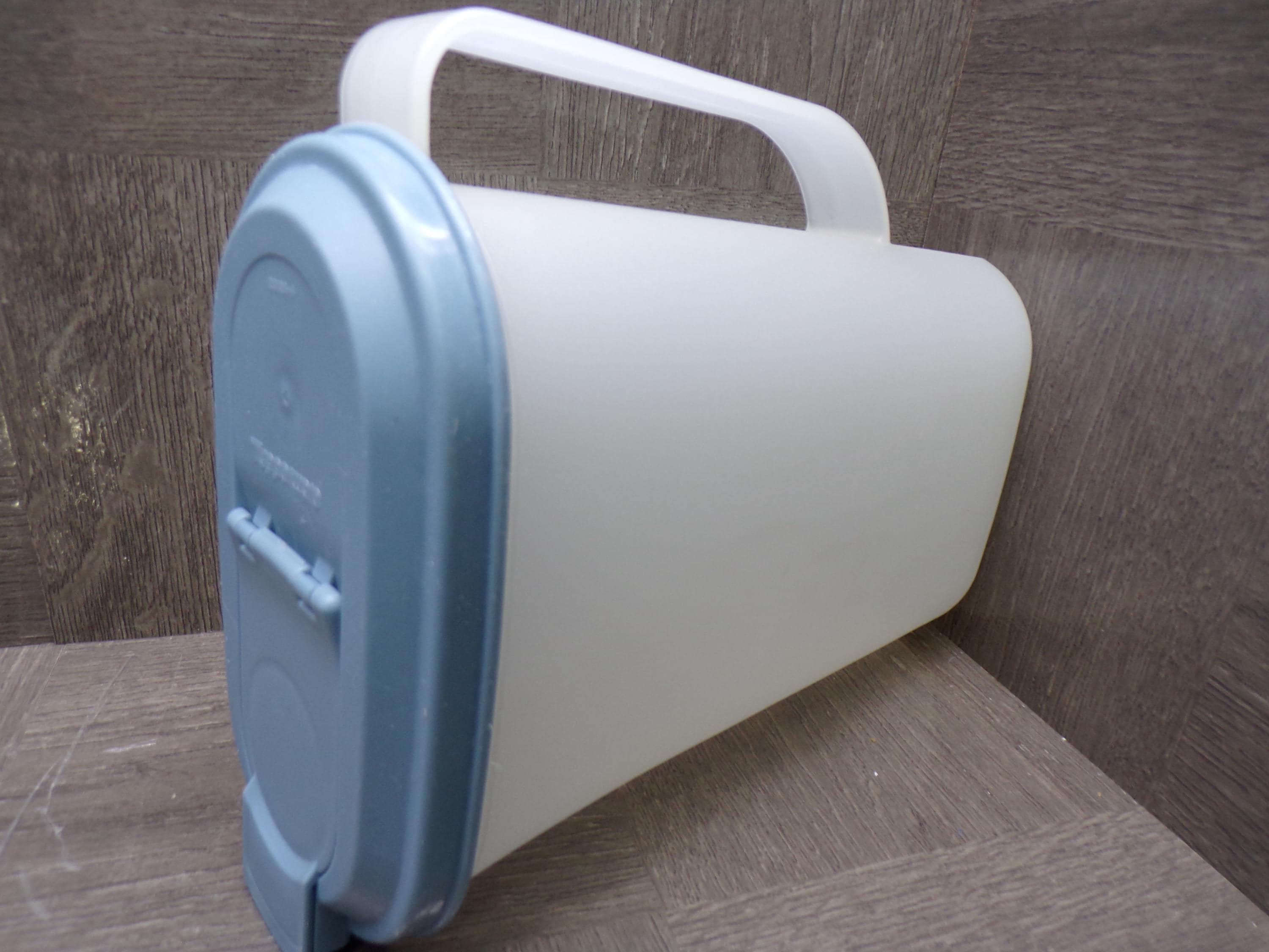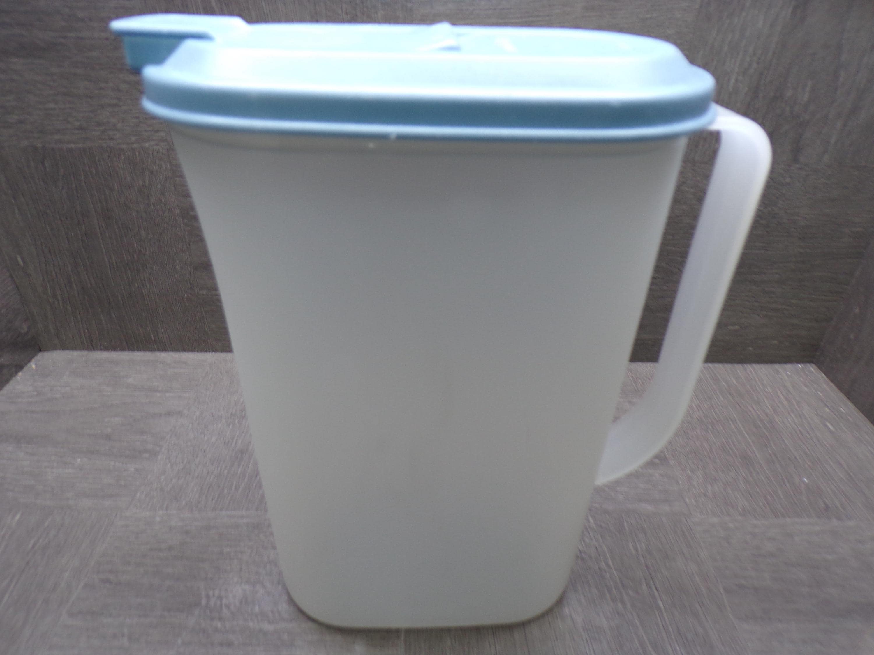 2603 Tupperware Slimline 2 qt. Juice Pitcher 5.5" x 3" x 9" Tall Frosted Clear w/ Blue Lid - Great Condition