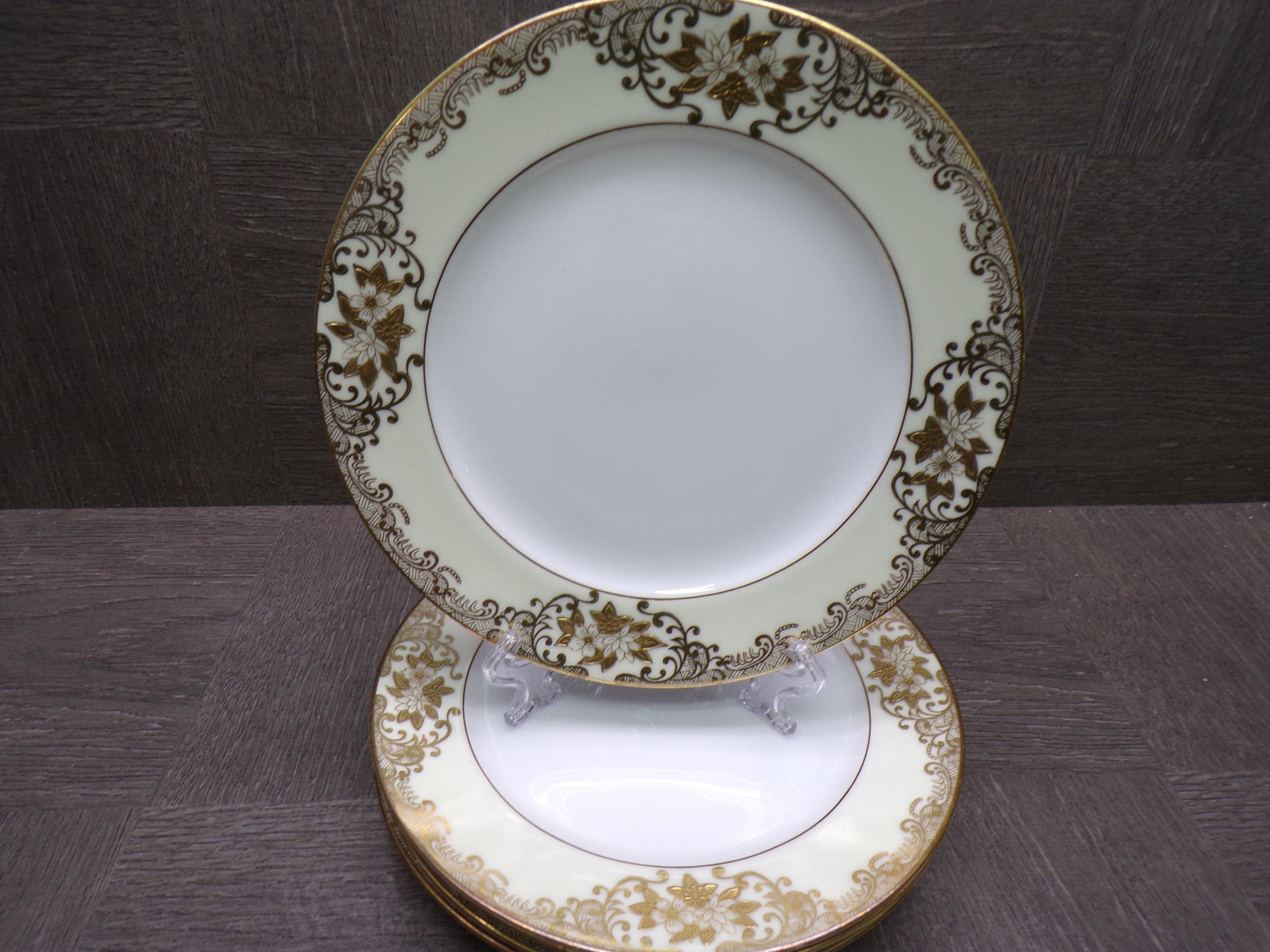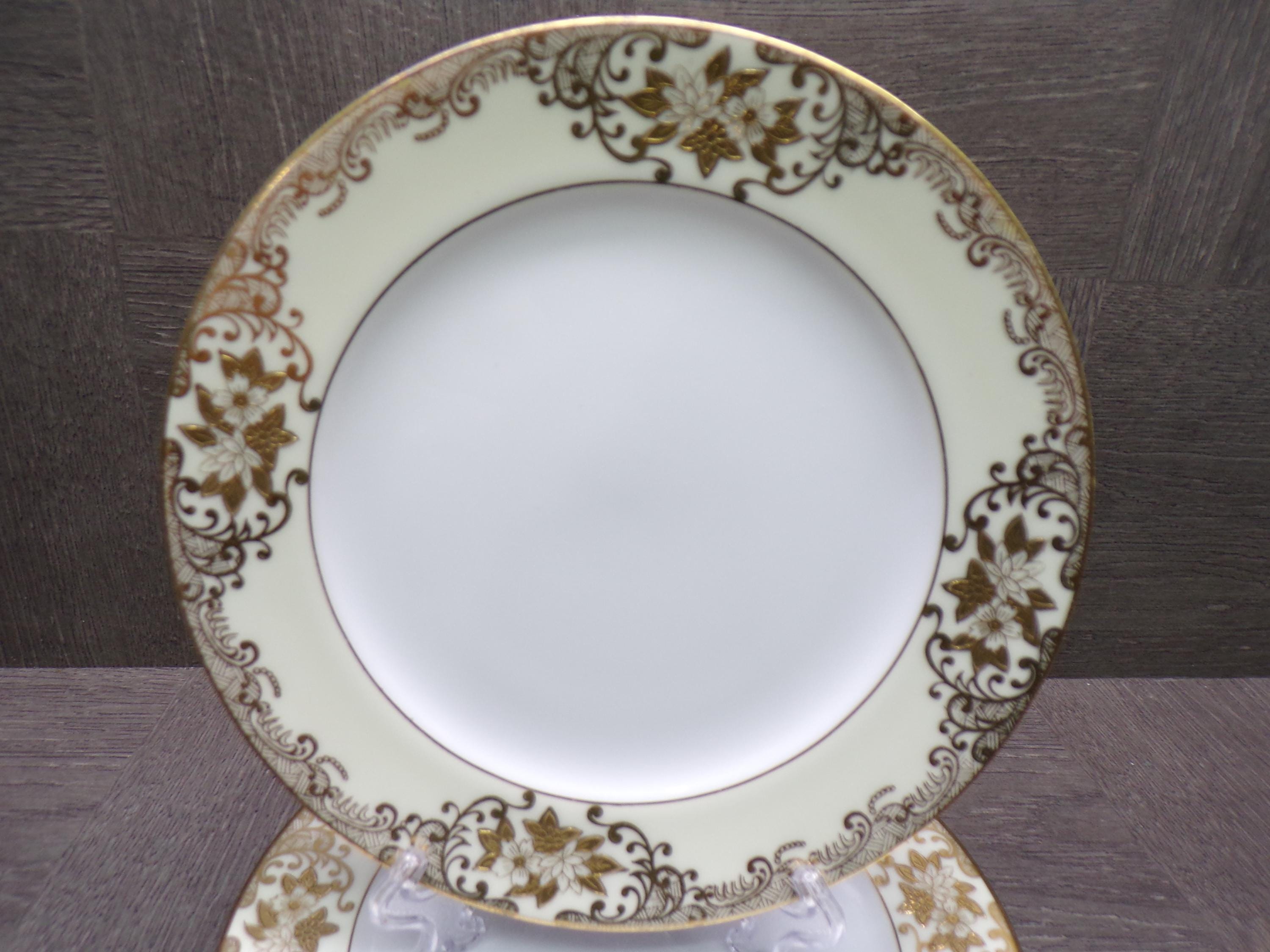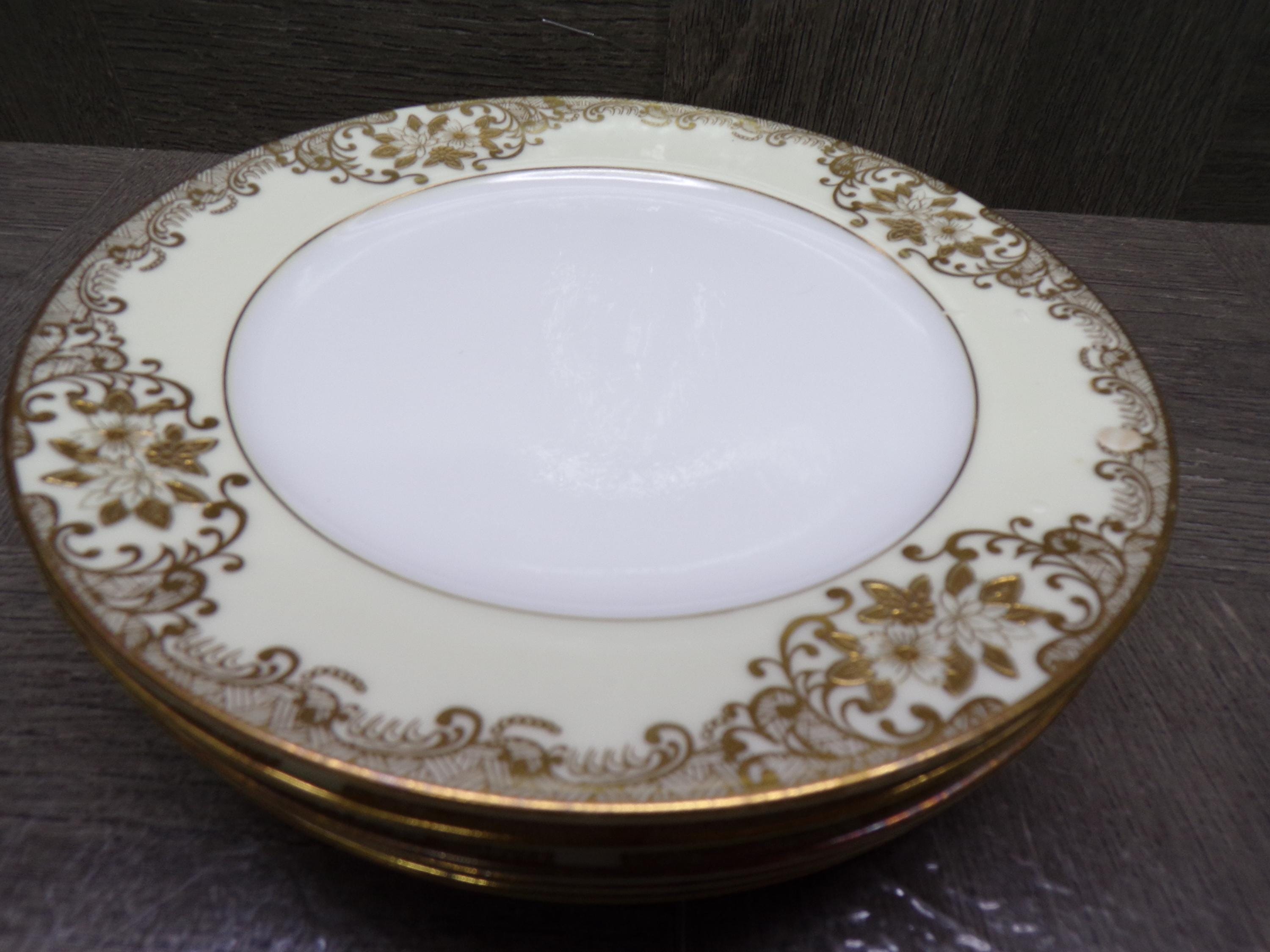 2603 Meito Vintage 1936 Hand-painted China 6.5" Bread / Dessert Plates Set of 5 White Center 22 kt Gold Flowers & Scrolls w/ Cream Rim Made in Japan - Great Condition Little Wear