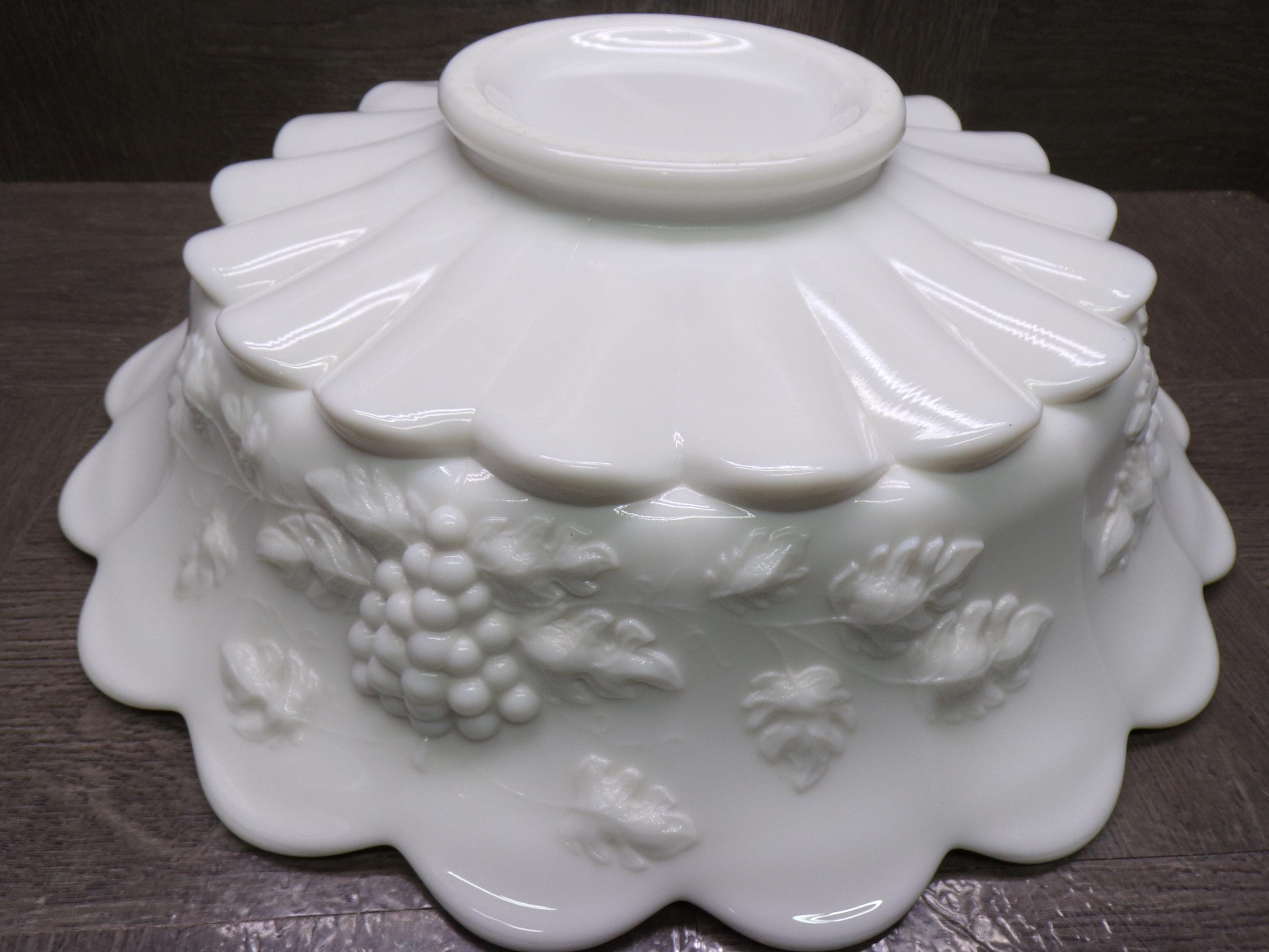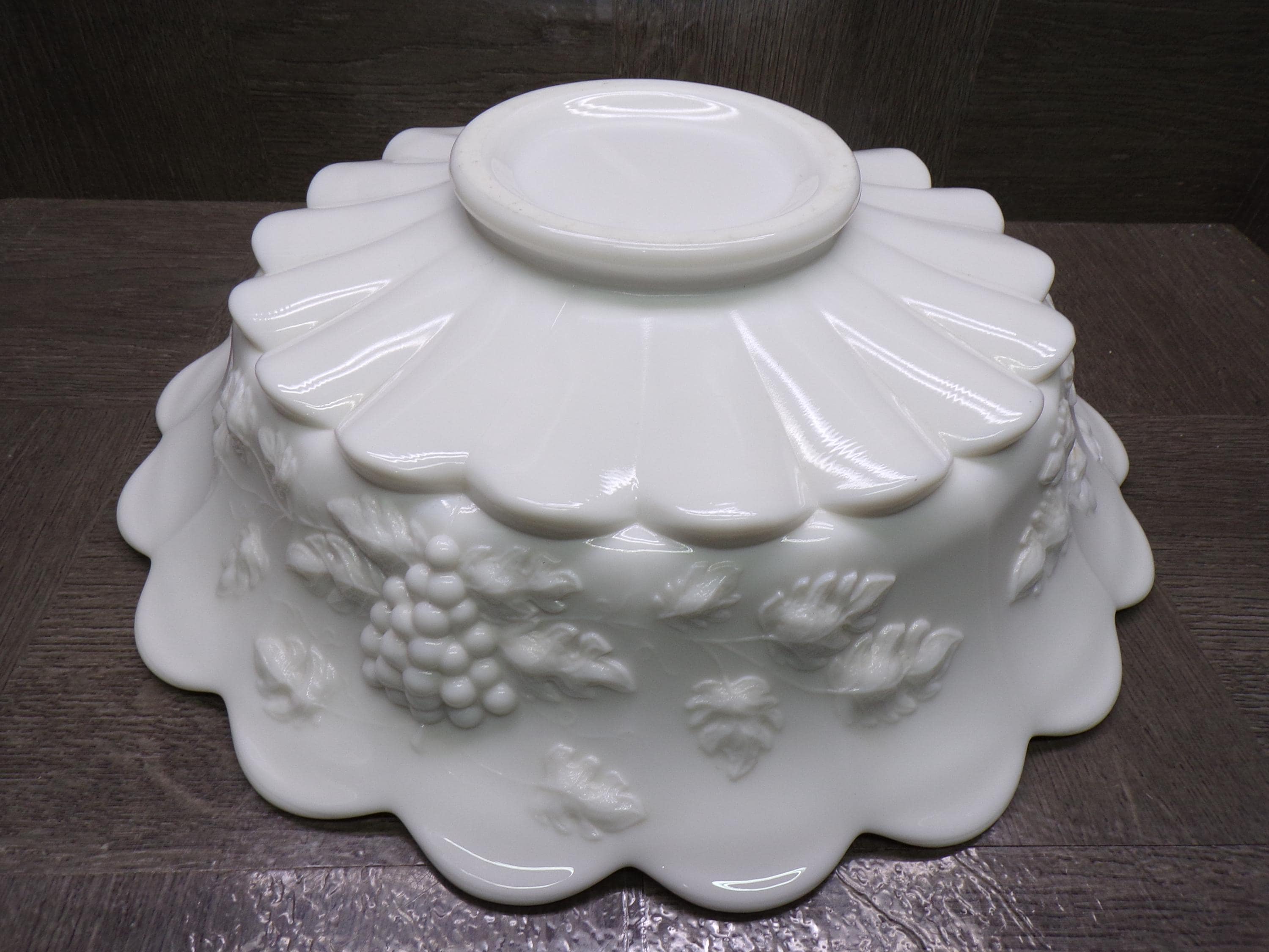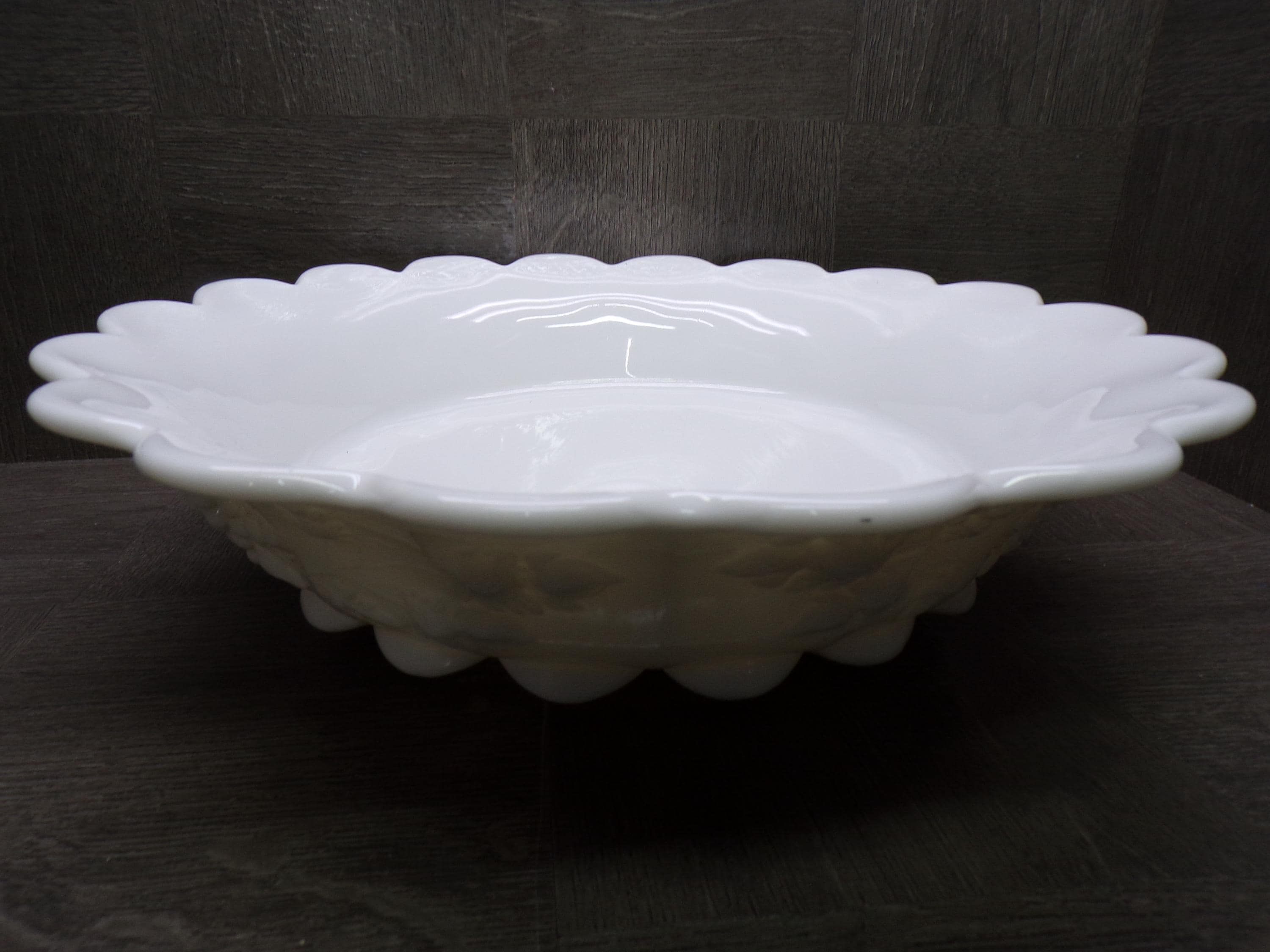 2603 Westmoreland Vintage Milk Glass 12.5" x 3.5" Tall Raised Grape and Leaf Footed Scalloped Rim Bowl w/ Westmoreland Stamp - Great Condition
