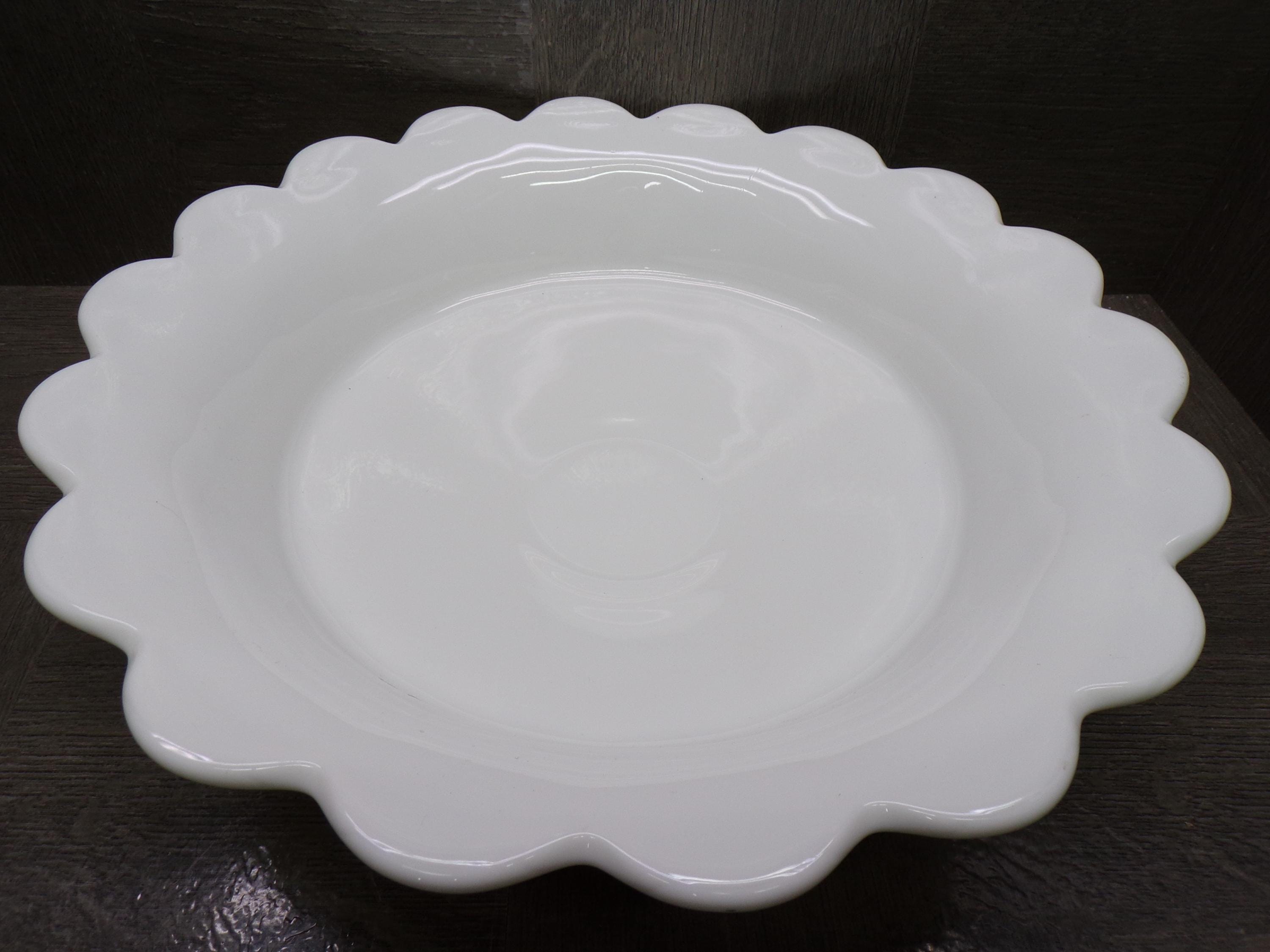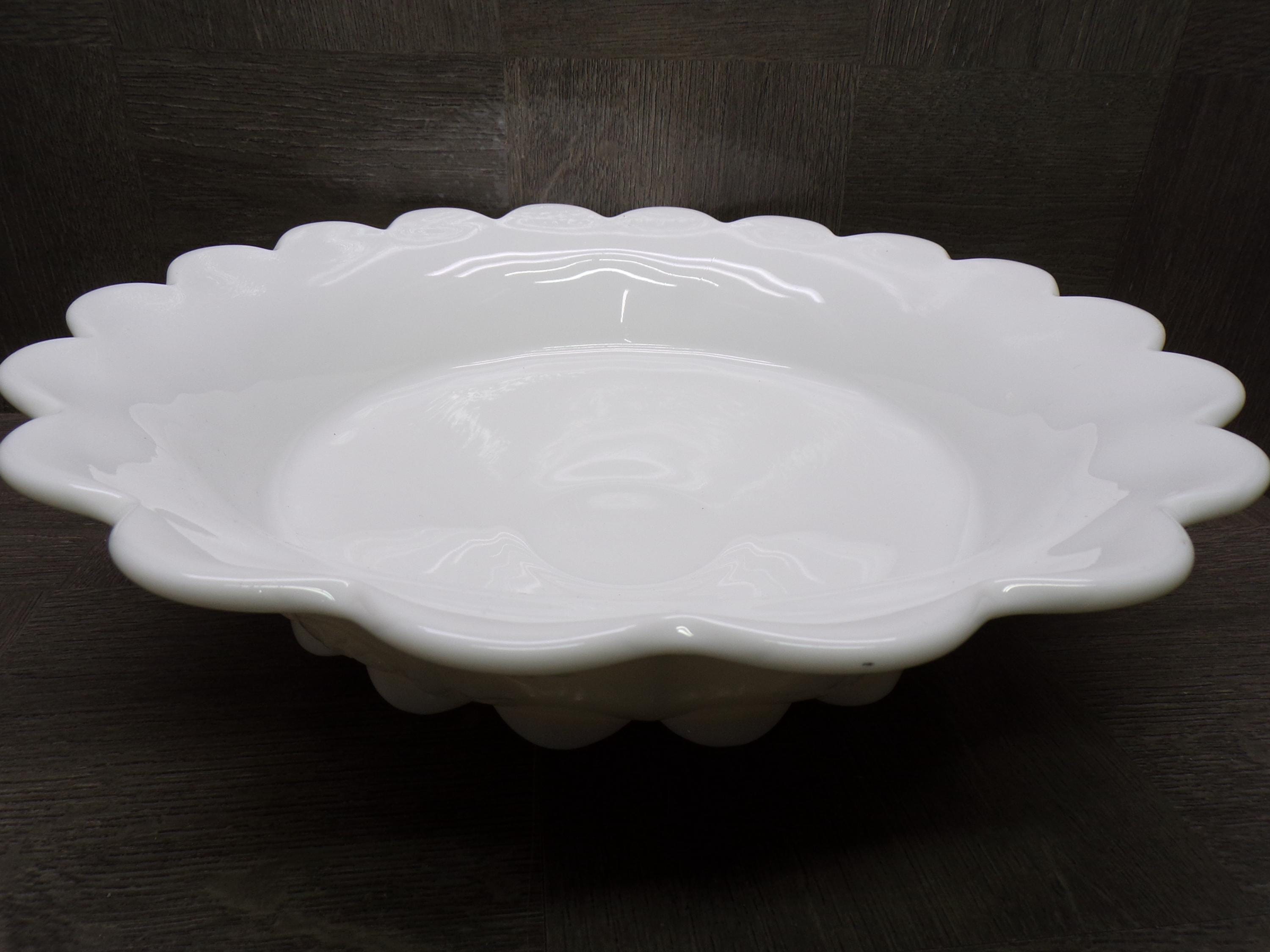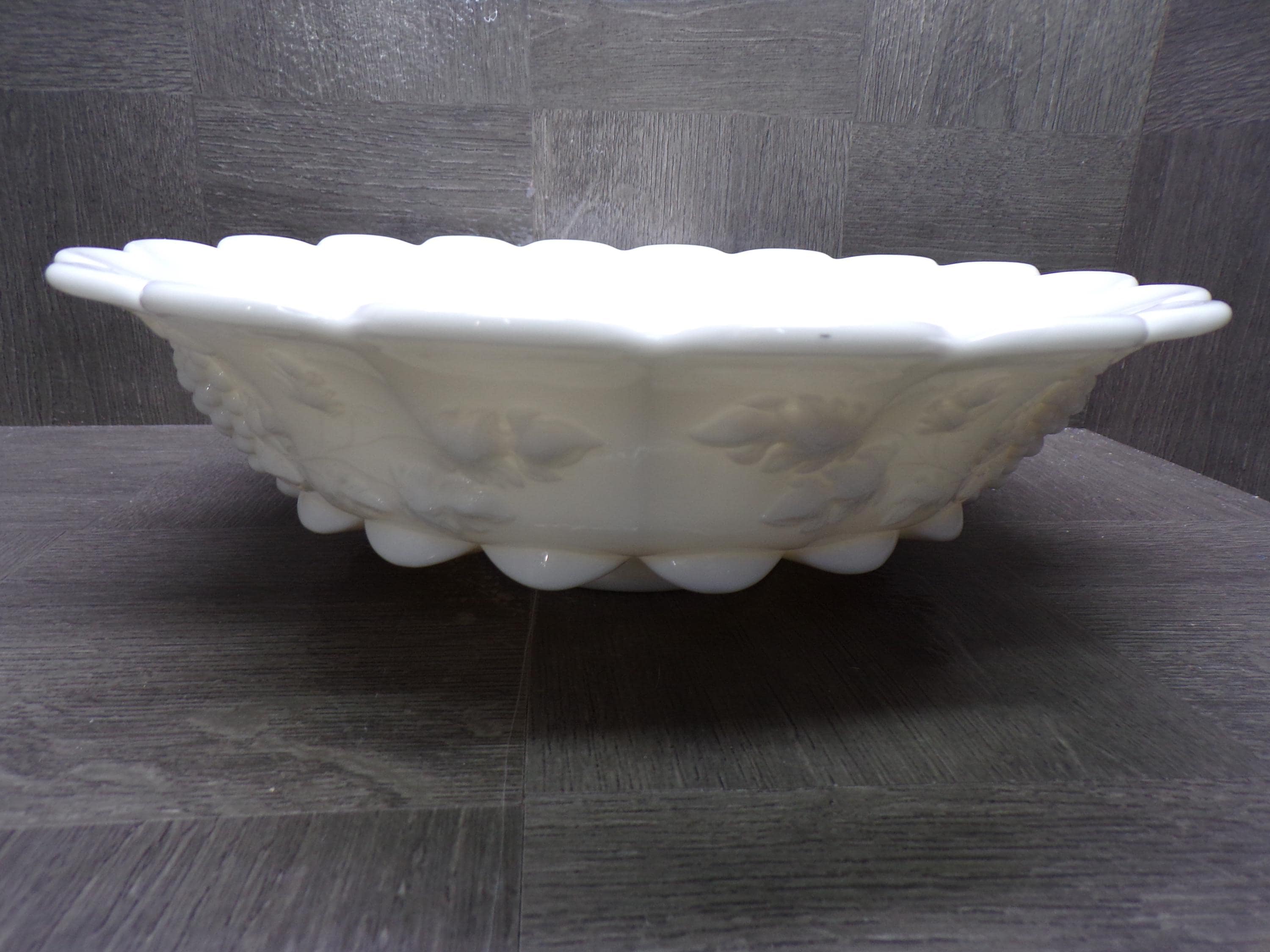 2603 Westmoreland Vintage Milk Glass 12.5" x 3.5" Tall Raised Grape and Leaf Footed Scalloped Rim Bowl w/ Westmoreland Stamp - Great Condition