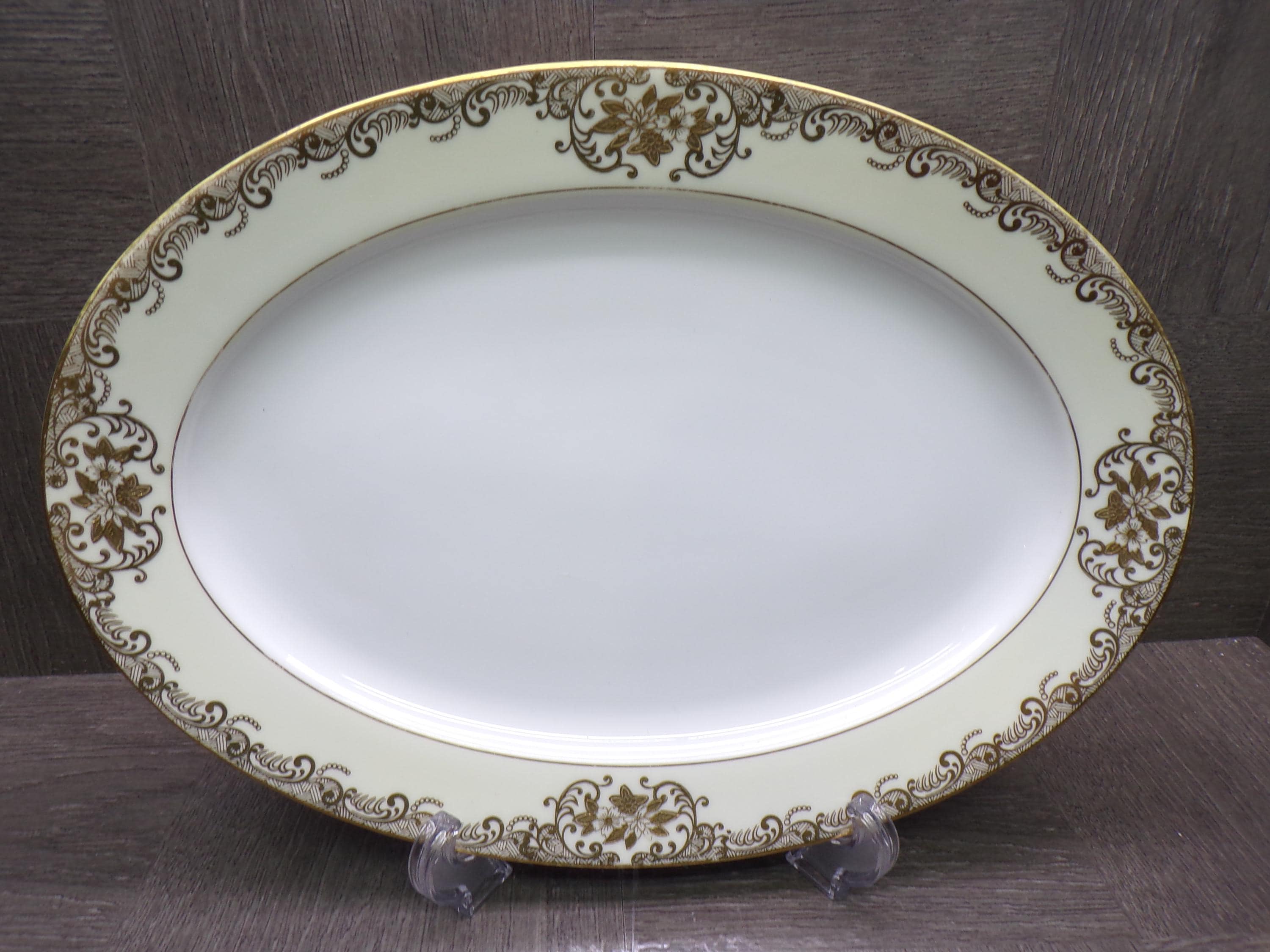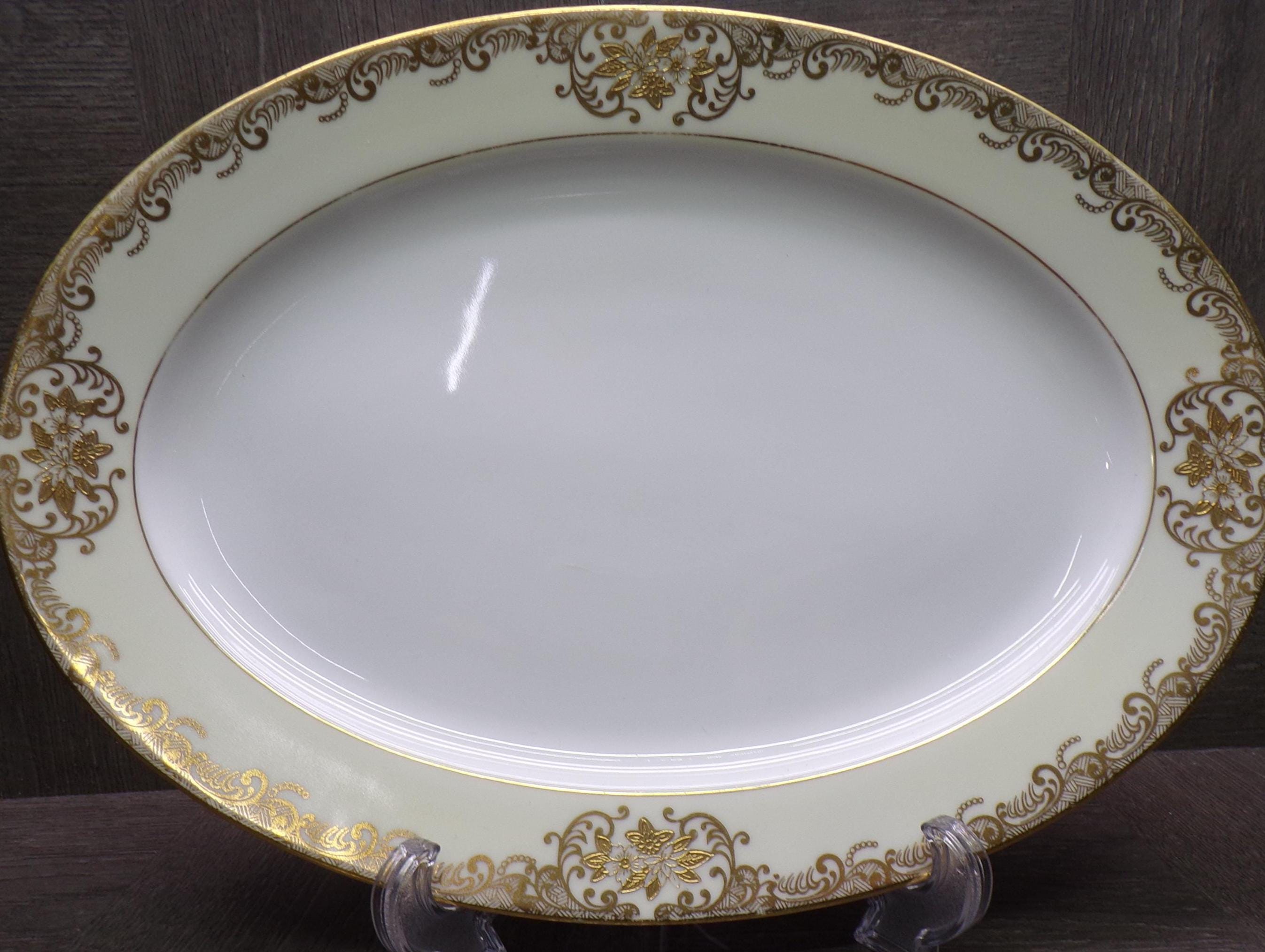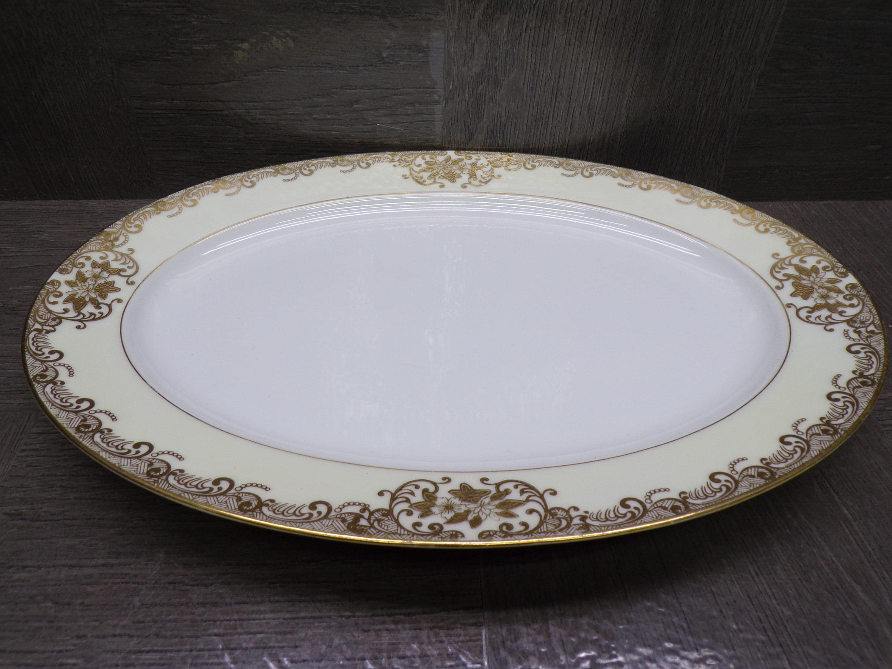 2603 Meito Vintage 1936 Hand-painted China 12.25" x 8.75" Oval Platter White Center 22 kt Gold Flowers & Scrolls w/ Cream Rim Made in Japan - Great Condition Little Wear