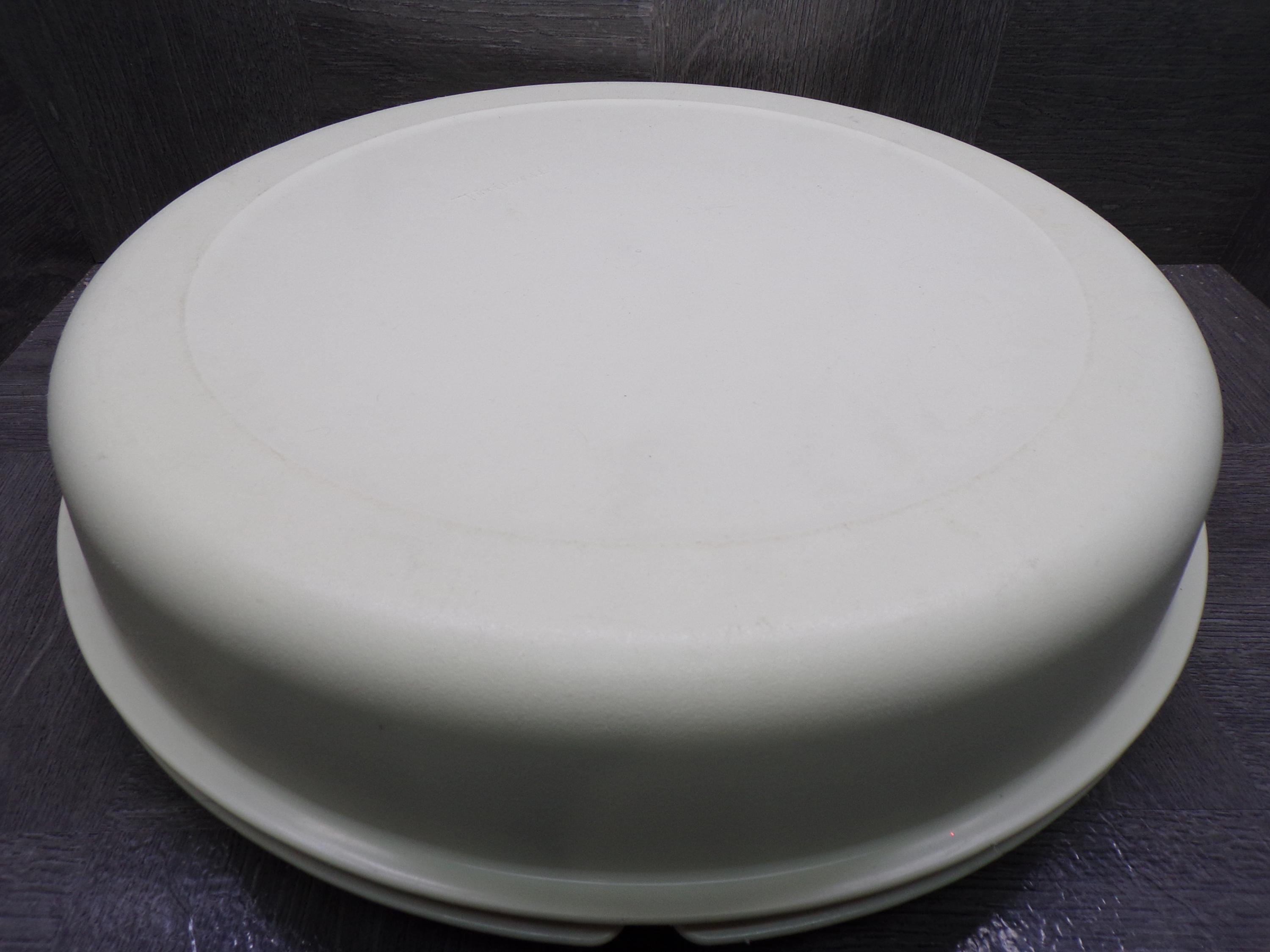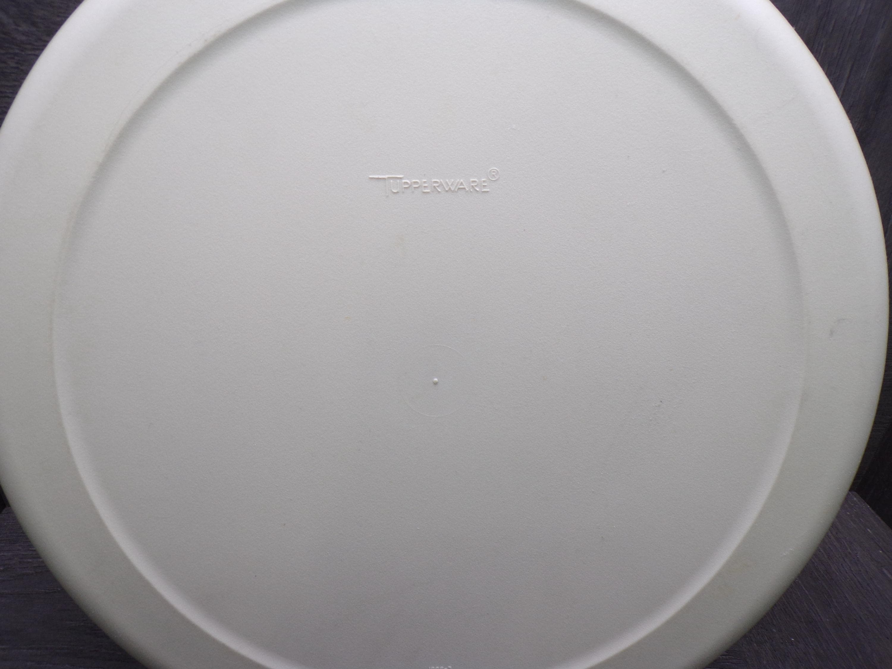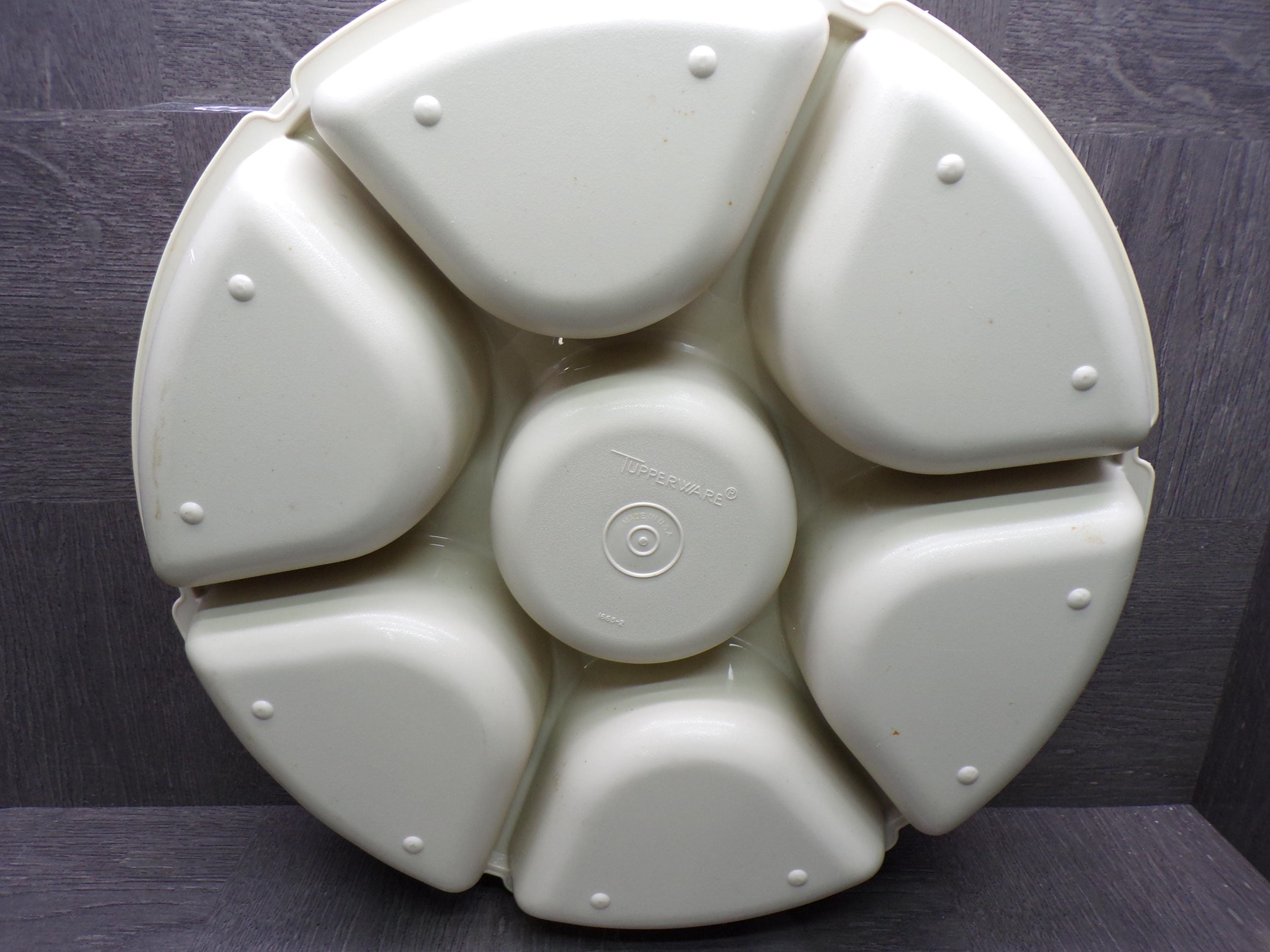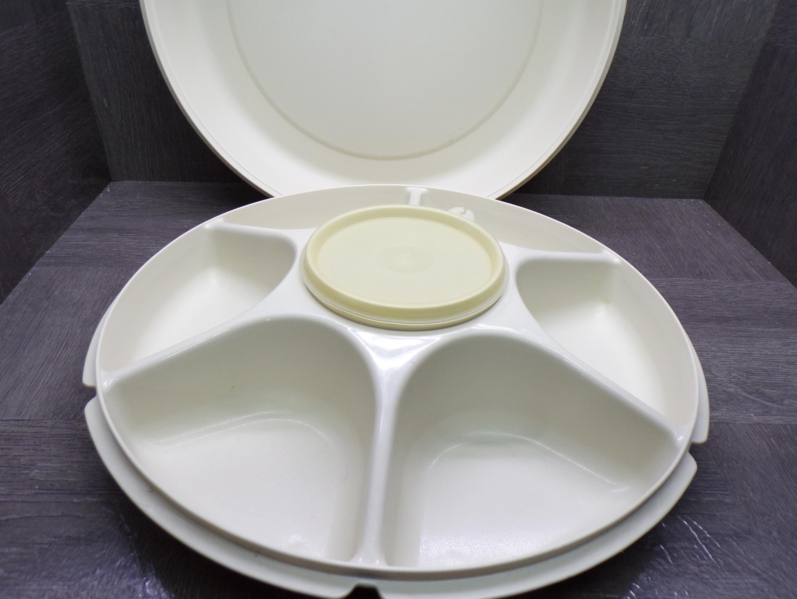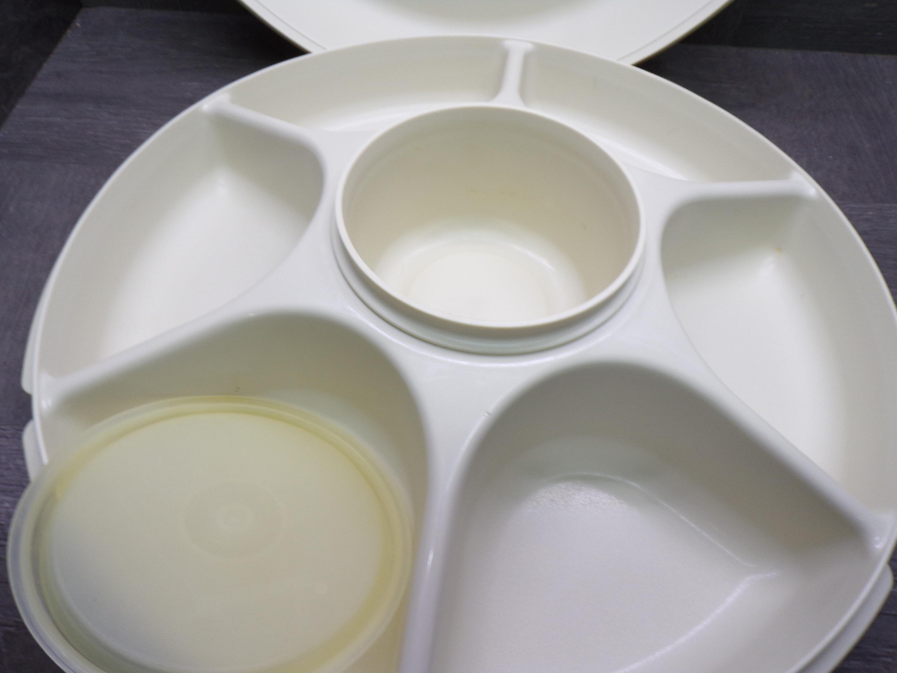 2603 Tupperware Vintage 4 pc Set Almond Divided Vegetable Transporter, Keeper, Tray with Dip Bowl 2 Lids - Good Cond. Some Wear & Scratches