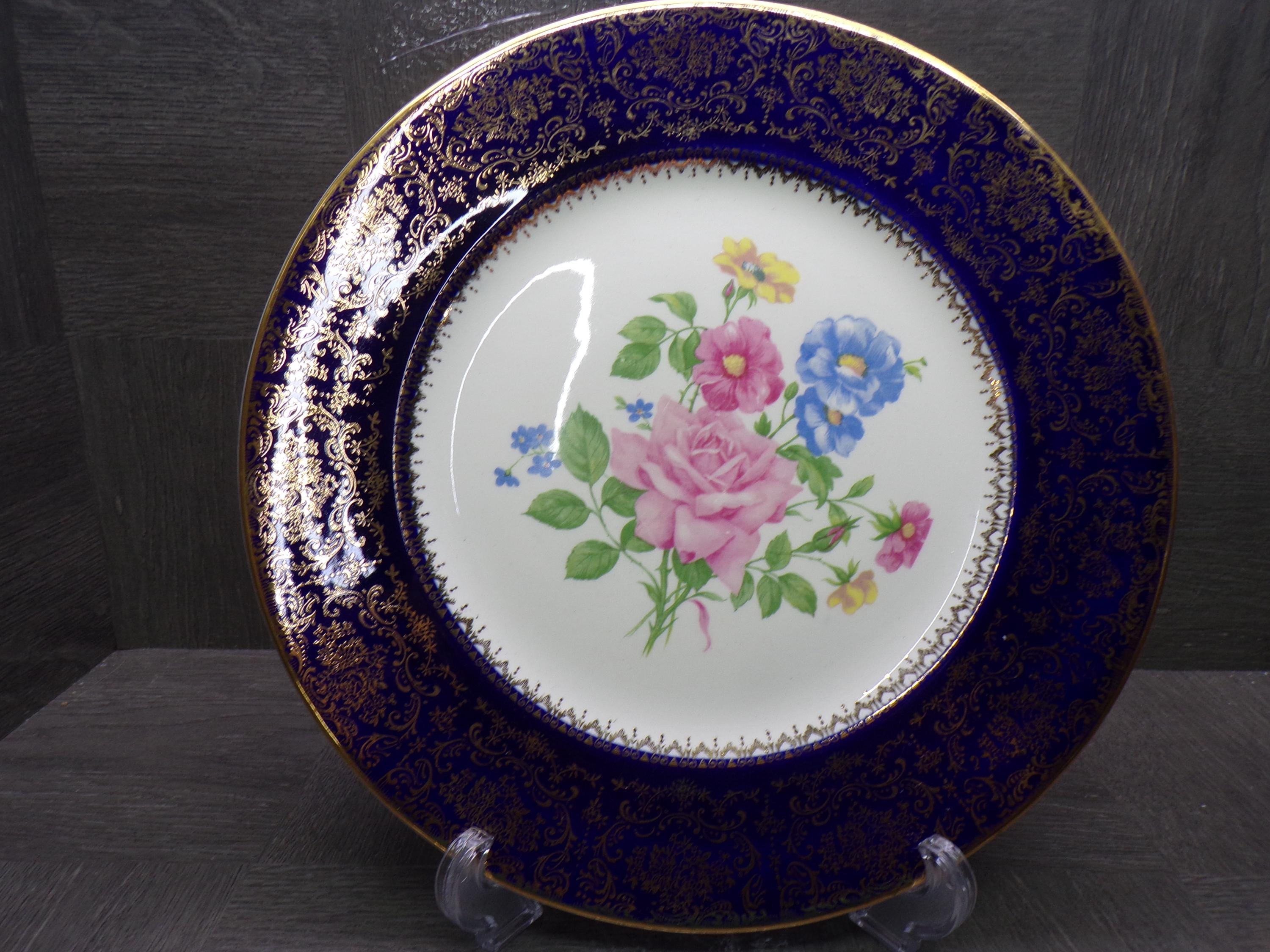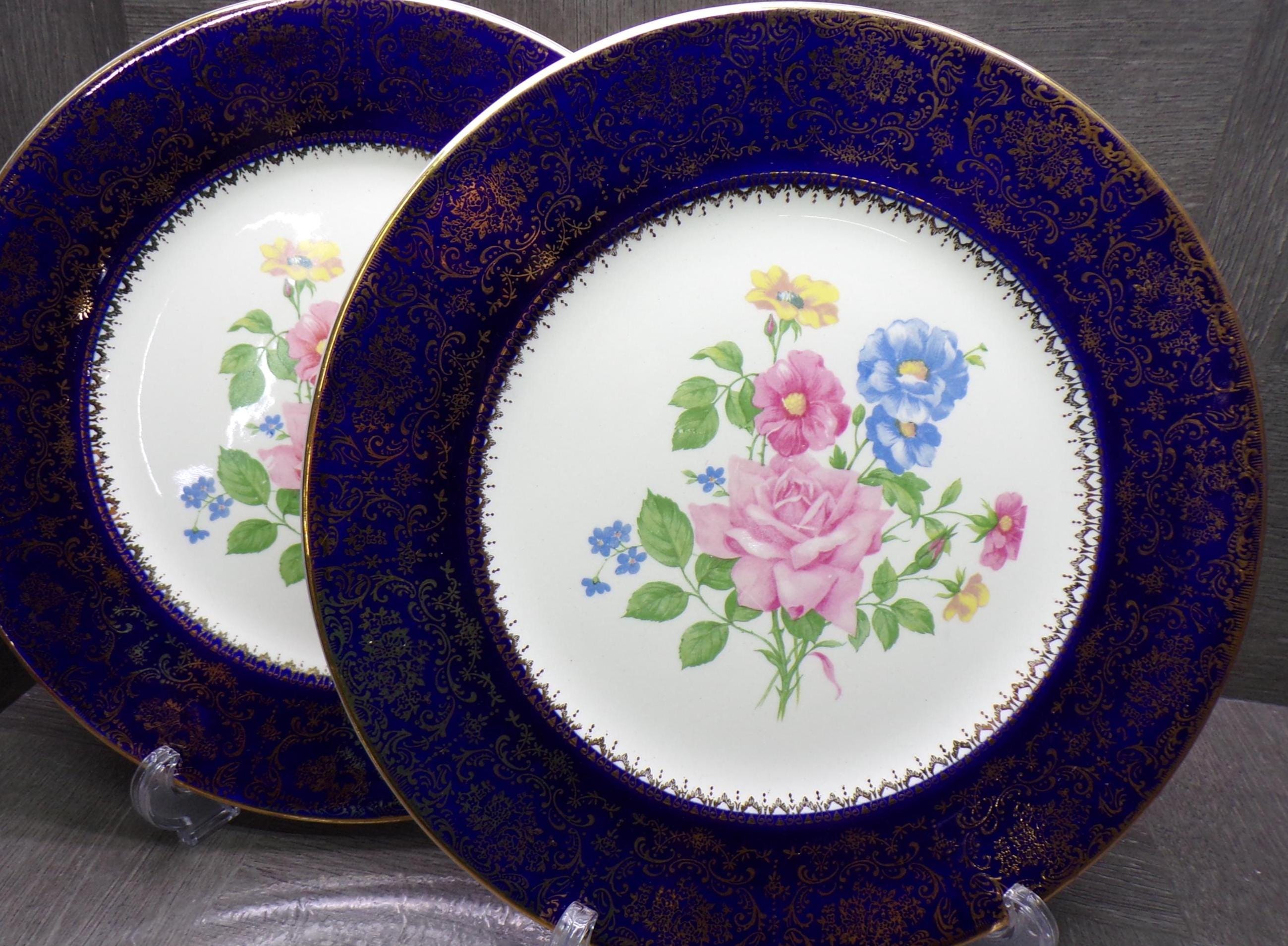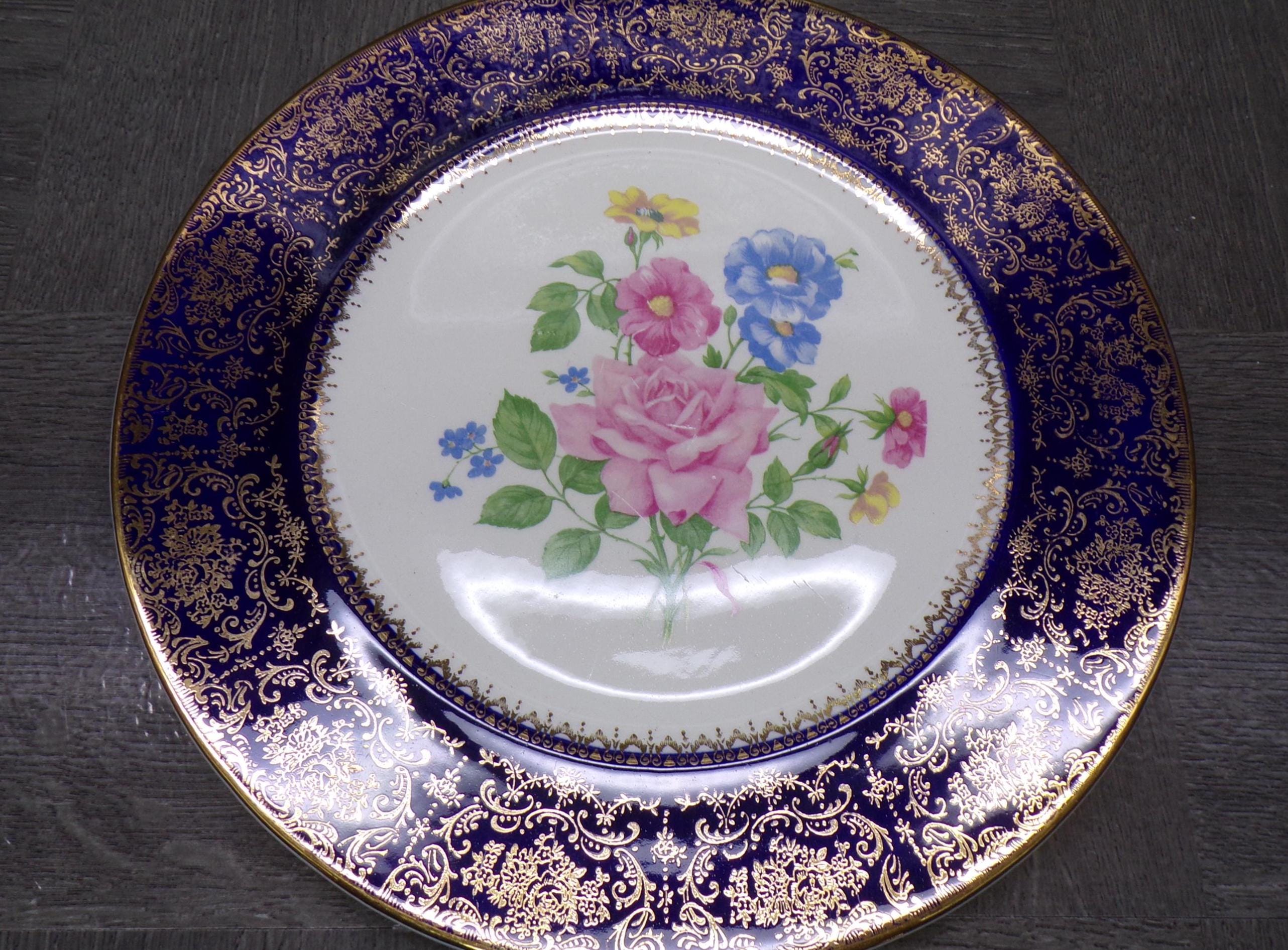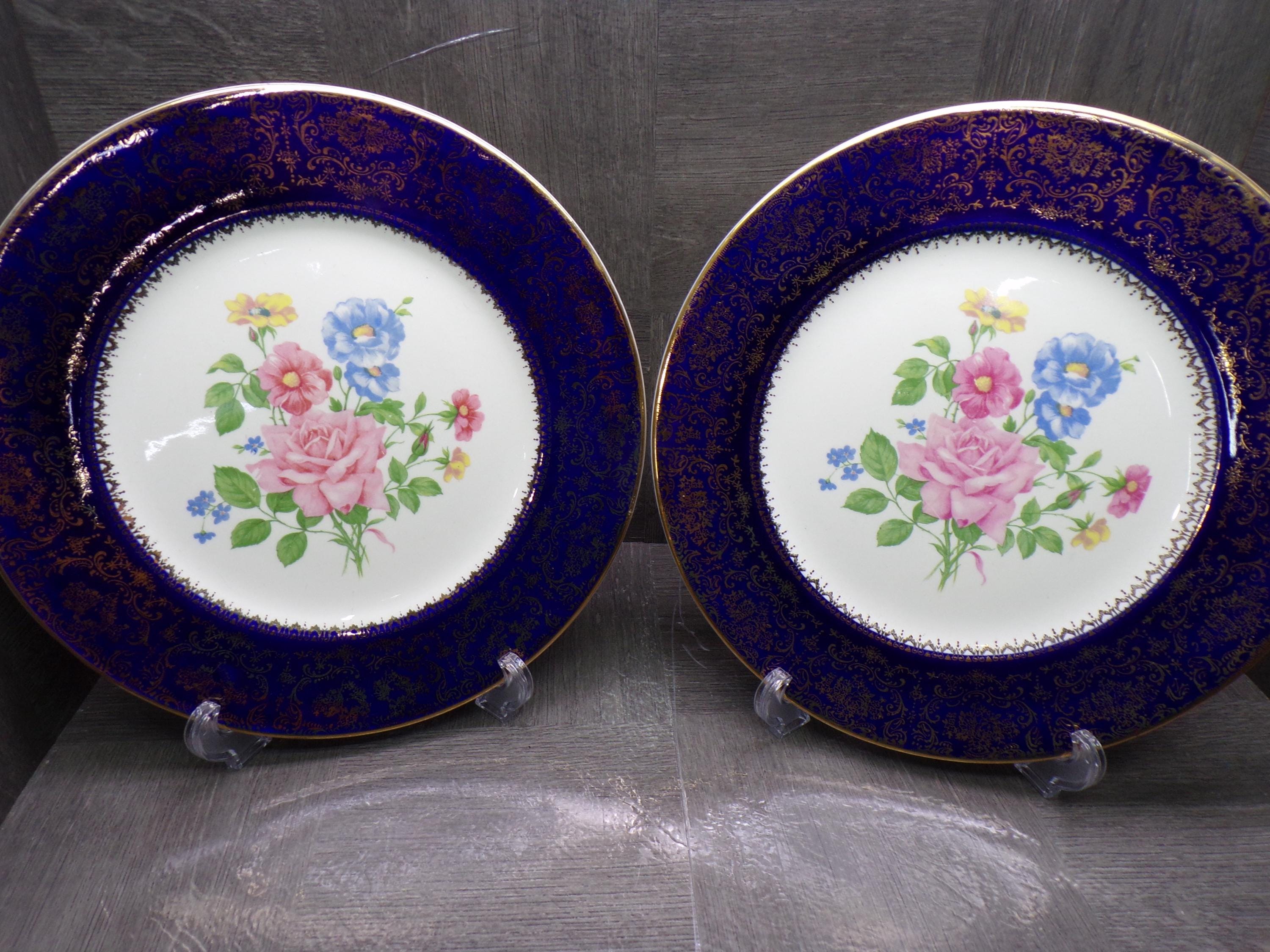 2603 Salem China Set of 2 Aristocrat 10.5" Cobalt Blue Vintage Service Plates 23 Karat Gold Accents Made in USA - Good Cond. Light Scratches