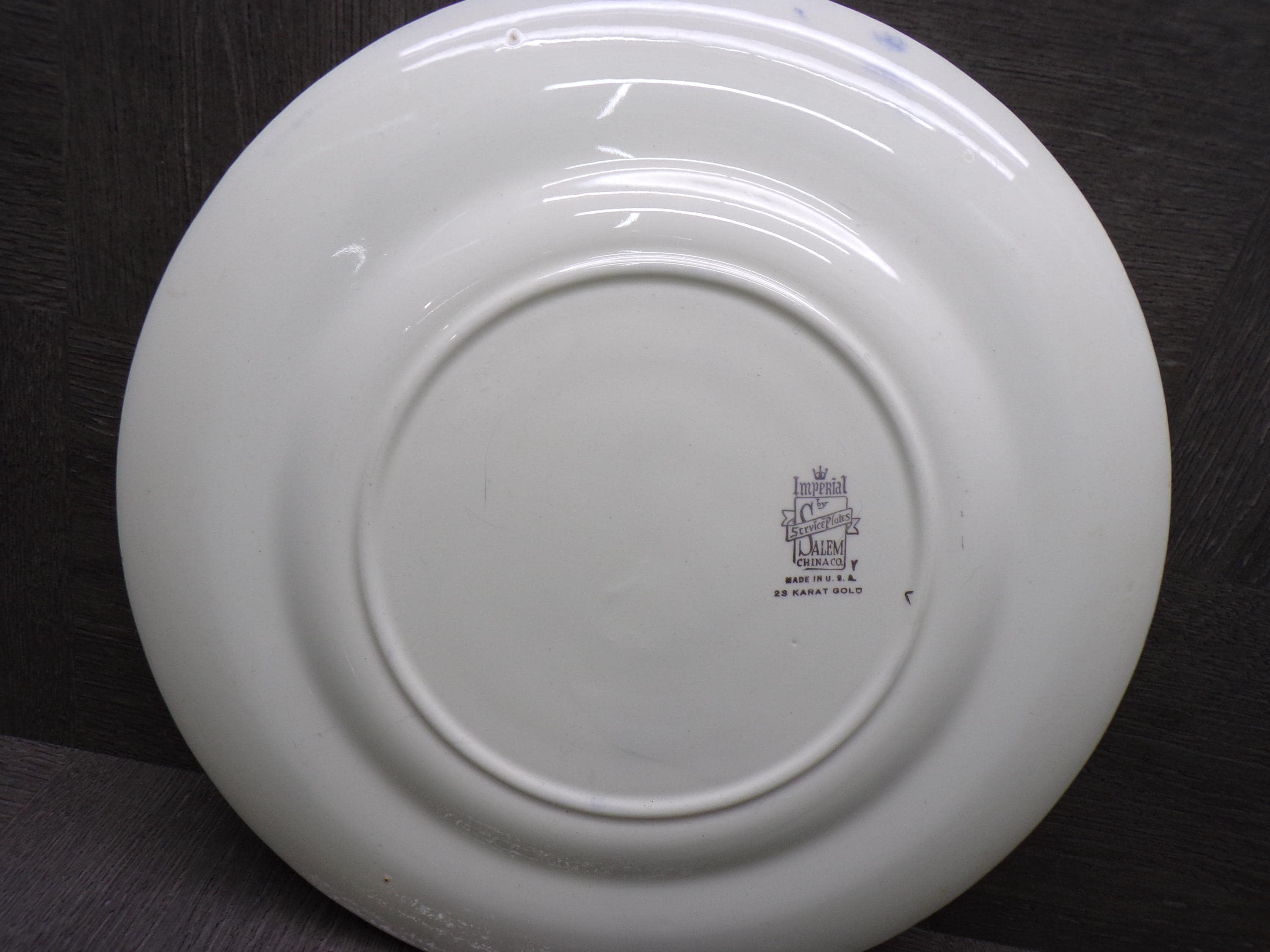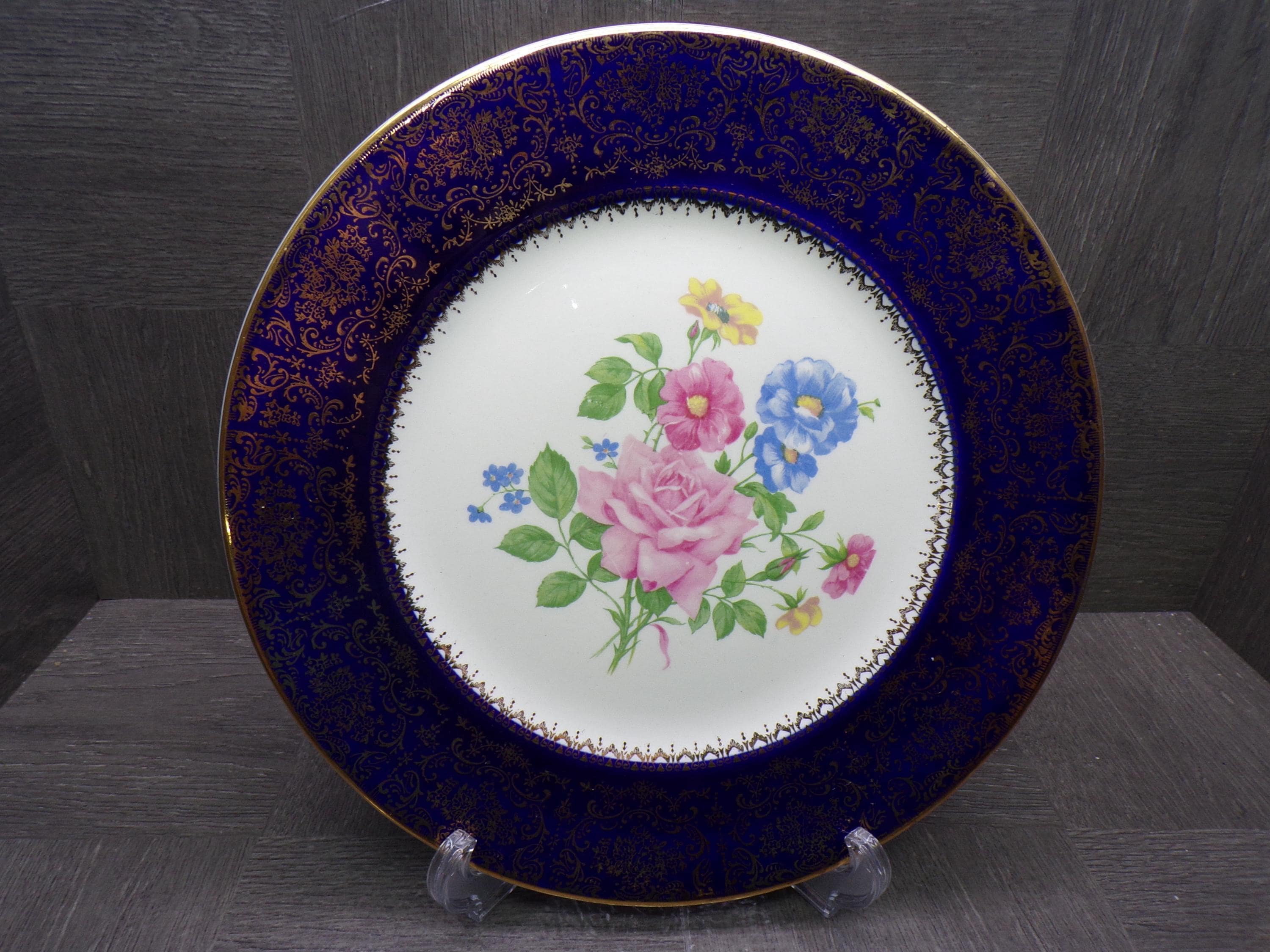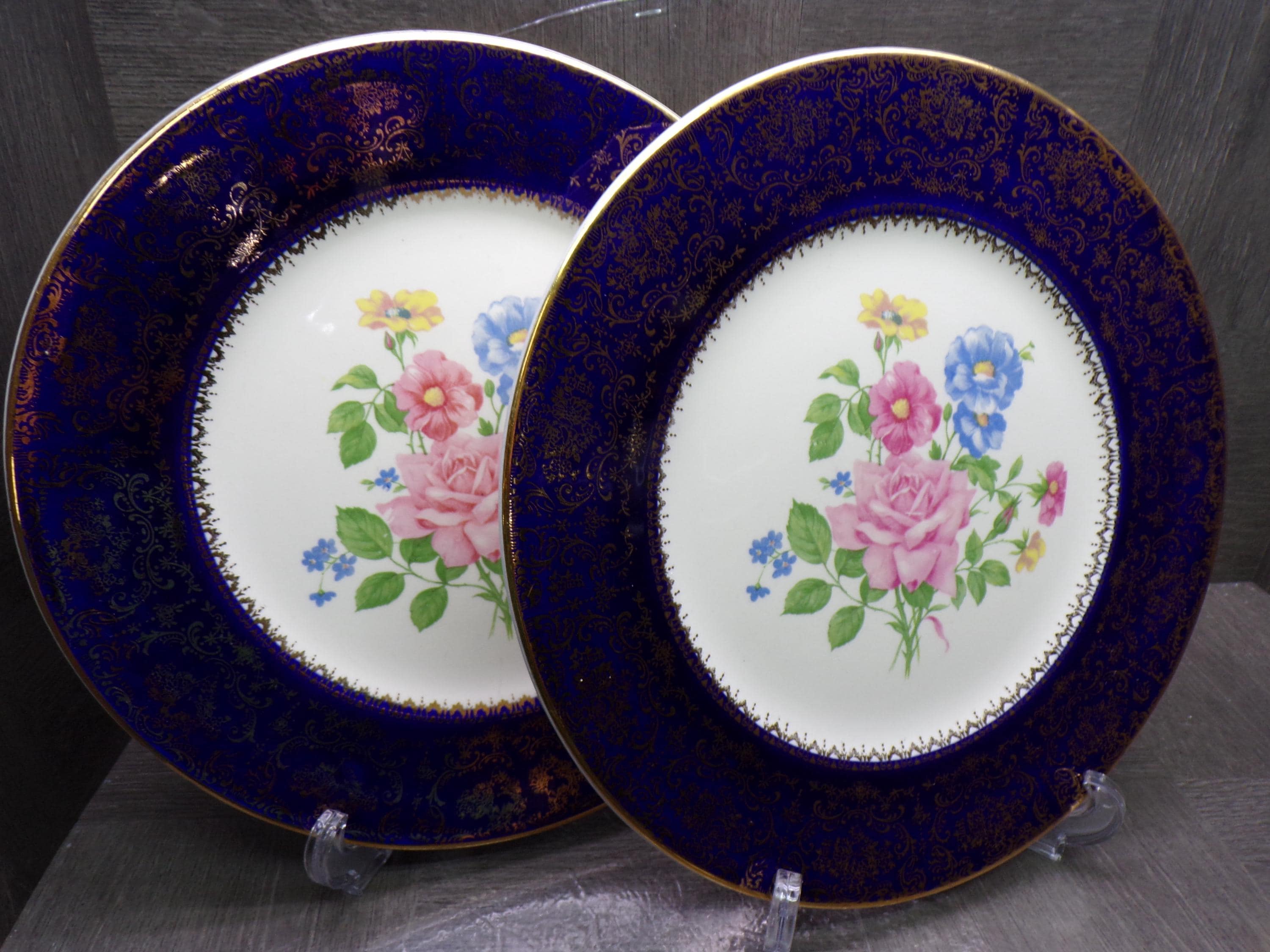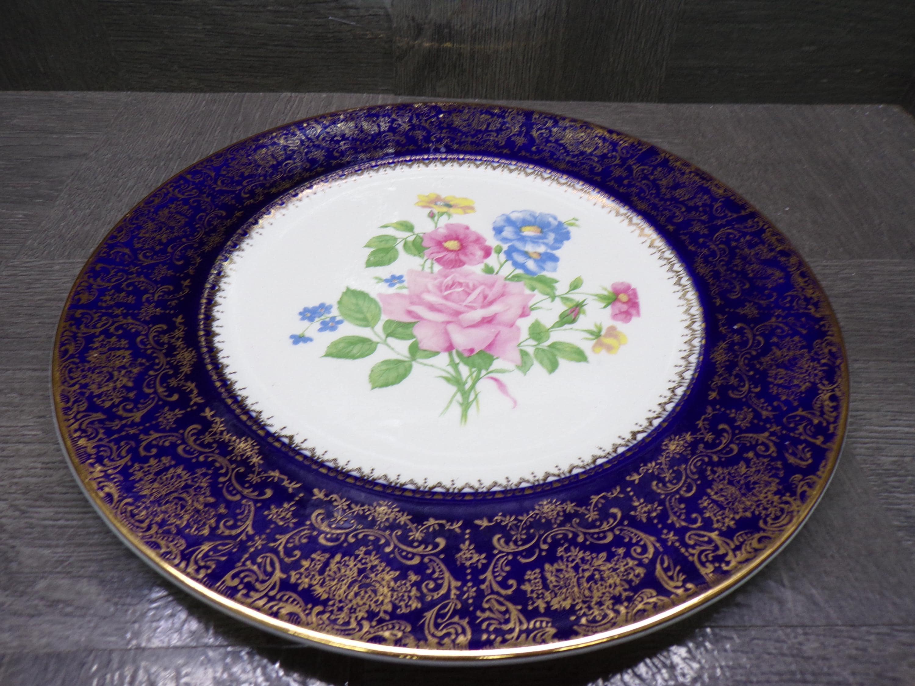 2603 Salem China Set of 2 Aristocrat 10.5" Cobalt Blue Vintage Service Plates 23 Karat Gold Accents Made in USA - Good Cond. Light Scratches