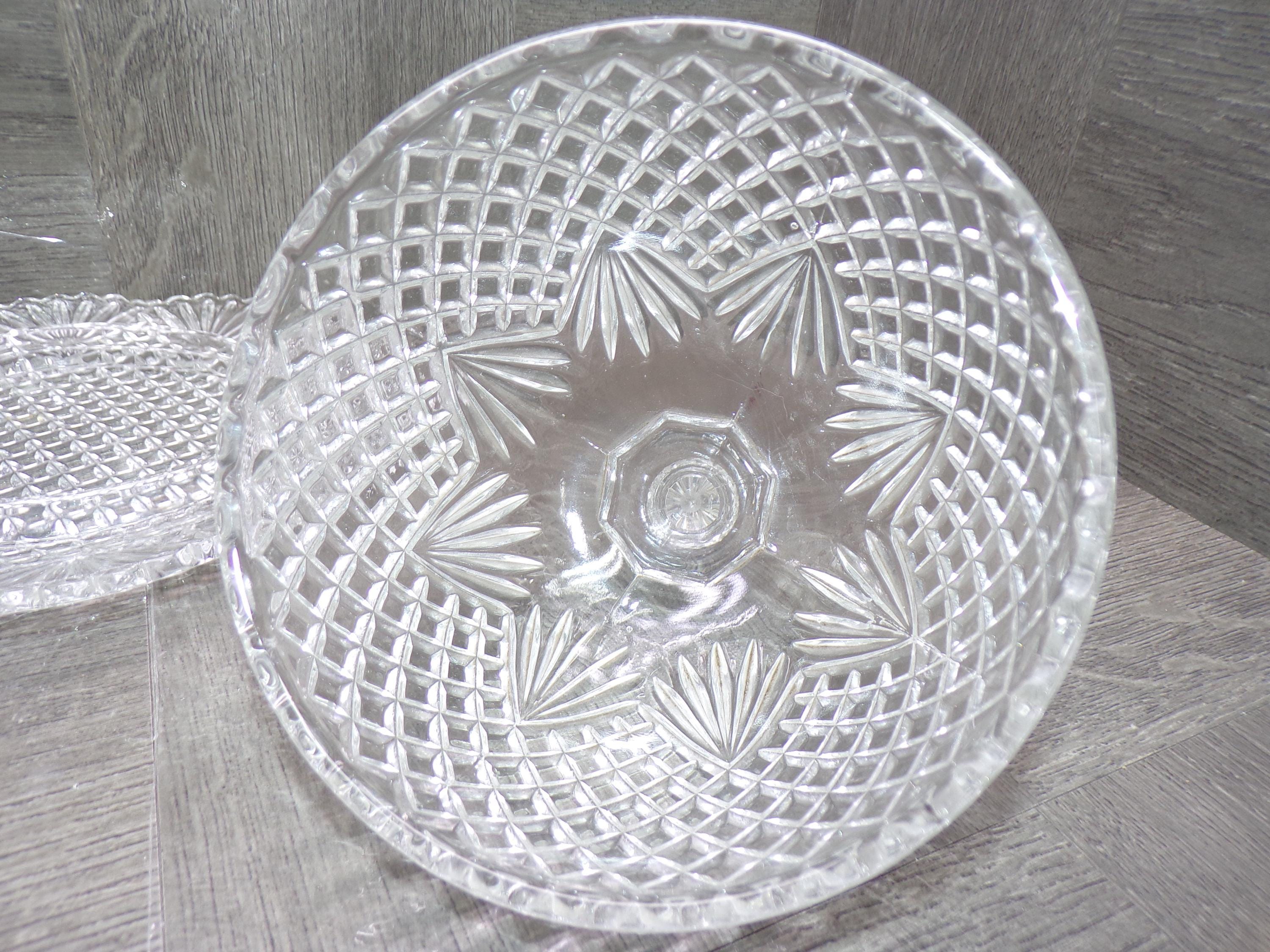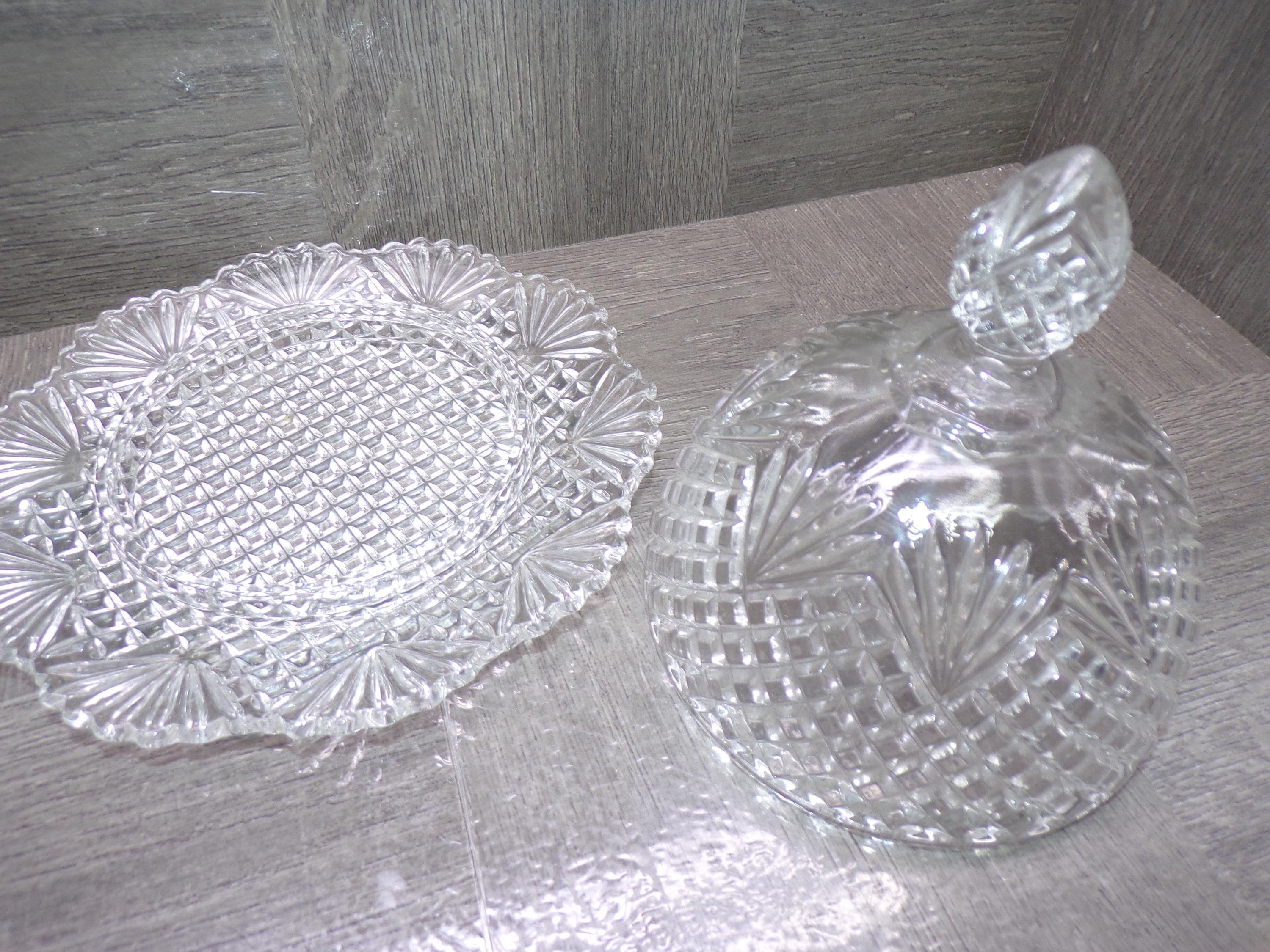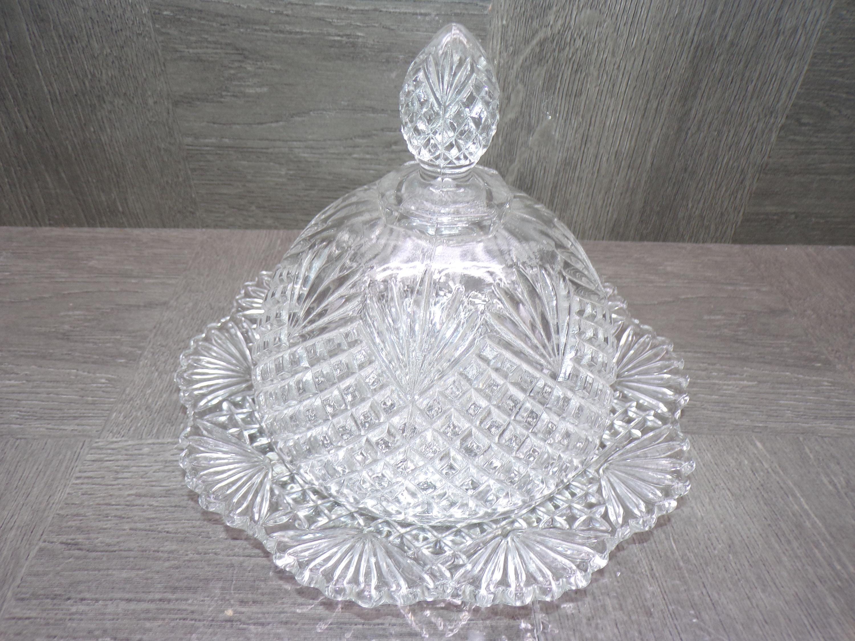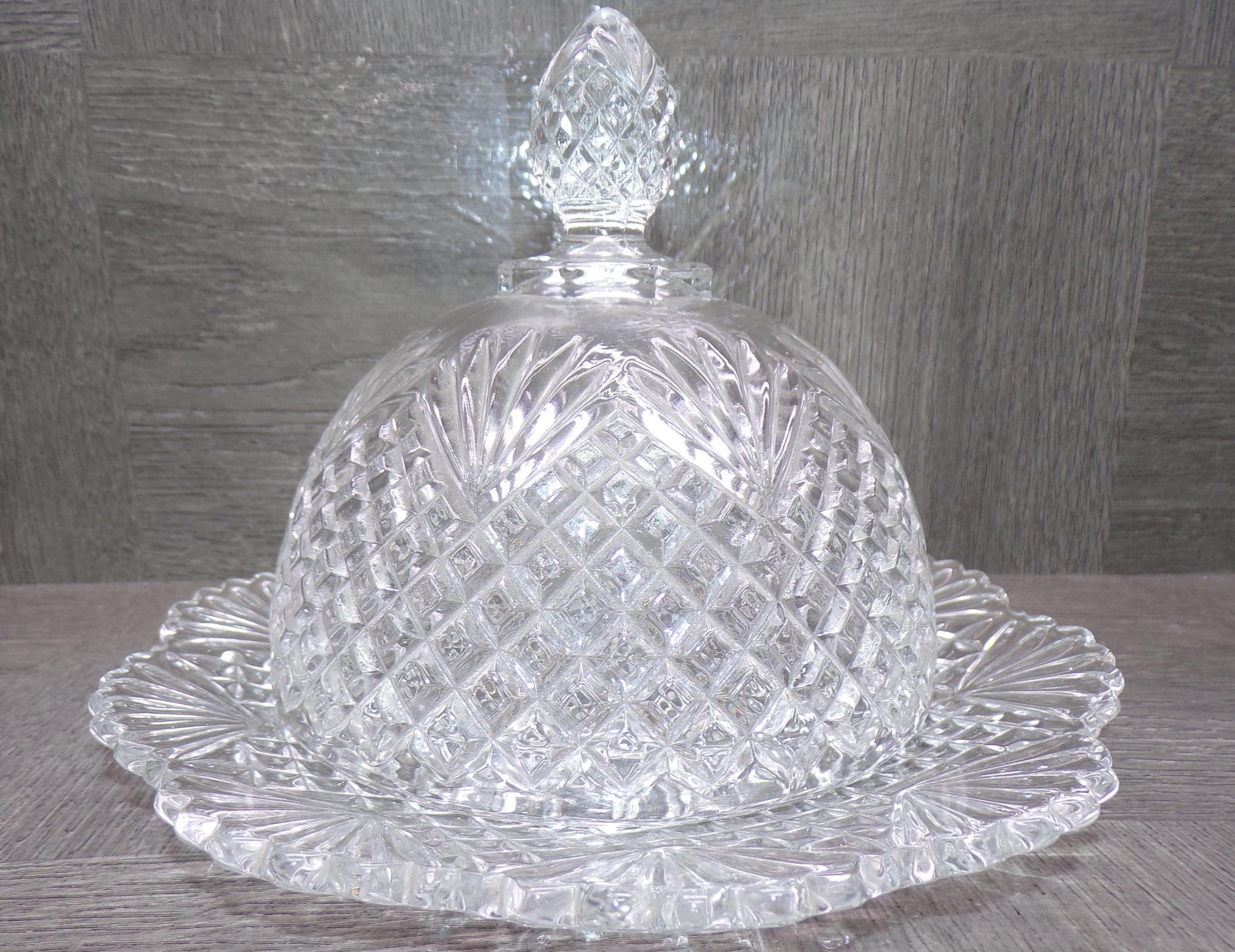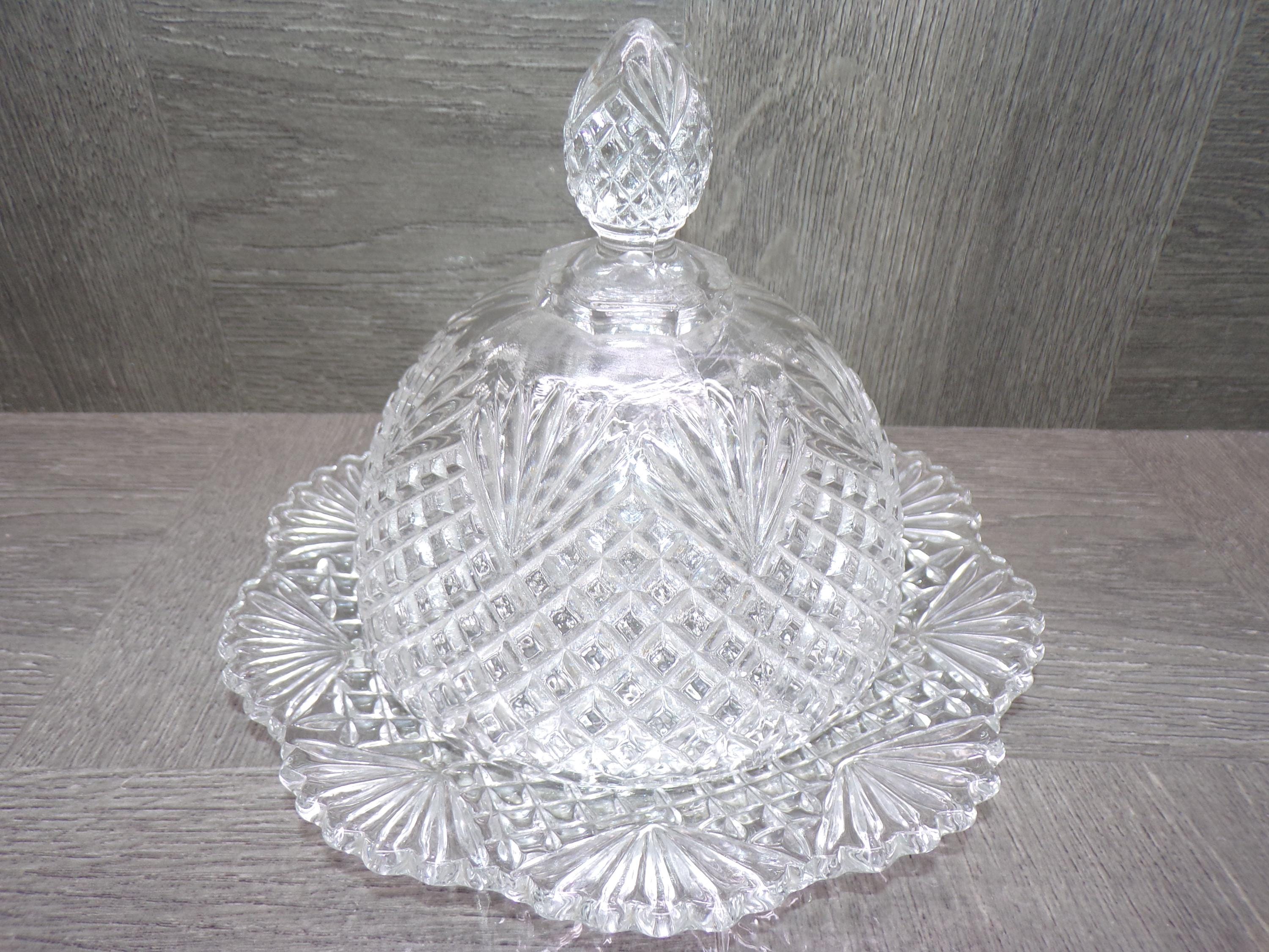 2603 Beautiful Pineapple Fan Pattern Pressed Glass Cheese Cloche / Covered Butter Dish 7.5" Wide x 6" Tall - Great Condition