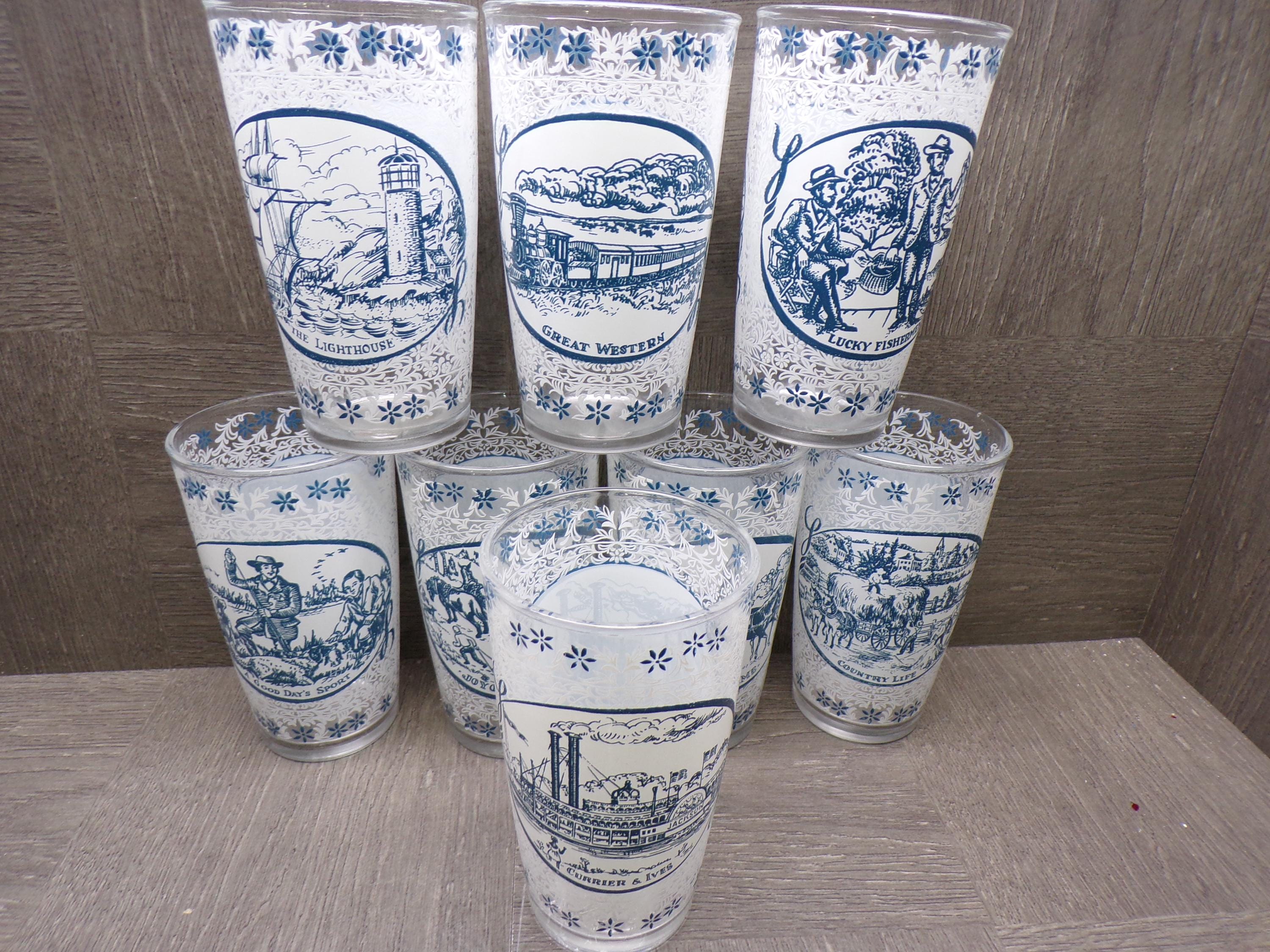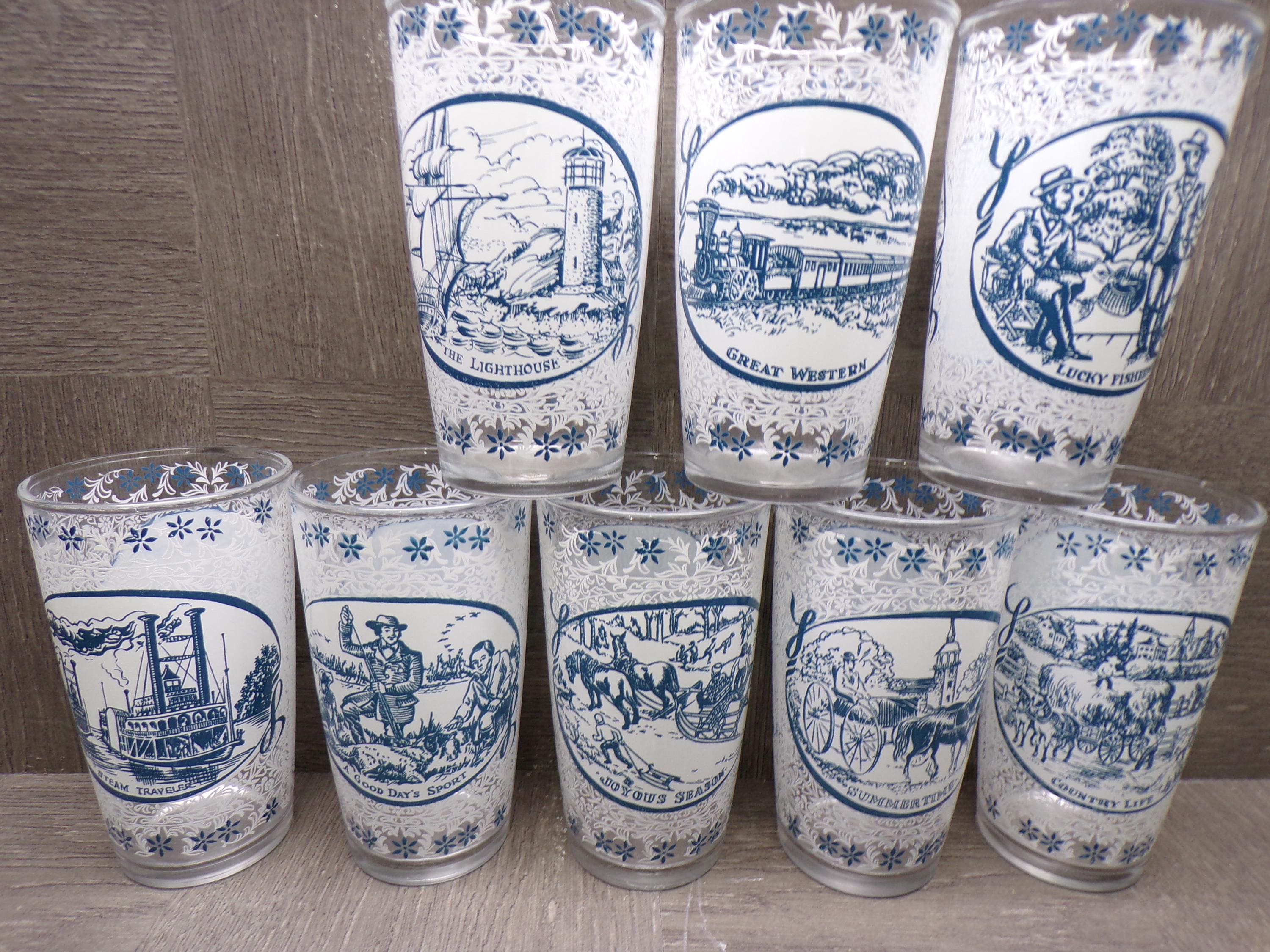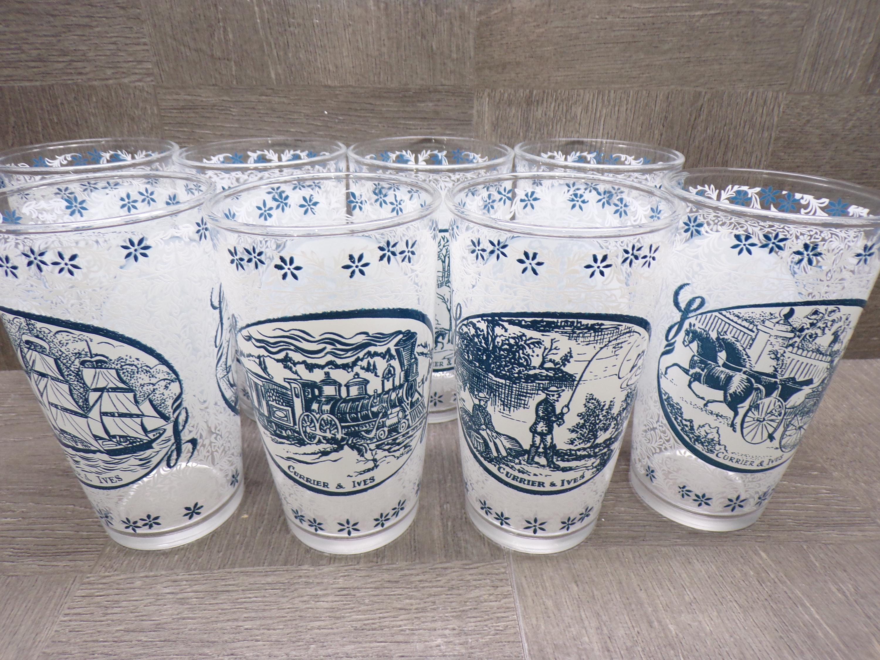 2603 Royal China Currier & Ives Vintage 5" 10 oz White and Blue Tumbler Drinking Glasses Set of 8 Different Scenes - Excellent Condition