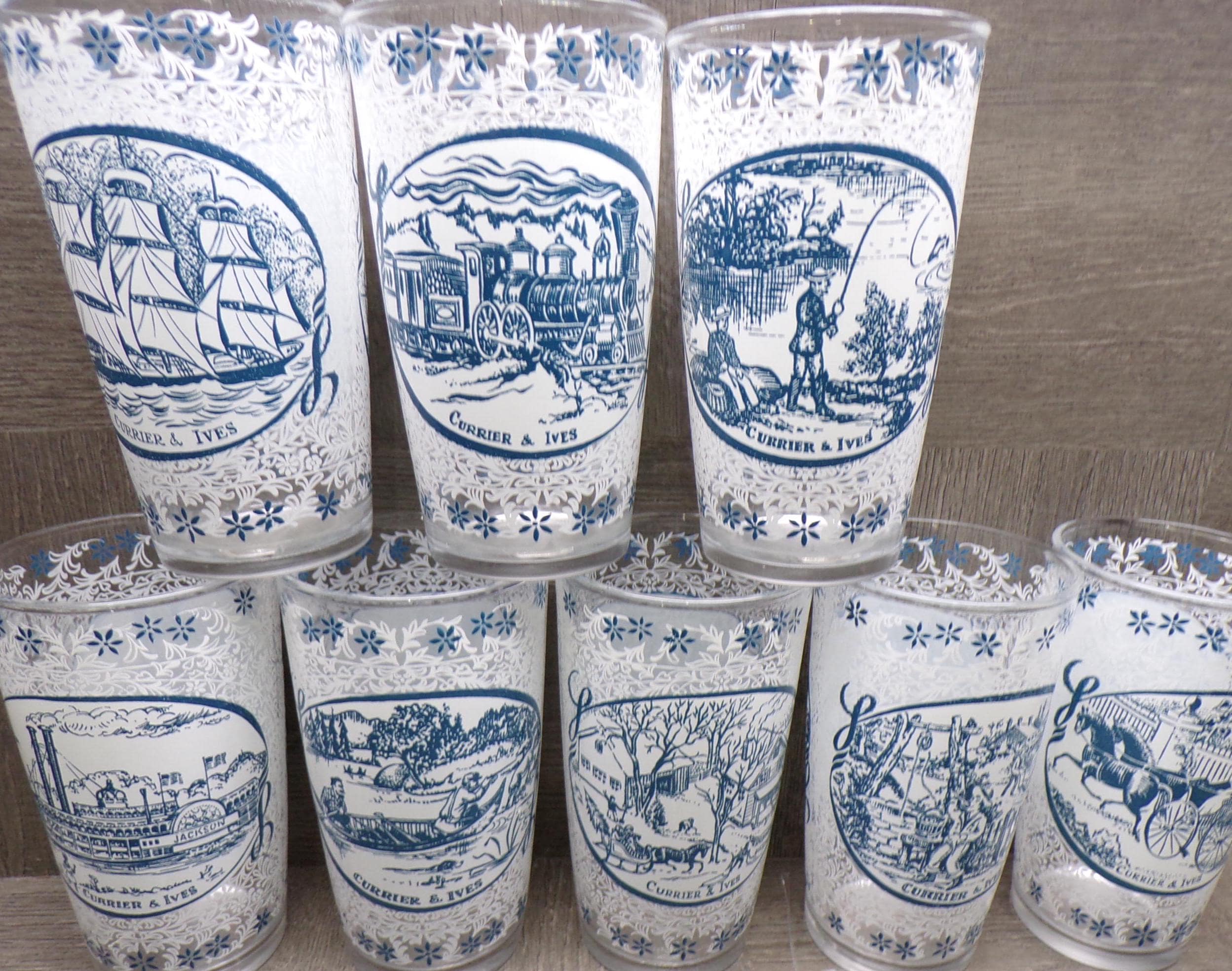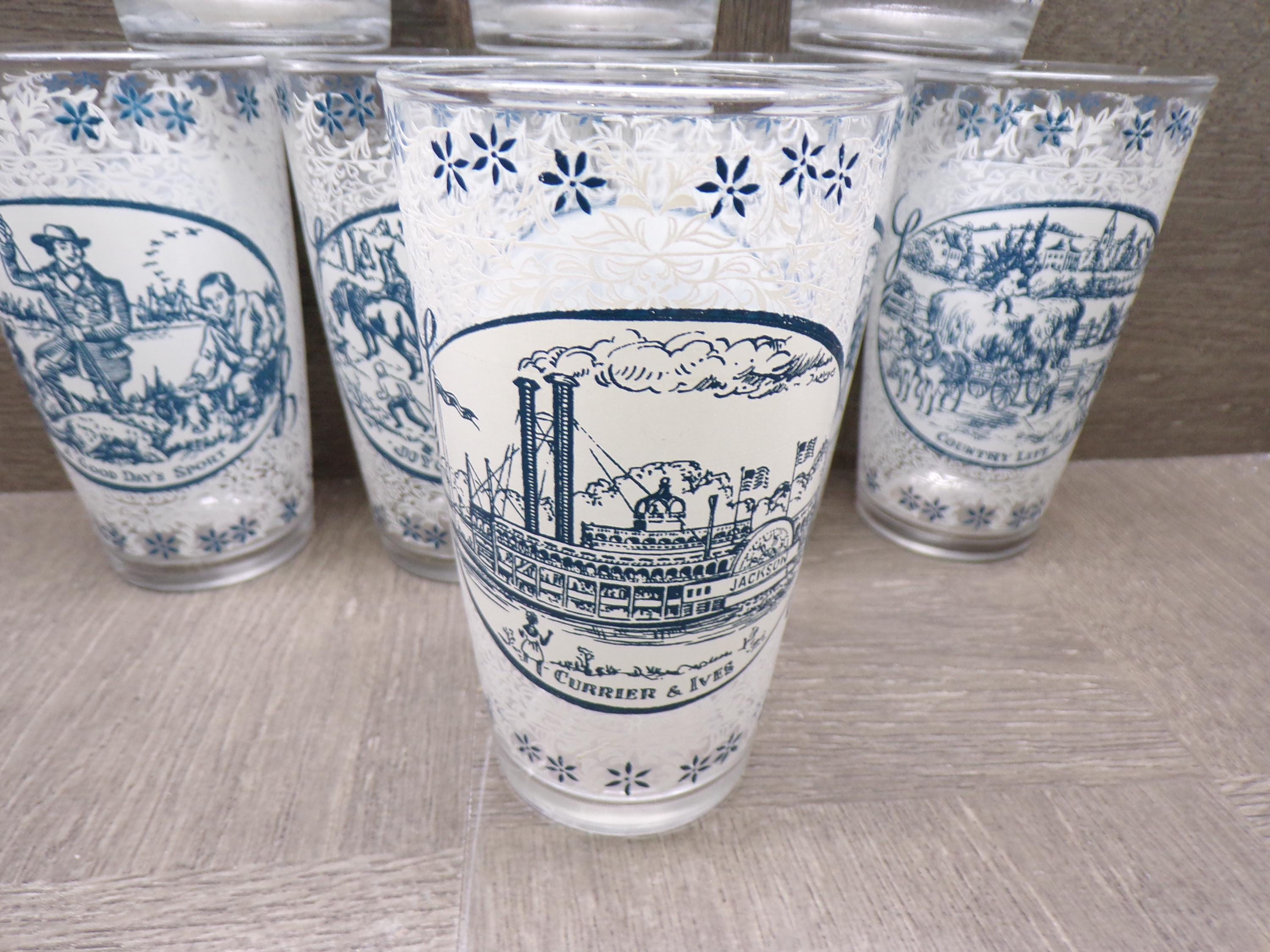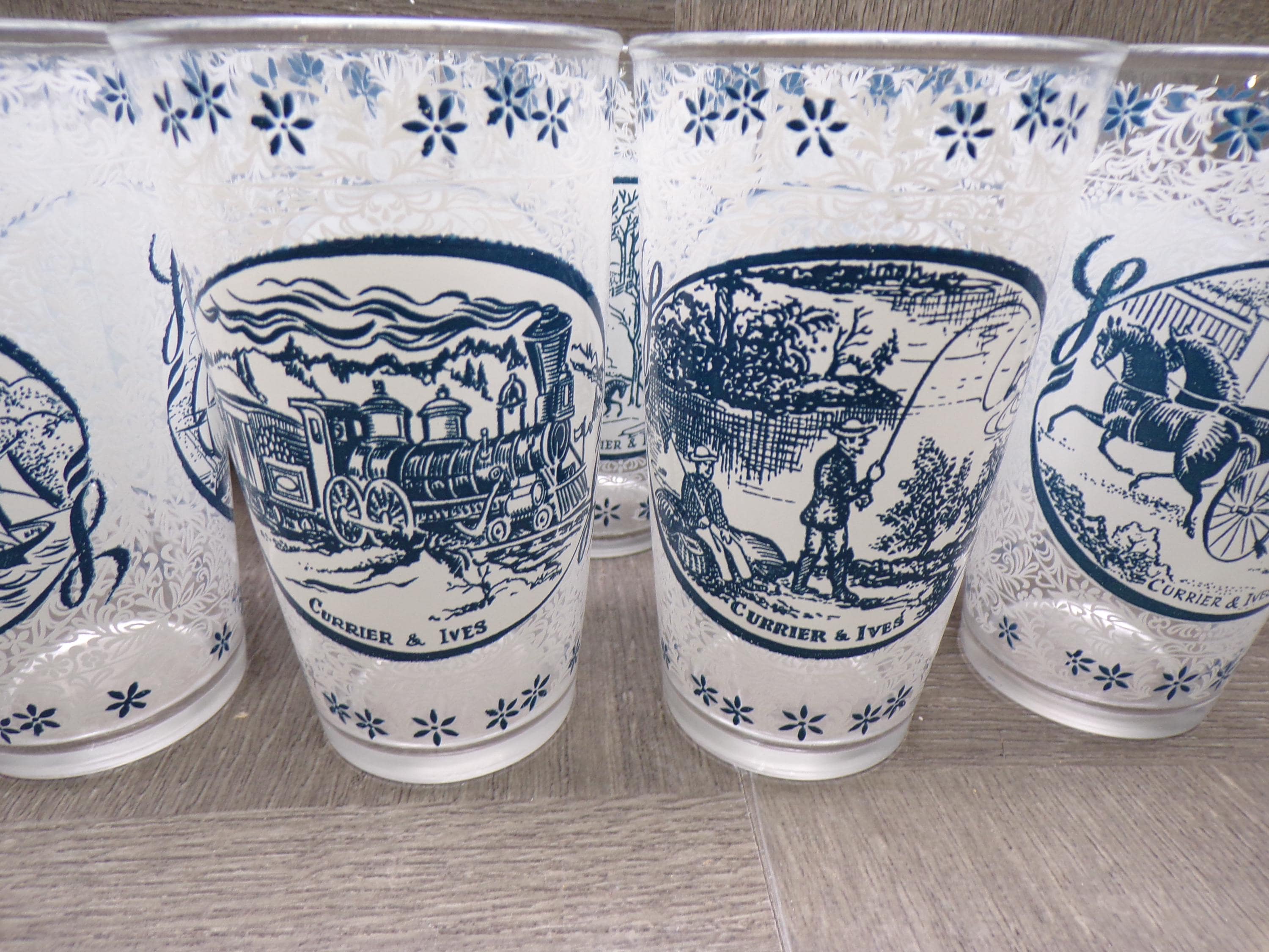 2603 Royal China Currier & Ives Vintage 5" 10 oz White and Blue Tumbler Drinking Glasses Set of 8 Different Scenes - Excellent Condition