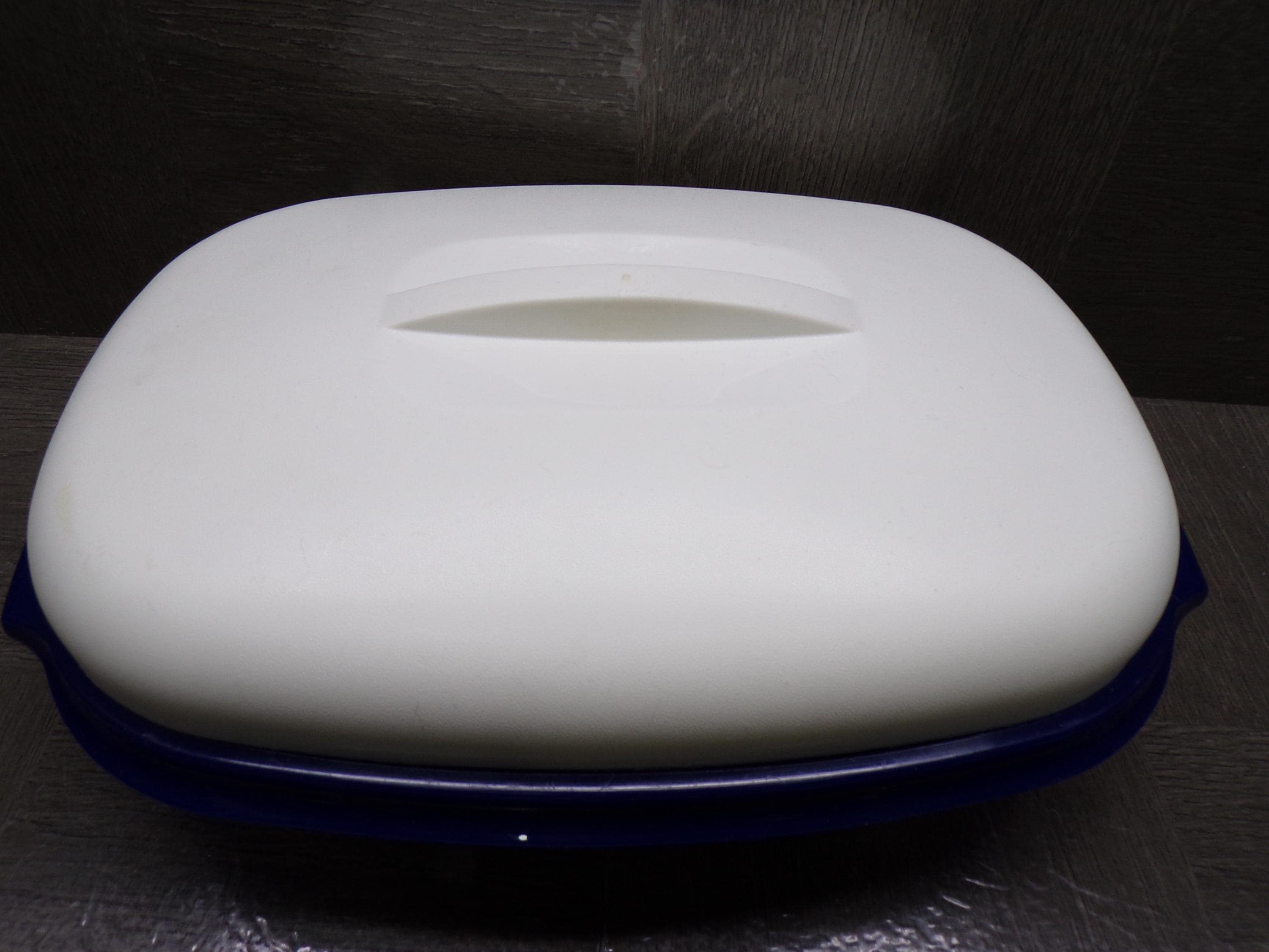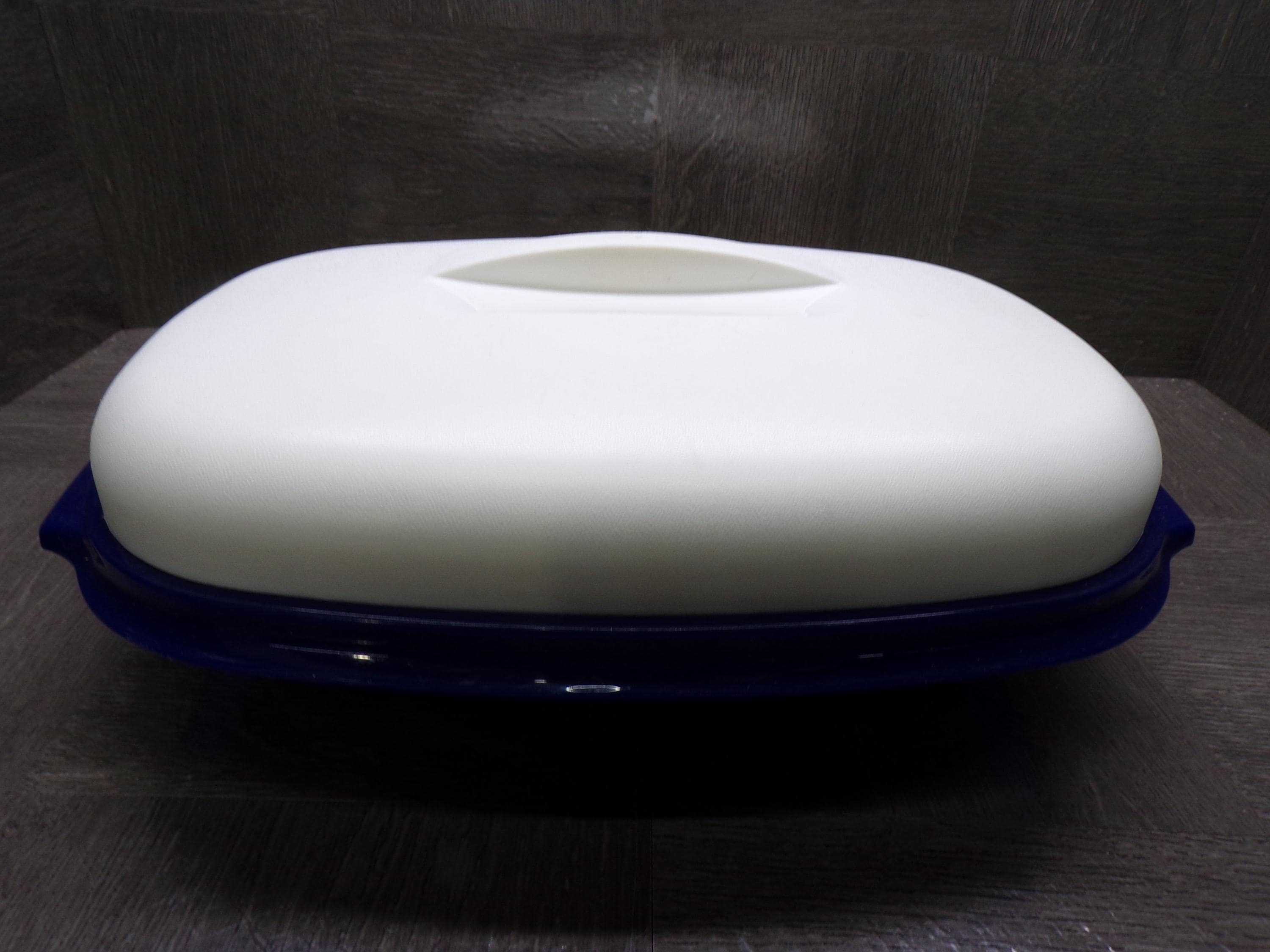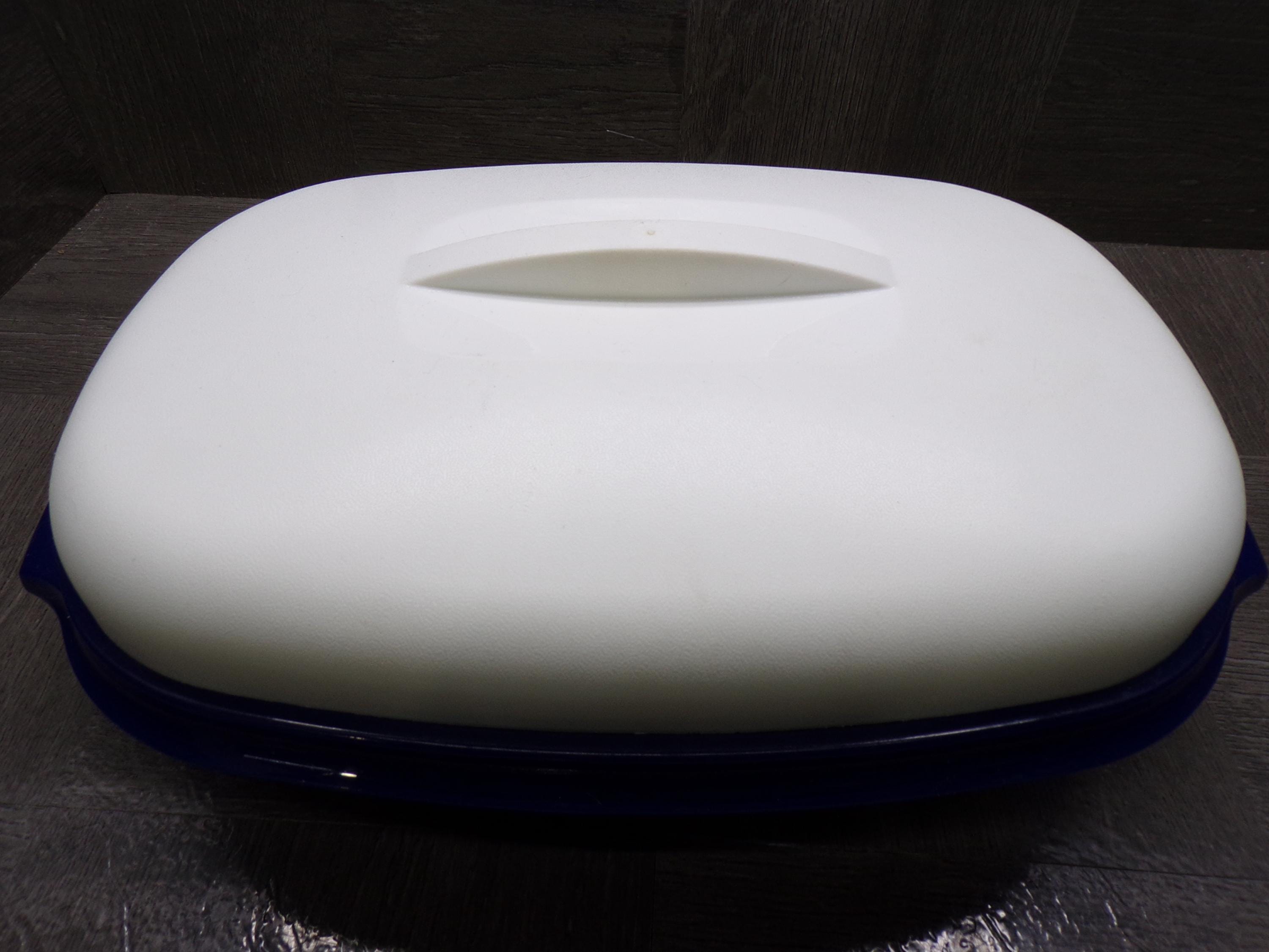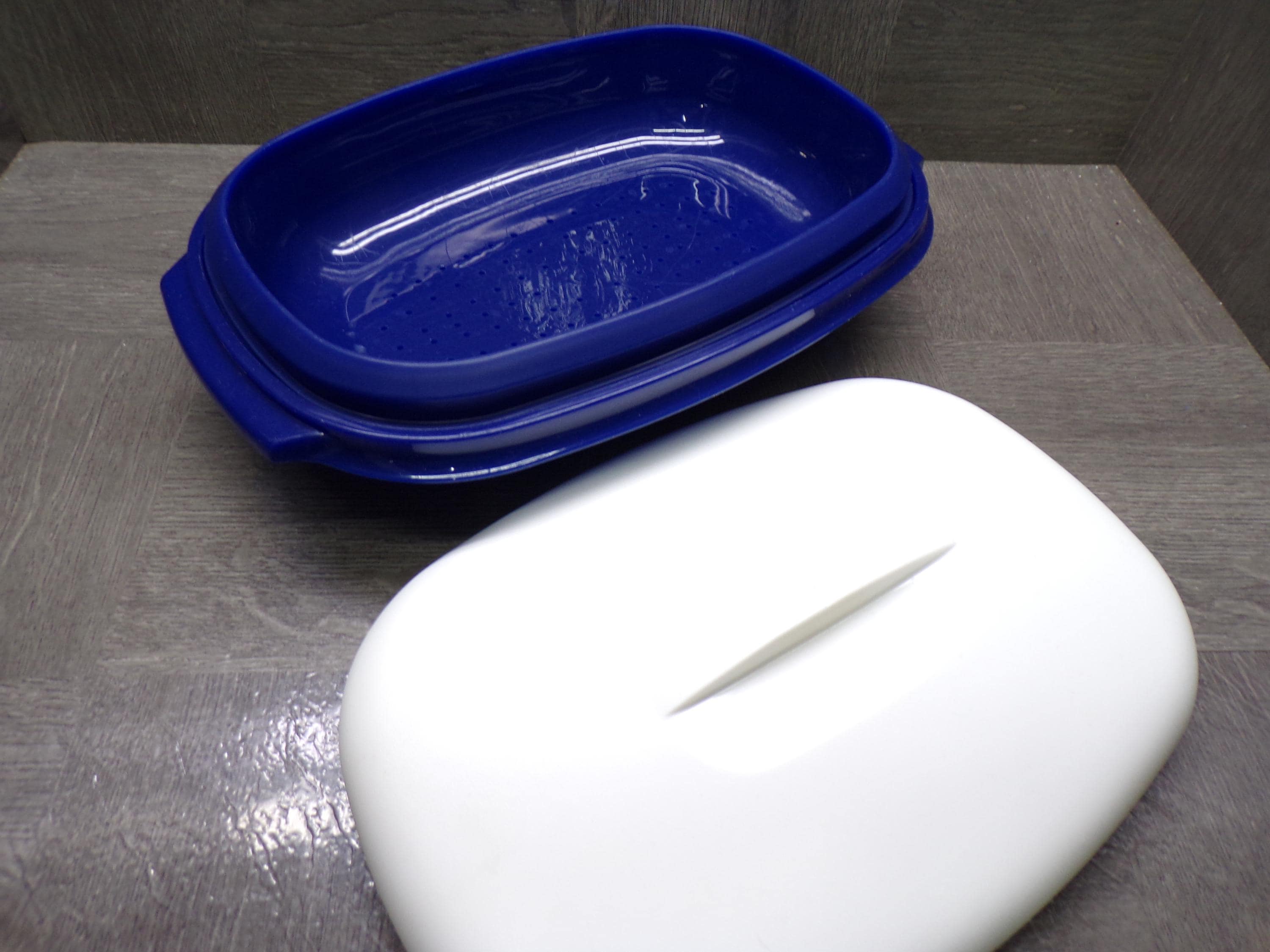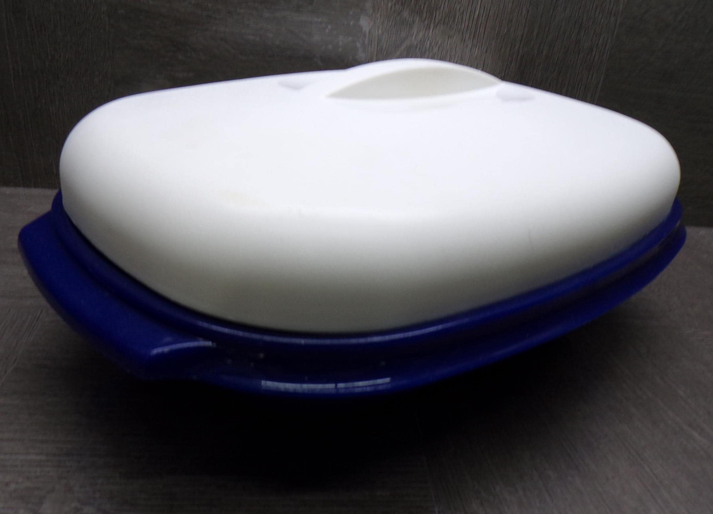 2603 Tupperware Microwave Steamer 11.5"x 8" Vintage Oval Serving Bowl 3 Pc Dark Blue w/ White Cover - Pretty Good Condition Has Scratches