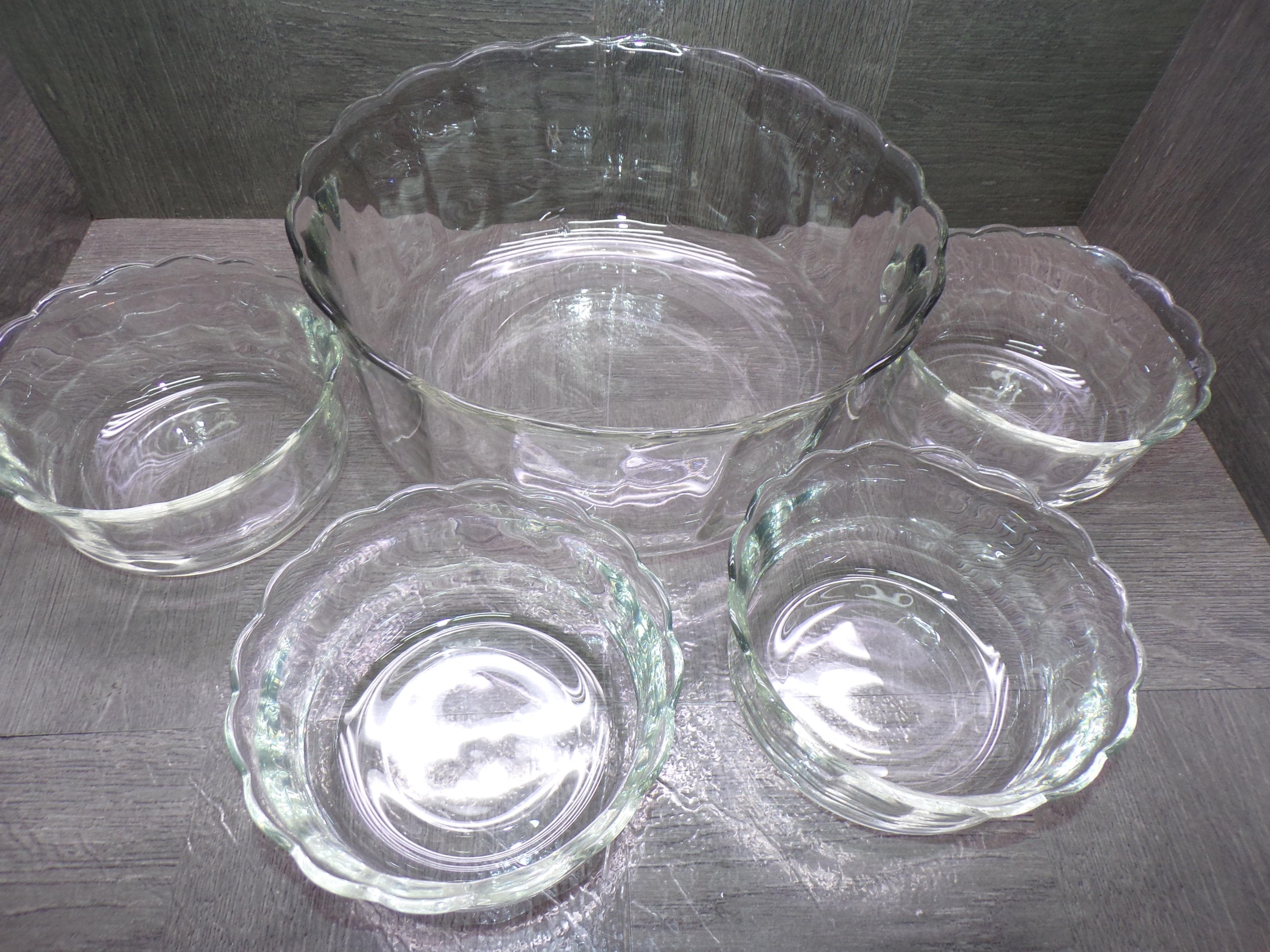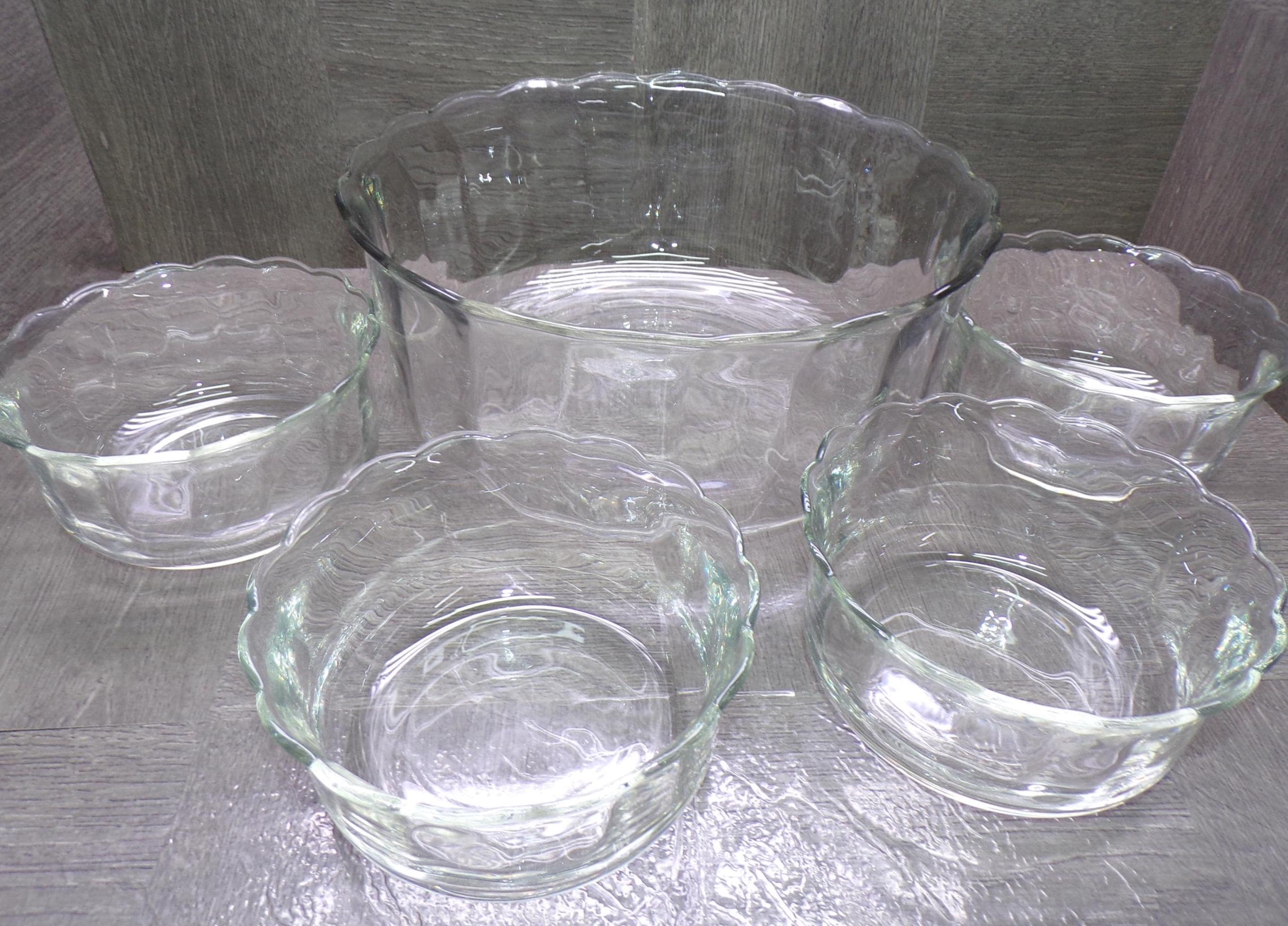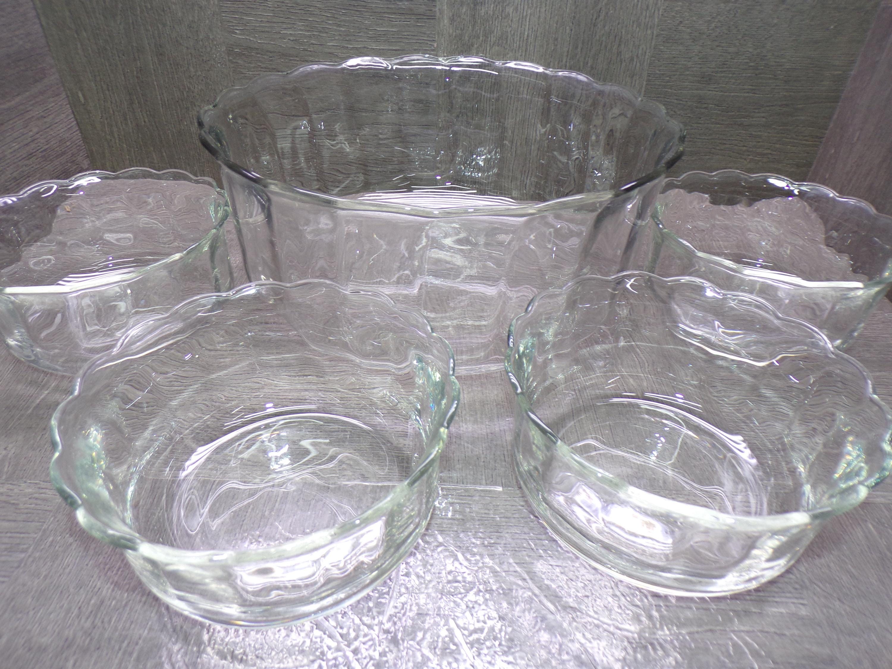 2604 Anchor Hocking Fairfield Clear Paneled Vintage Glass Set of 5 Serving Bowls with Scalloped Edge - One 10" and Four 5.5" - Great Condition